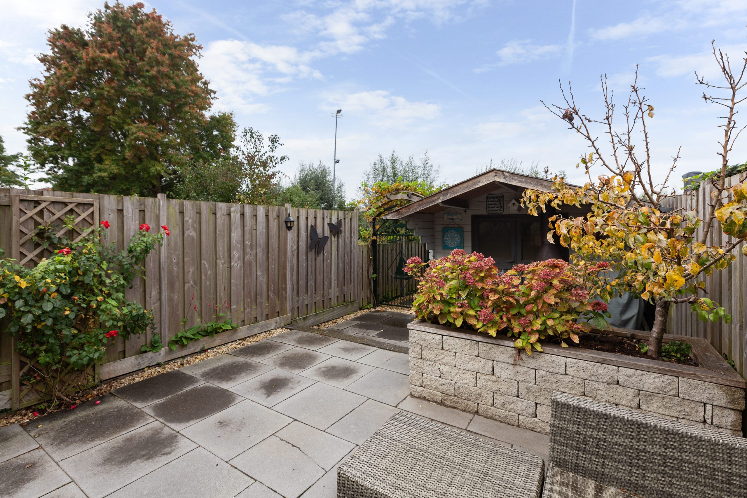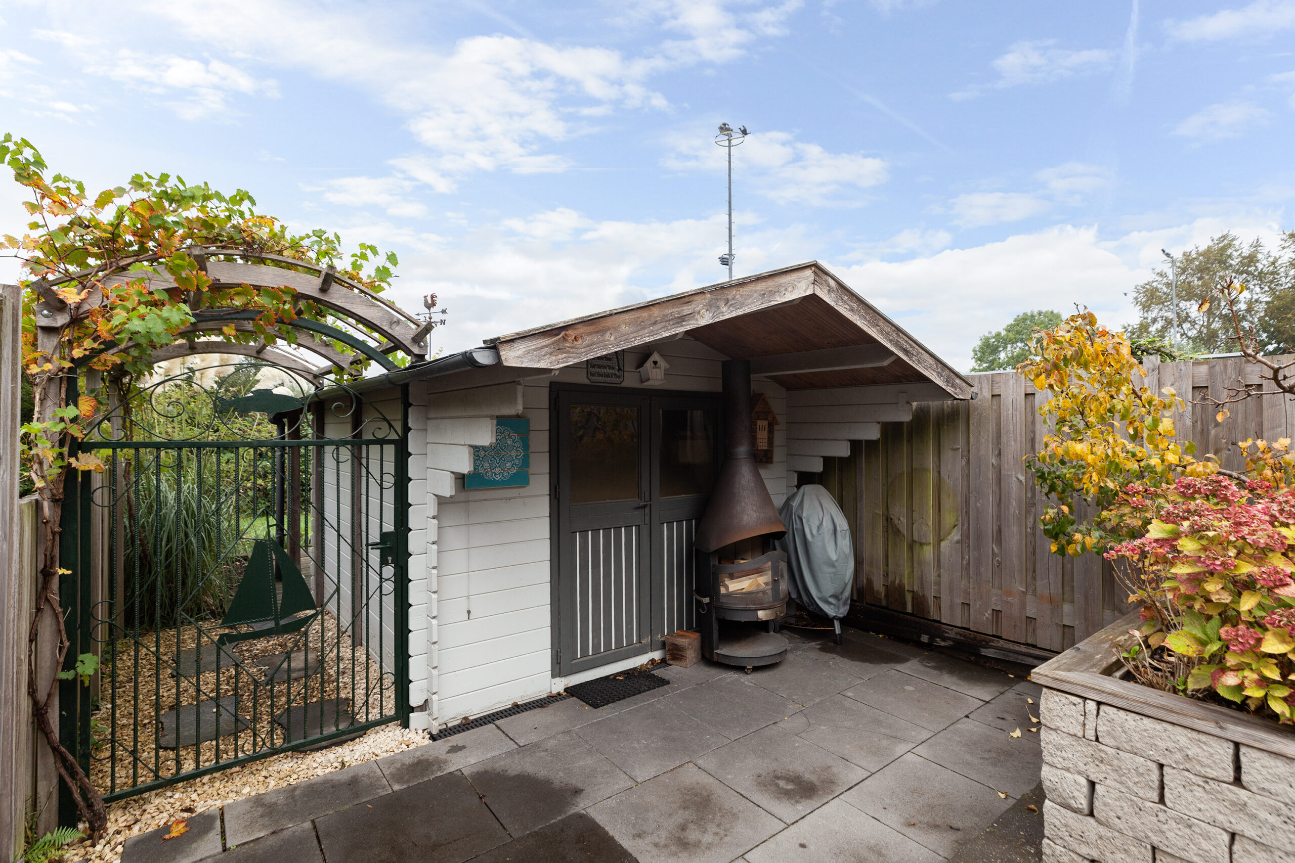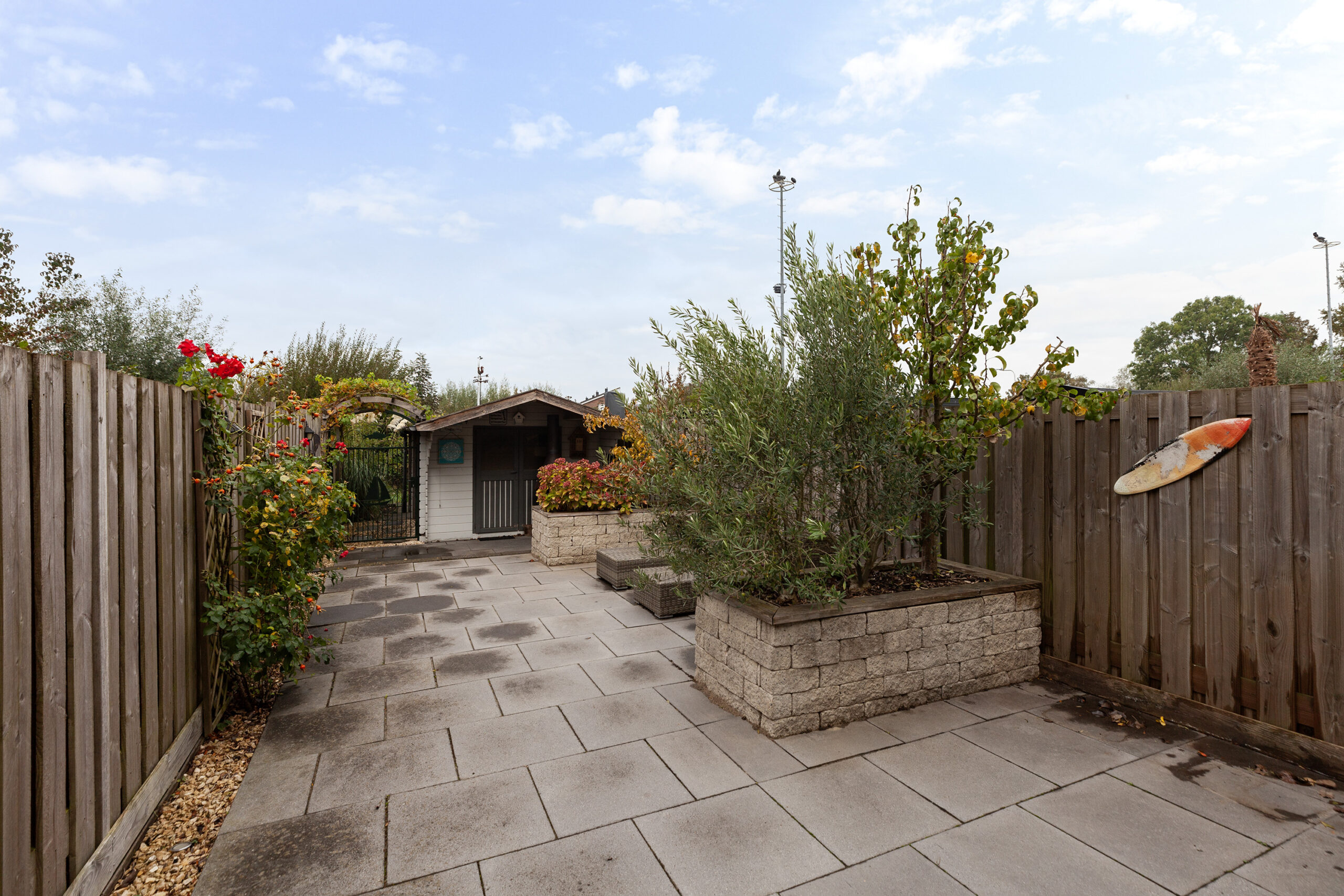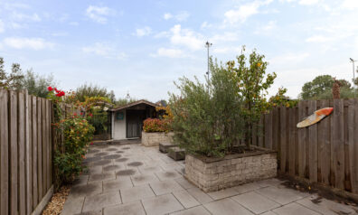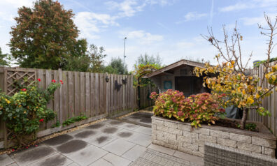De achtertuin is verzorgd en onderhoudsvriendelijk aangelegd en grotendeels betegeld. Daarnaast zijn er ook enkele plantenborders met diverse struiken en beplantingen. Achterin de tuin staat een houten berging van circa 2.97 x 2.95m. Via het naastgelegen ijzeren hekje loopt u verder naar een overkapt gedeelte achter de berging waar een houtopslag is. Aan het water is een houten vlonder waar het eveneens aangenaam vertoeven is. Dankzij de beschutte ligging geniet u van volop privacy en is de tuin een heerlijke plek om in alle rust buiten te zitten!