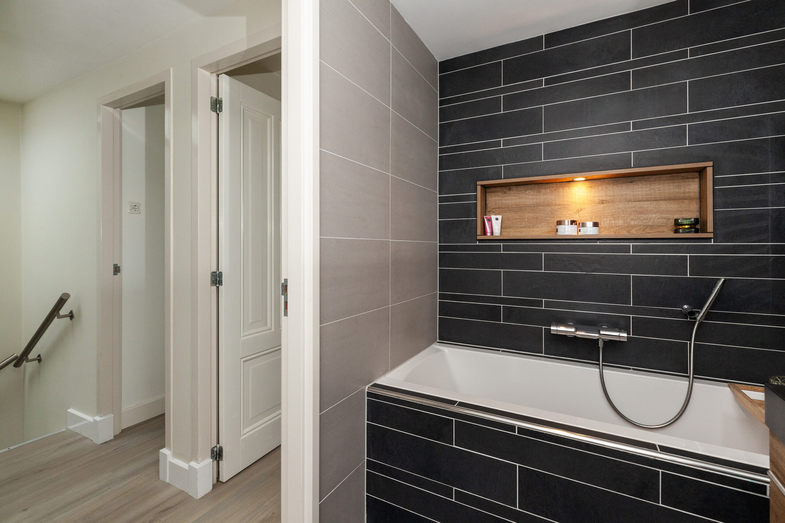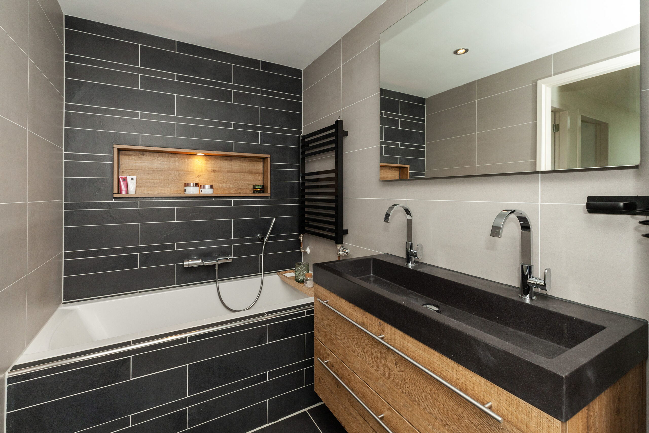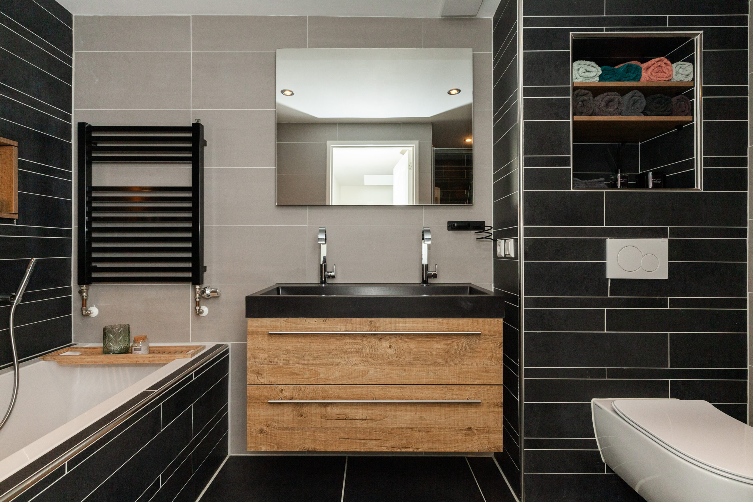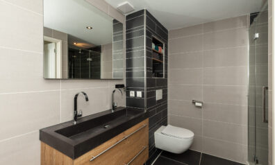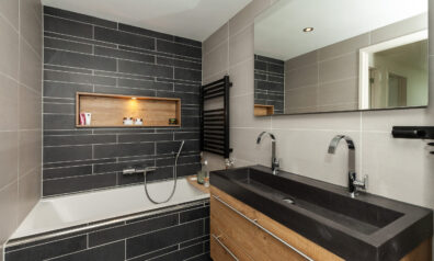 De moderne badkamer treft u tussen slaapkamer I en III. Deze is uitgevoerd in een nette, eigentijdse kleurstelling. Stijl en comfort gaan perfect samen. Of u liever het ligbad neemt of een douche, hier kan het allebei. De douche is voorzien van een infrarood en sunshower! Daarbij is er een dubbel wastafelmeubel, designradiator en een toilet. Praktische details zoals de ingebouwde nissen, handig voor het opbergen van handdoeken en verzorgingsproducten maken het geheel af!