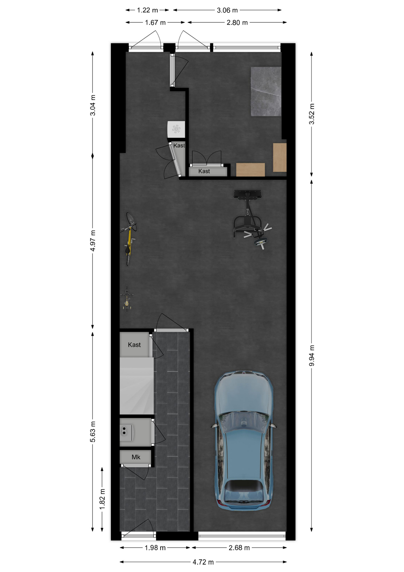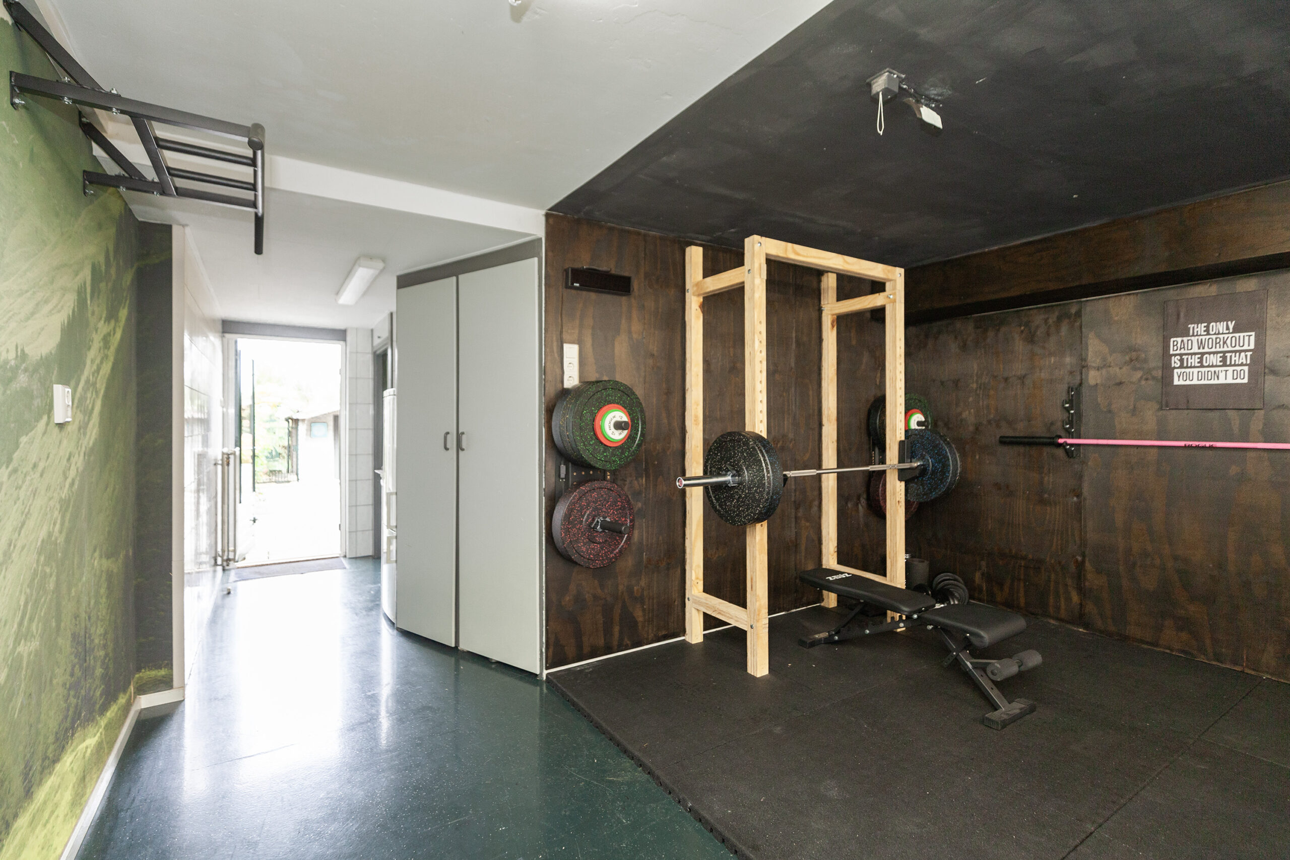 Een grote ruimte, welke uitgebouwd is en volop mogelijkheden biedt! Dat is absoluut van toepassing hier. Doordat de garage aan de voorzijde overvloeit in een ruimte welke multifunctioneel is, zullen de ideeën voor de indeling absoluut veel zijn. Momenteel staan er sporttoestellen opgesteld en wordt het gedeeltelijk als sportruimte gebruikt. De gietvloer, tezamen met de verwarming maken het dan ook tot een aantrekkelijke ruimte. Aan de achterzijde is er een inbouwkast met ernaast een wateraansluiting voor bijvoorbeeld een wastafel. Daarnaast bevindt zich een aparte tuinkamer.