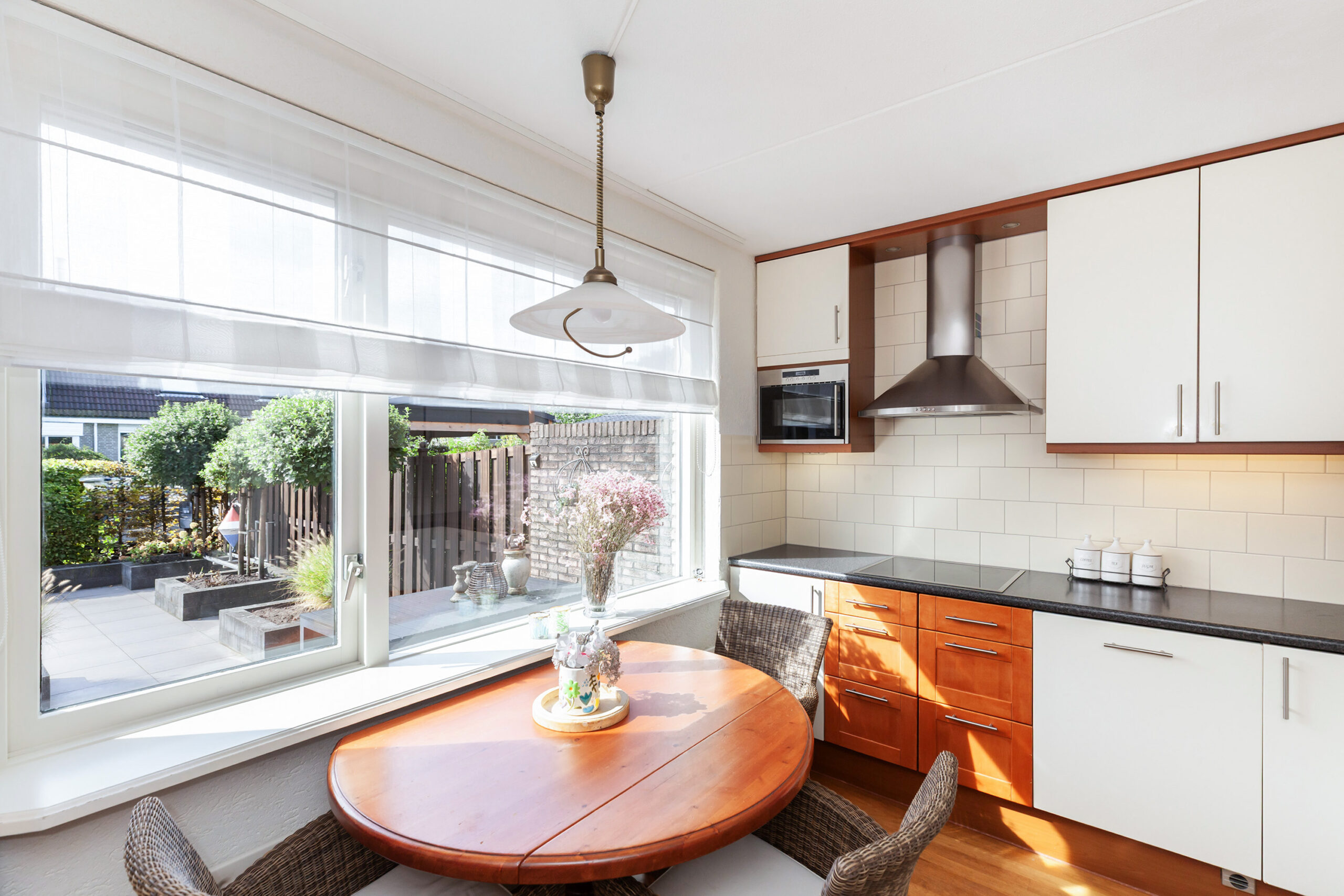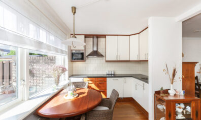 De keuken staat in half open verbinding met de woonkamer, waardoor de ruimtes in elkaar overvloeien. De hoekopstelling bestaat uit een spoelbak, inductiekookplaat, afzuigkap, magnetron en vaatwasser. Aan de andere zijde heeft u de koel-/vriescombinatie naast de bijkeuken.