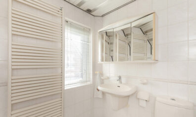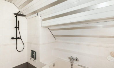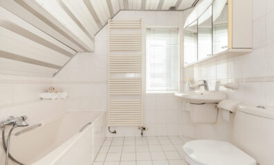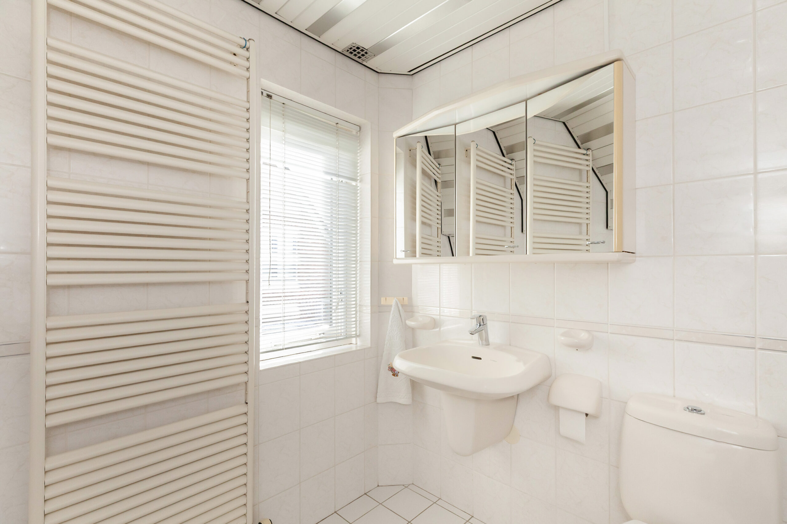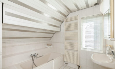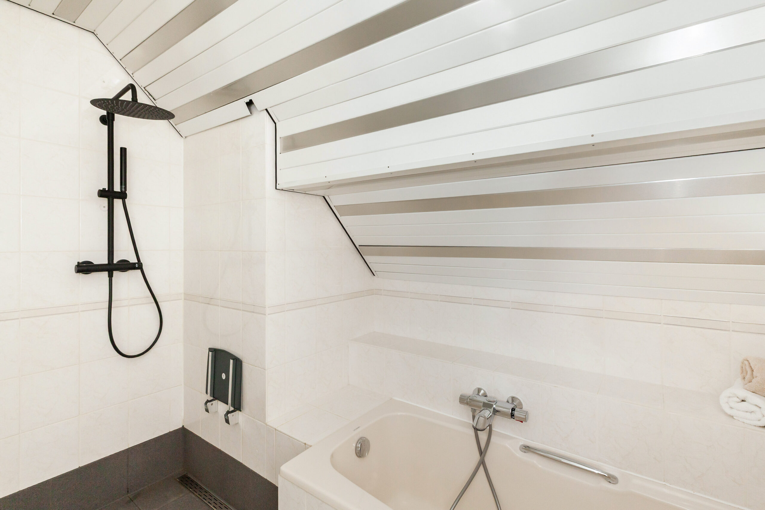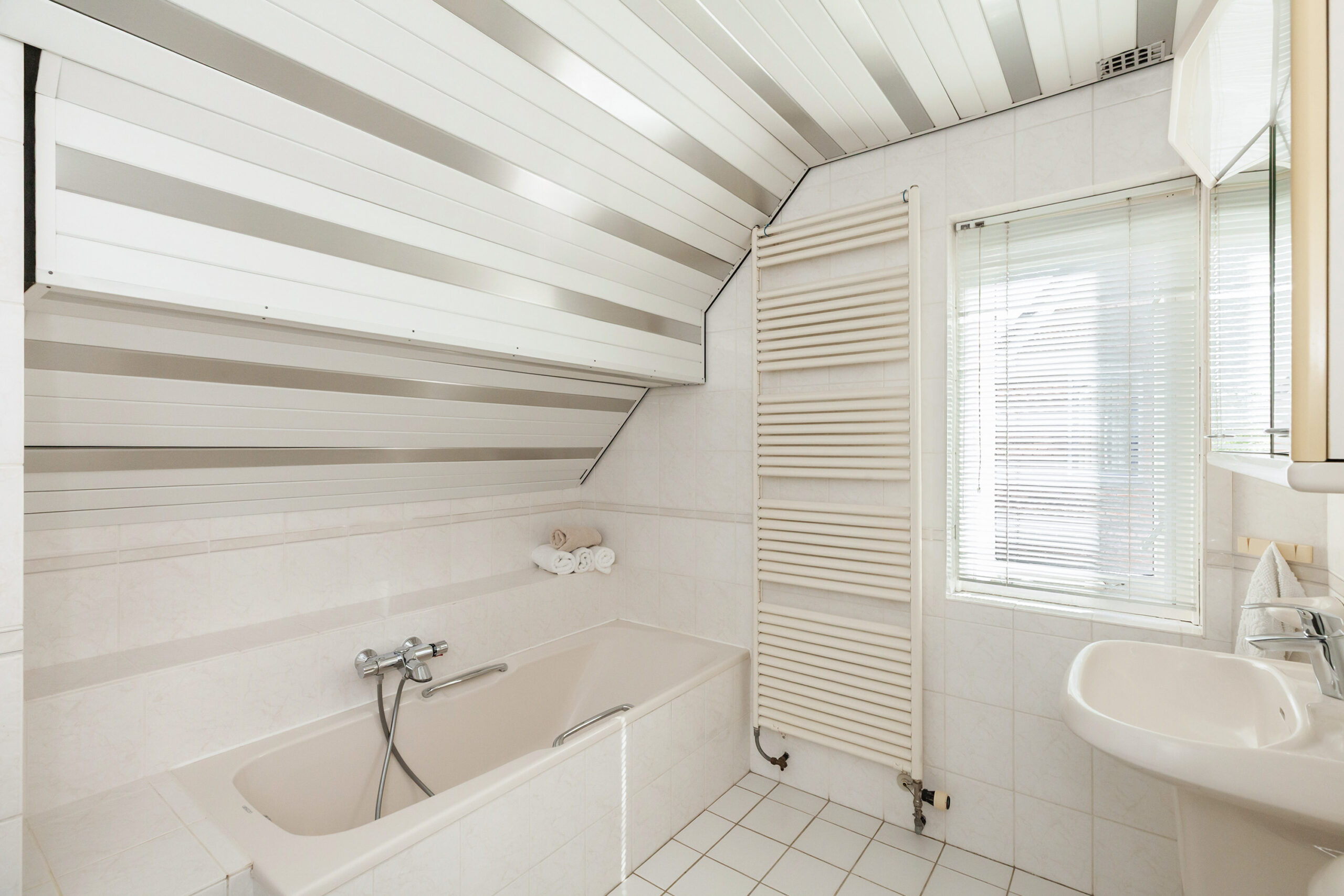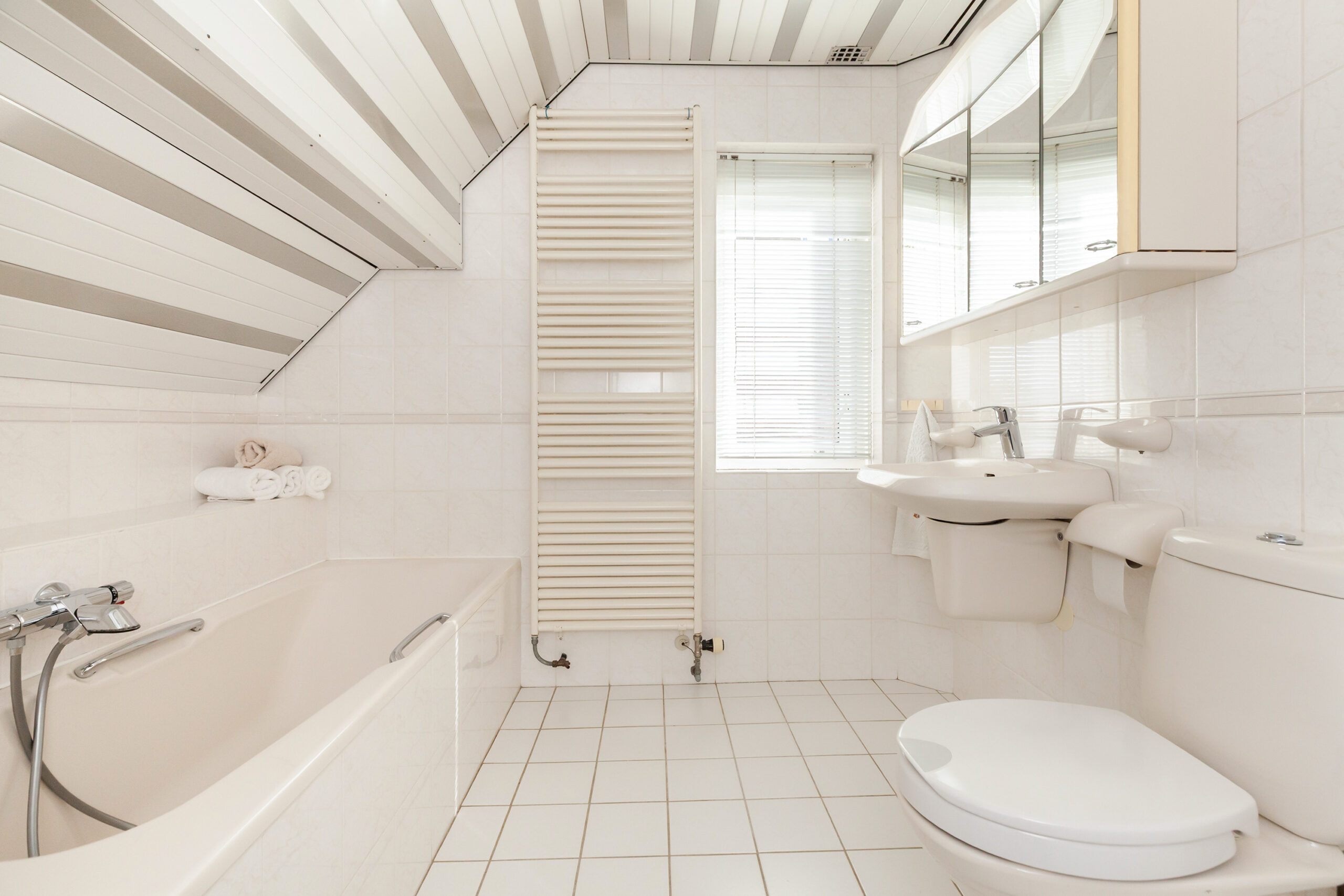 De badkamer, die aan de voorzijde is gesitueerd, is voorzien van alle gemakken. Er is namelijk een ligbad, douche, designradiator, wastafel en een toilet.