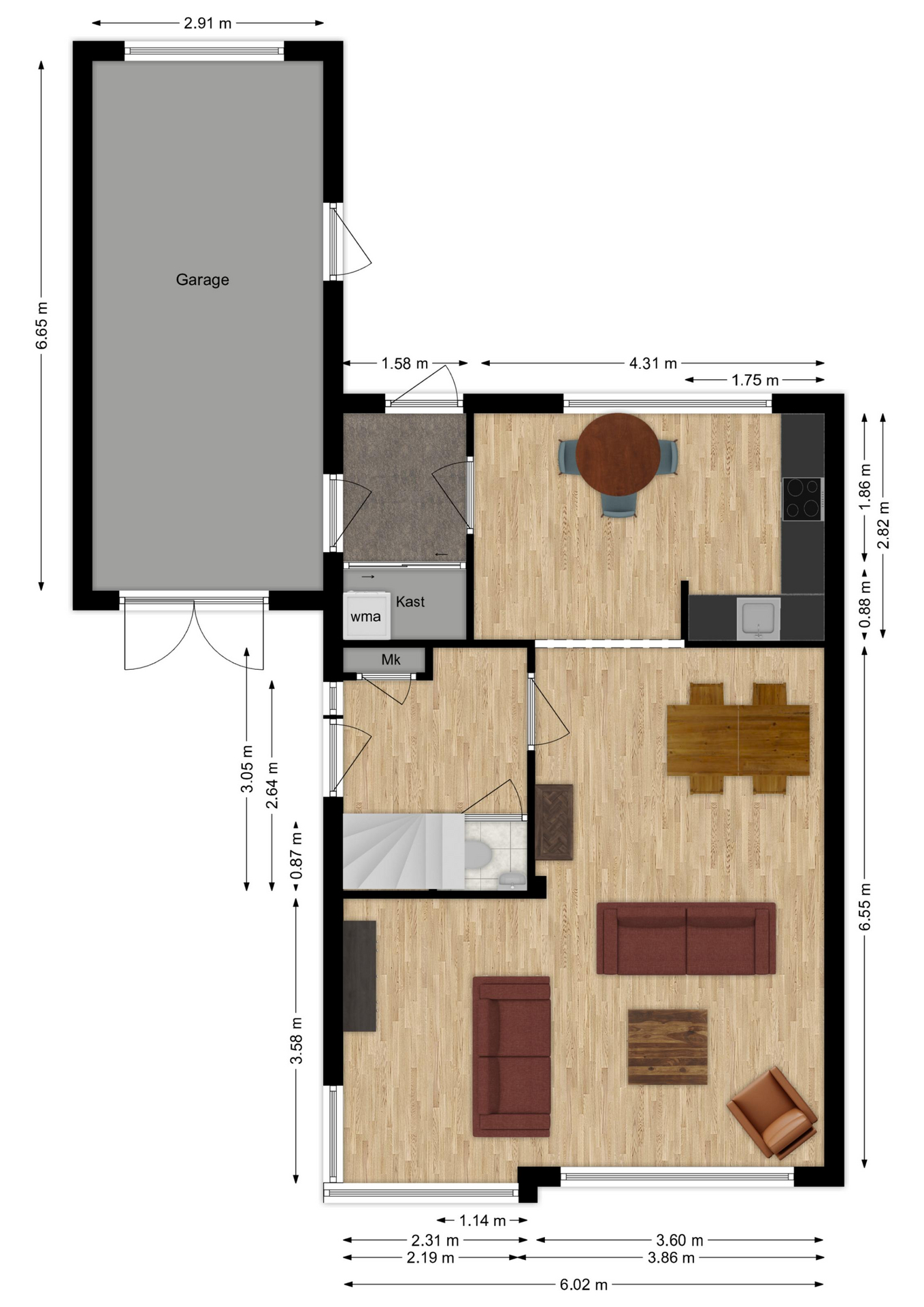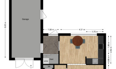 Naast de garage is er een pad, zodat u ook achterom kunt komen. Een heerlijke bramenstruik geeft u vers fruit! De garage (circa 6.65 x 2.91m) is voorzien van een tweetal openslaande deuren aan de voorzijde en is ook binnenuit bereikbaar via de bijkeuken. Tevens is er een achterdeur naar de tuin. Dagelijkse voorzieningen zijn op korte afstand gelegen van de woning!