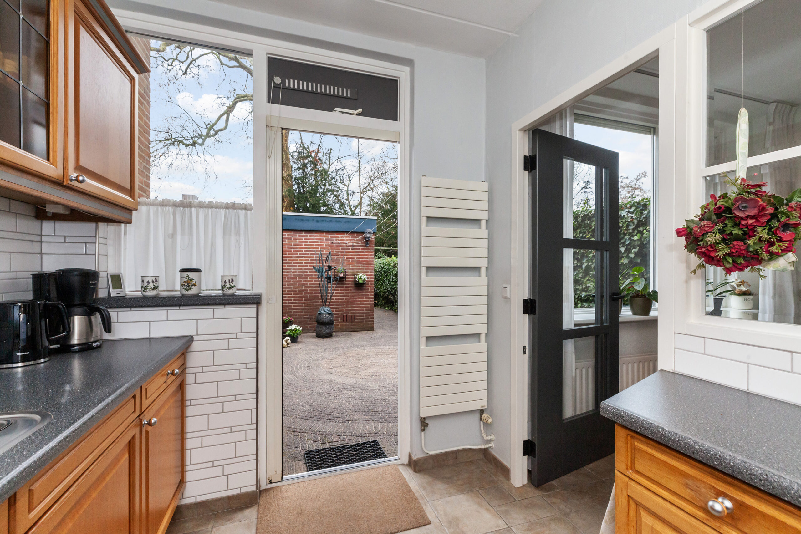 Aan de achterzijde is de keuken gesitueerd in een ruime U-opstelling. Door het raam houdt u leuk contact met de woonkamer. Aan inbouwapparatuur is er de beschikking over een 4-pits gaskookplaat, afzuigkap, vaatwasser, koel-/vriescombinatie en de combimagnetron. Via de achterdeur komt u in de achtertuin.