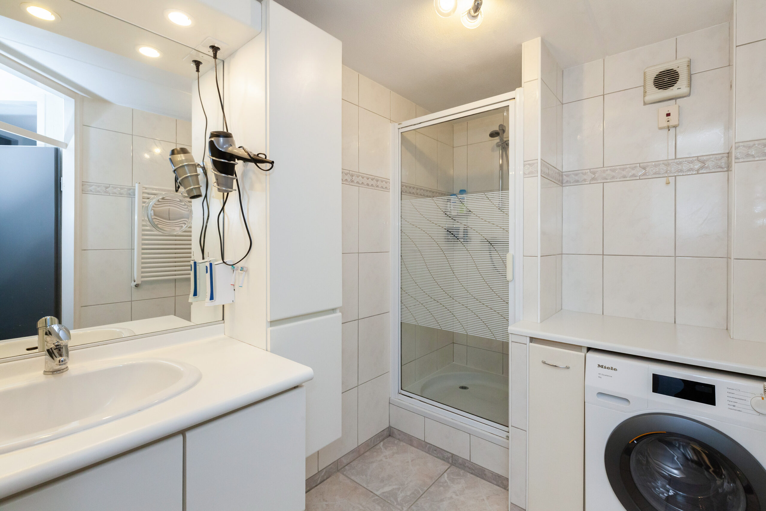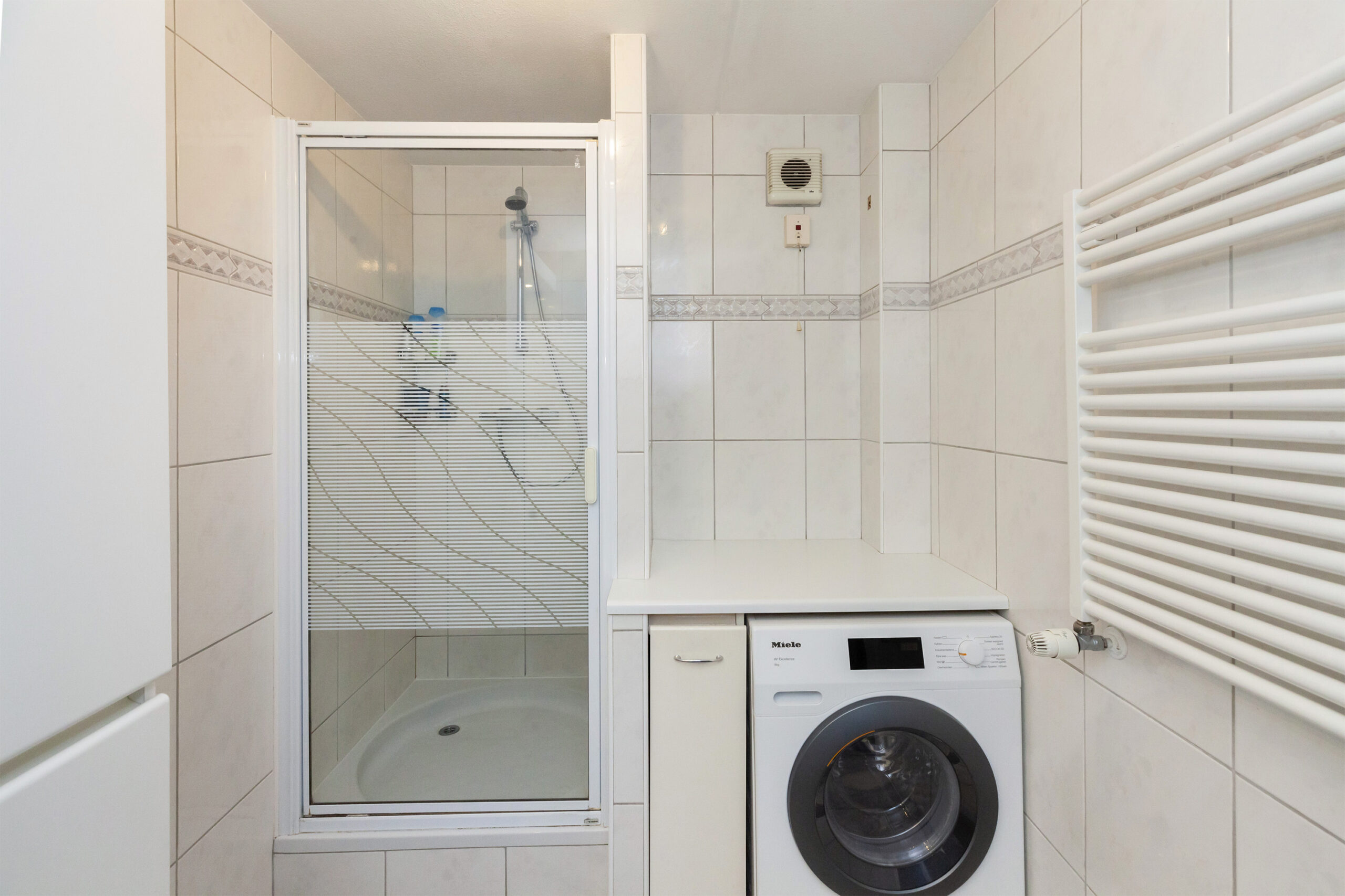 De badkamer is in een lichte kleurstelling uitgevoerd. U heeft de beschikking over een douchecabine, wastafelmeubel, designradiator en de aansluitingen voor uw wasapparatuur.