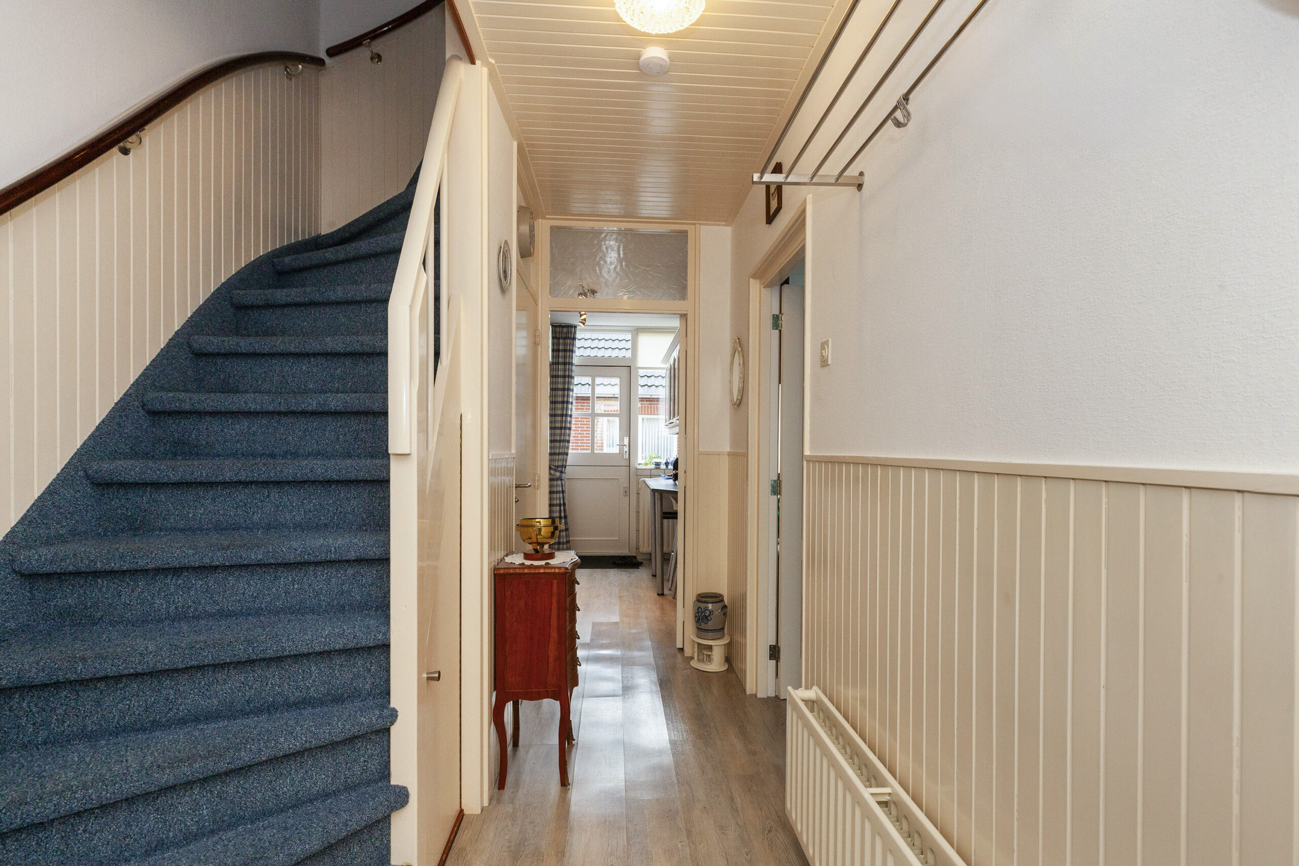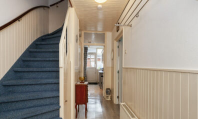 U stapt de woning binnen in een ruime hal waar u aan de linkerzijde de meterkast heeft met een aangrenzende kast voor bijv. schoenen of proviand op te bergen. Verder heeft u de trap naar de eerste verdieping, een trapkast, de toiletruimte en toegang tot de woonkamer. De hal mondt uit in de keuken.