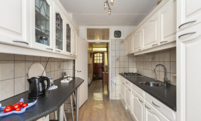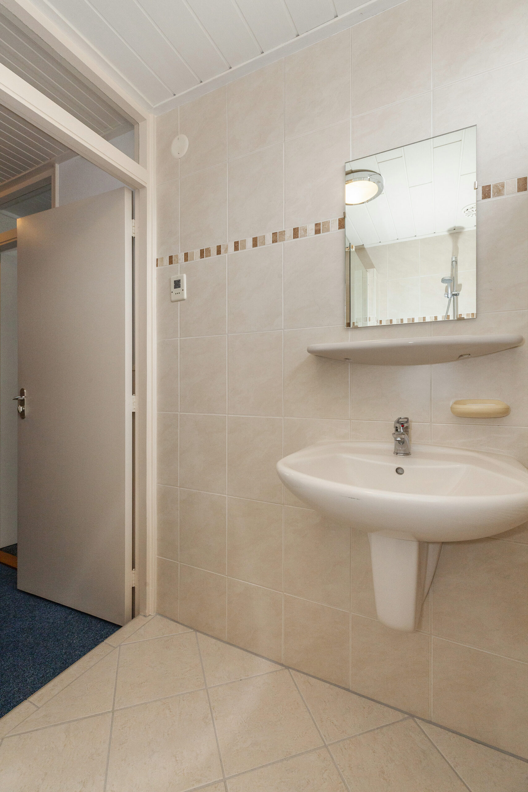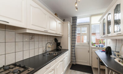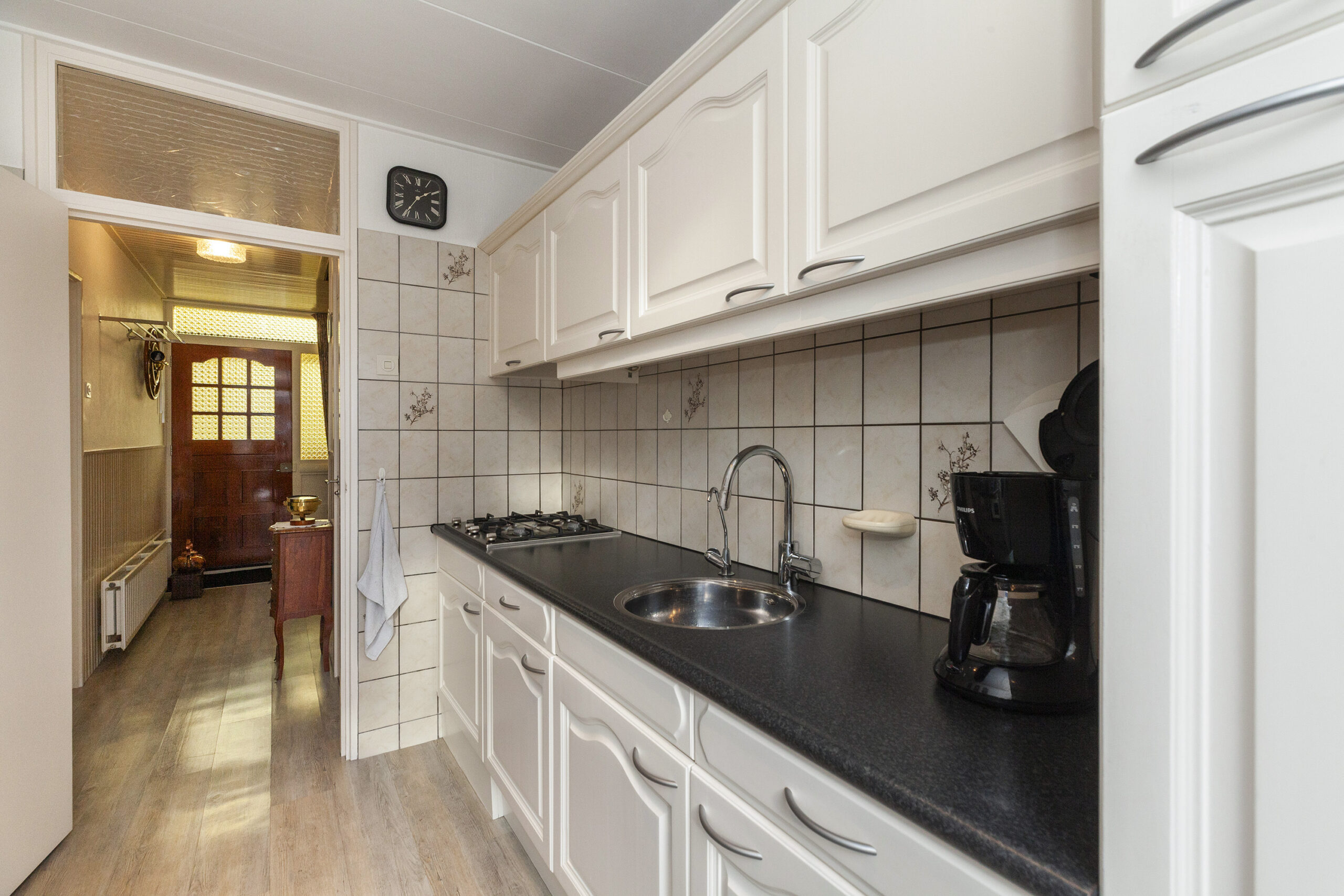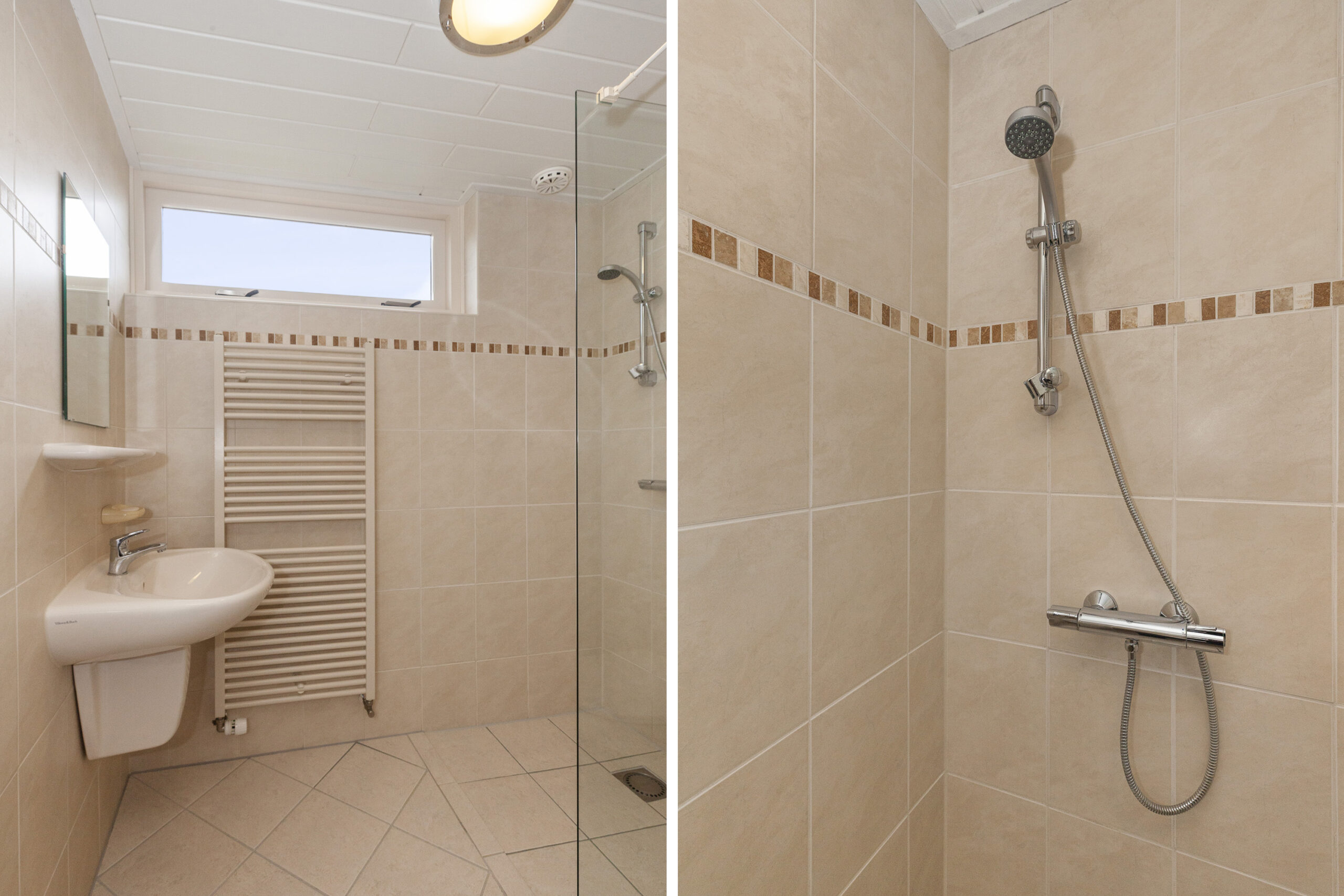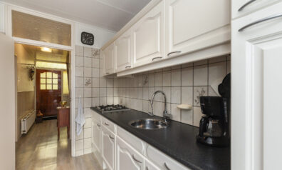 De keuken is aan de achterzijde gesitueerd en u treft hier een rechte opstelling. Aan inbouwapparatuur is er een 4-pits gaskookplaat, afzuigkap en een koelkast met een vriesvakje. Tevens heeft u hier de aansluitingen voor uw wasmachine. Via de achterdeur komt u in de tuin.