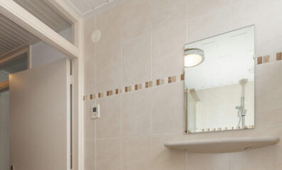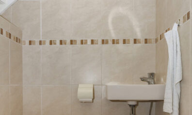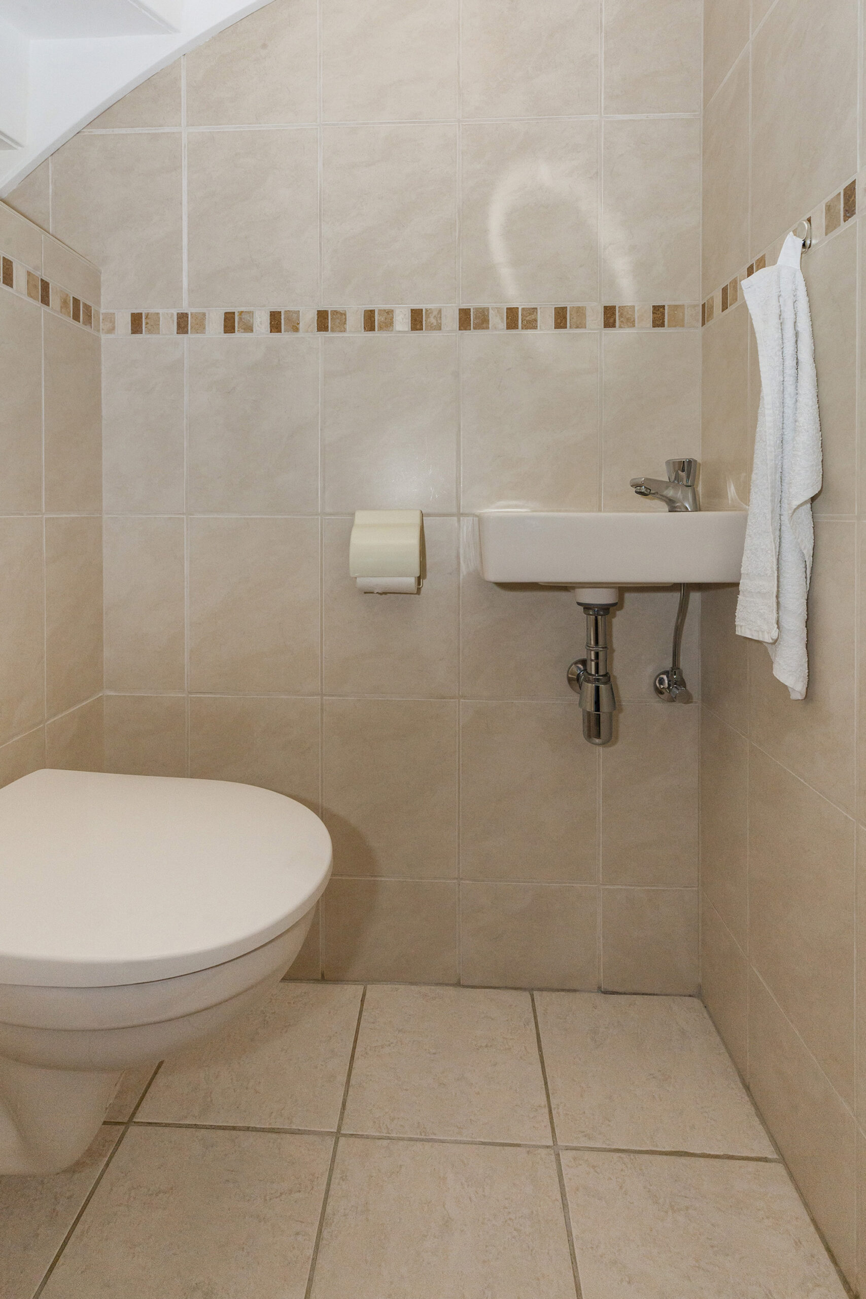 Nette toiletruimte voorzien van een vrijhangend closet een handwasfonteintje.