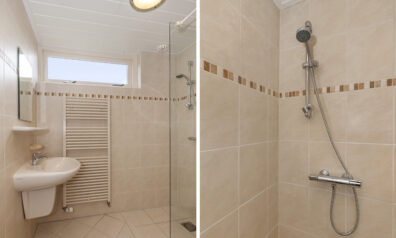 De badkamer is in gelijke stijl afgewerkt als de toiletruimte op de begane grond. Er is een inloopdouche, toilet, wastafel en een designradiator.