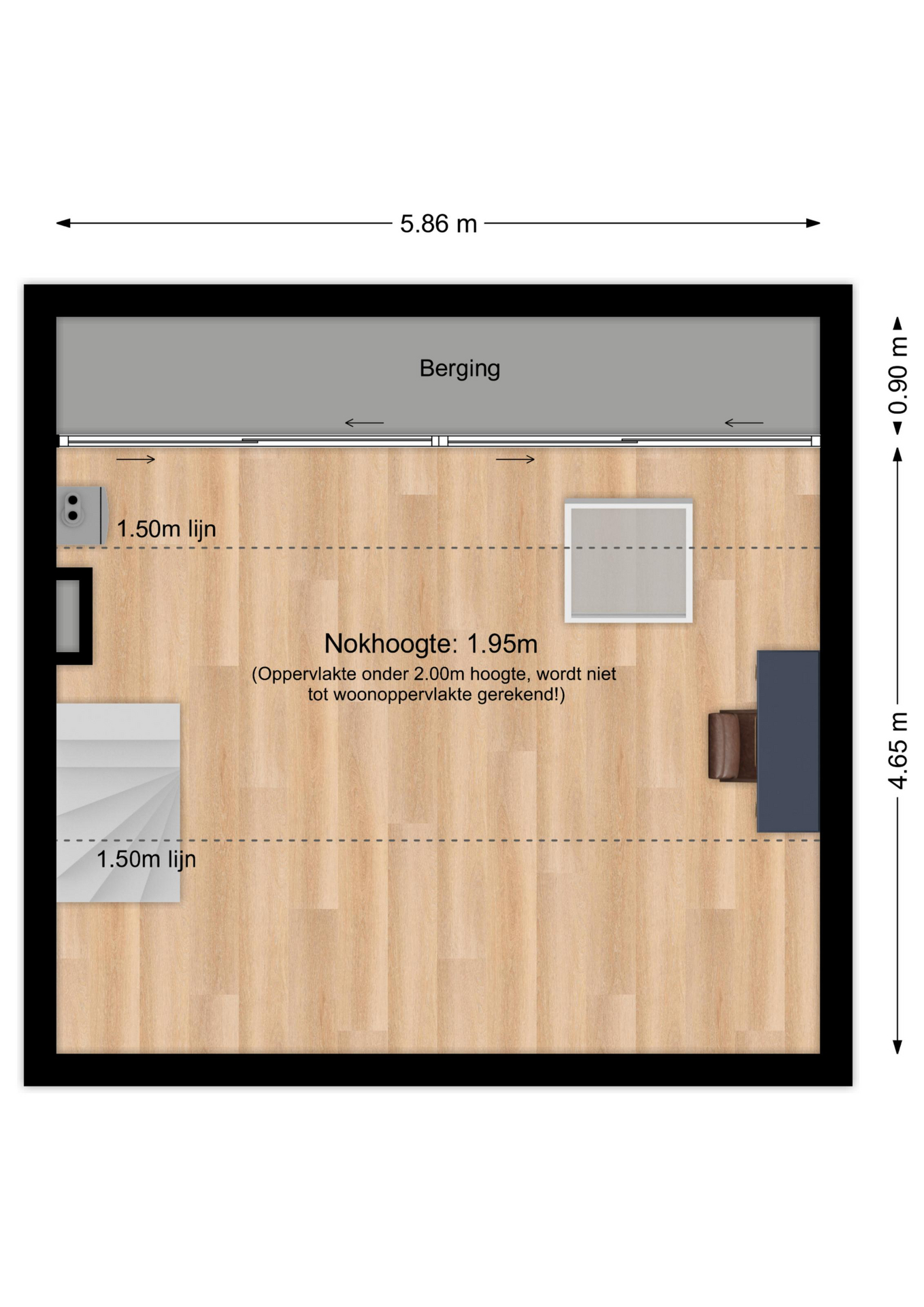 LET OP: De zolderverdieping heeft een nokhoogte van 1.95m, dit behoort niet tot woonoppervlakte, maar overige inpandige ruimte.