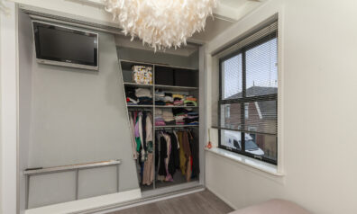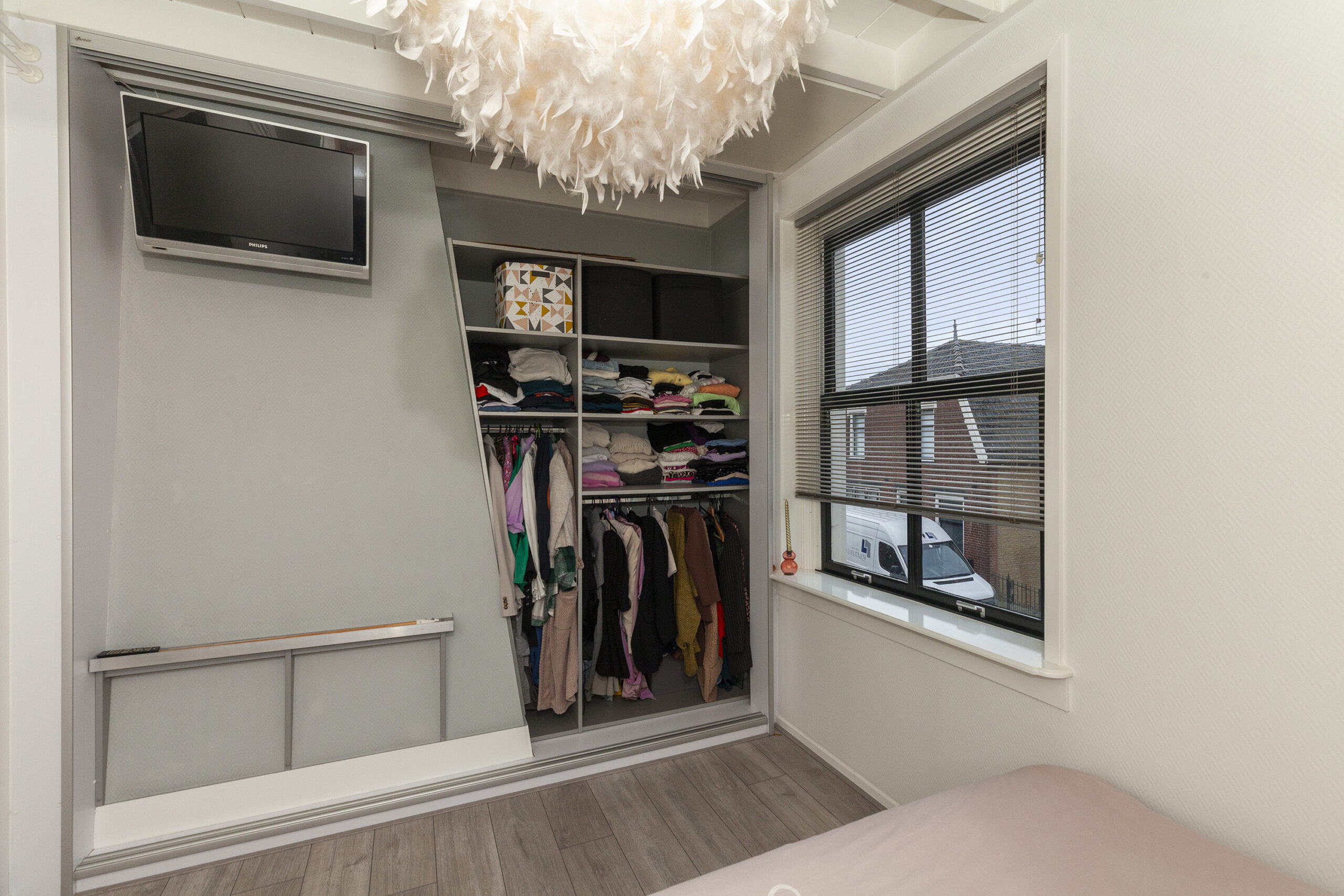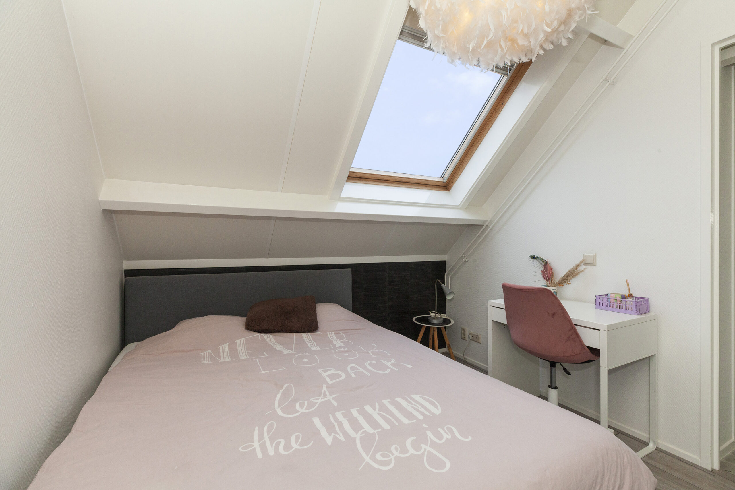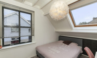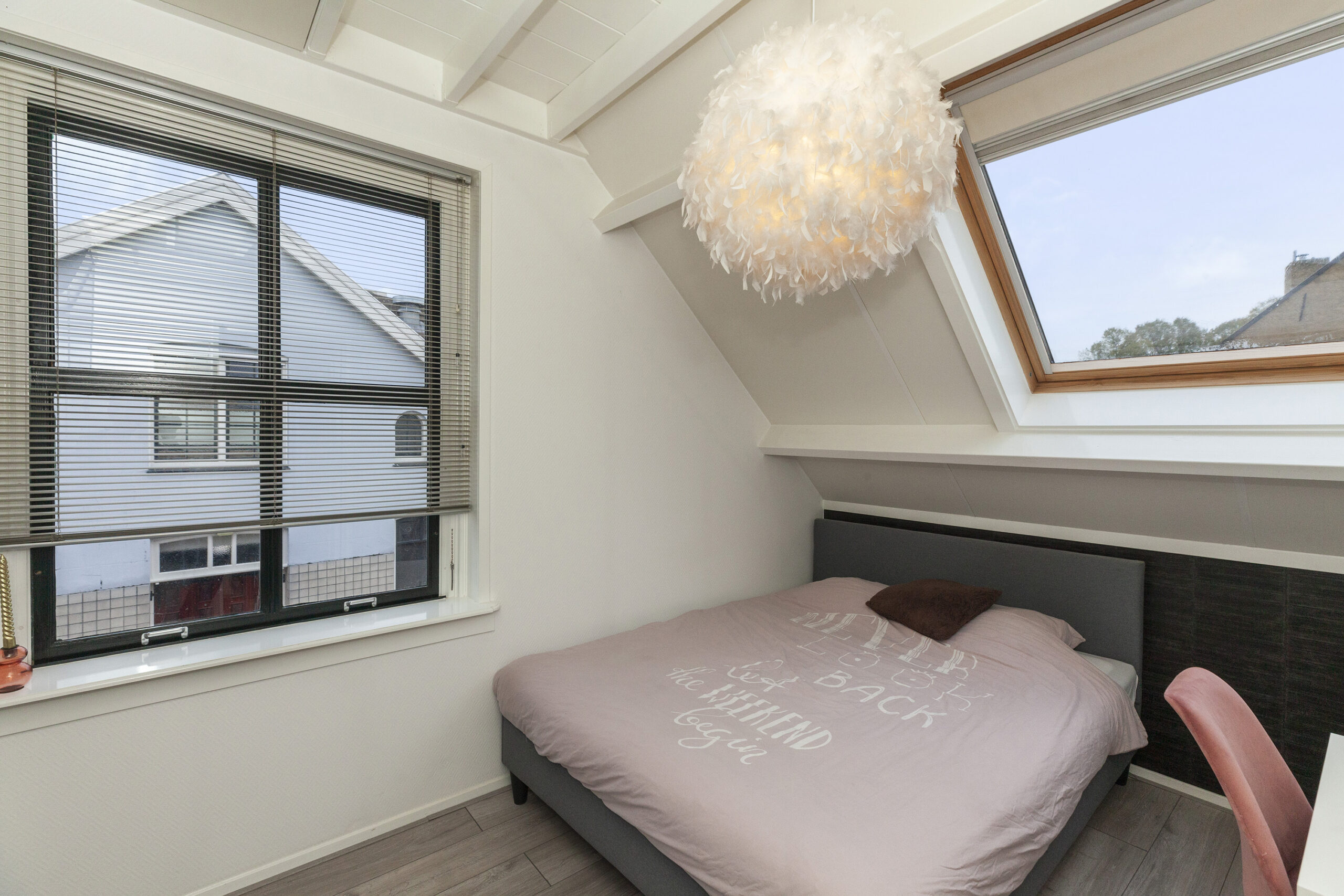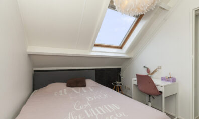 De slaapkamer treft u aan de voorzijde en heeft ook nog het originele schuifraam, leuk hé! Daarnaast is er een tuimelraam, enkele jaren geleden nieuw geplaatst. Via de vlizotrap komt u op de bergzolder, waar zich de C.V.-ketel is.