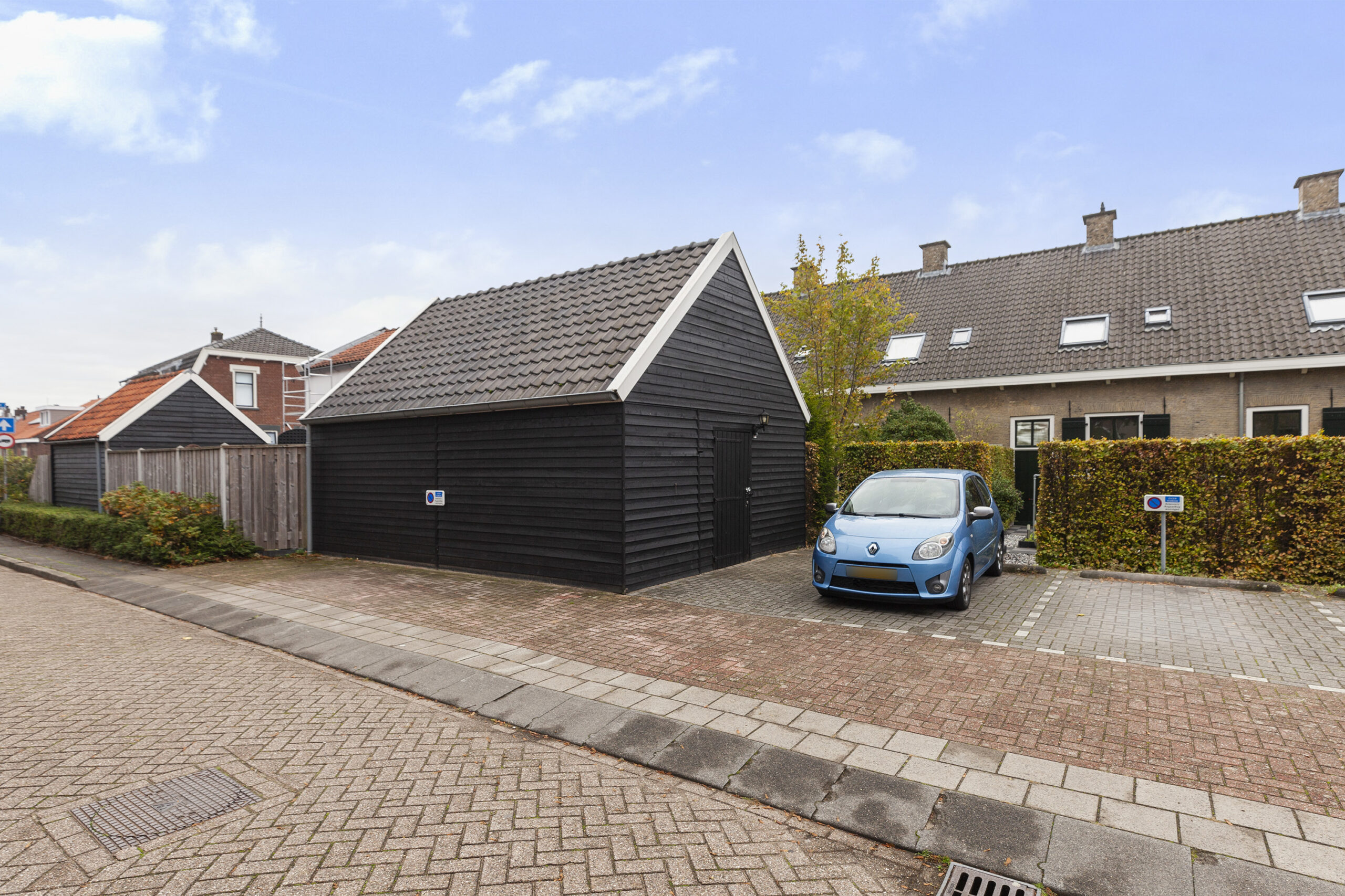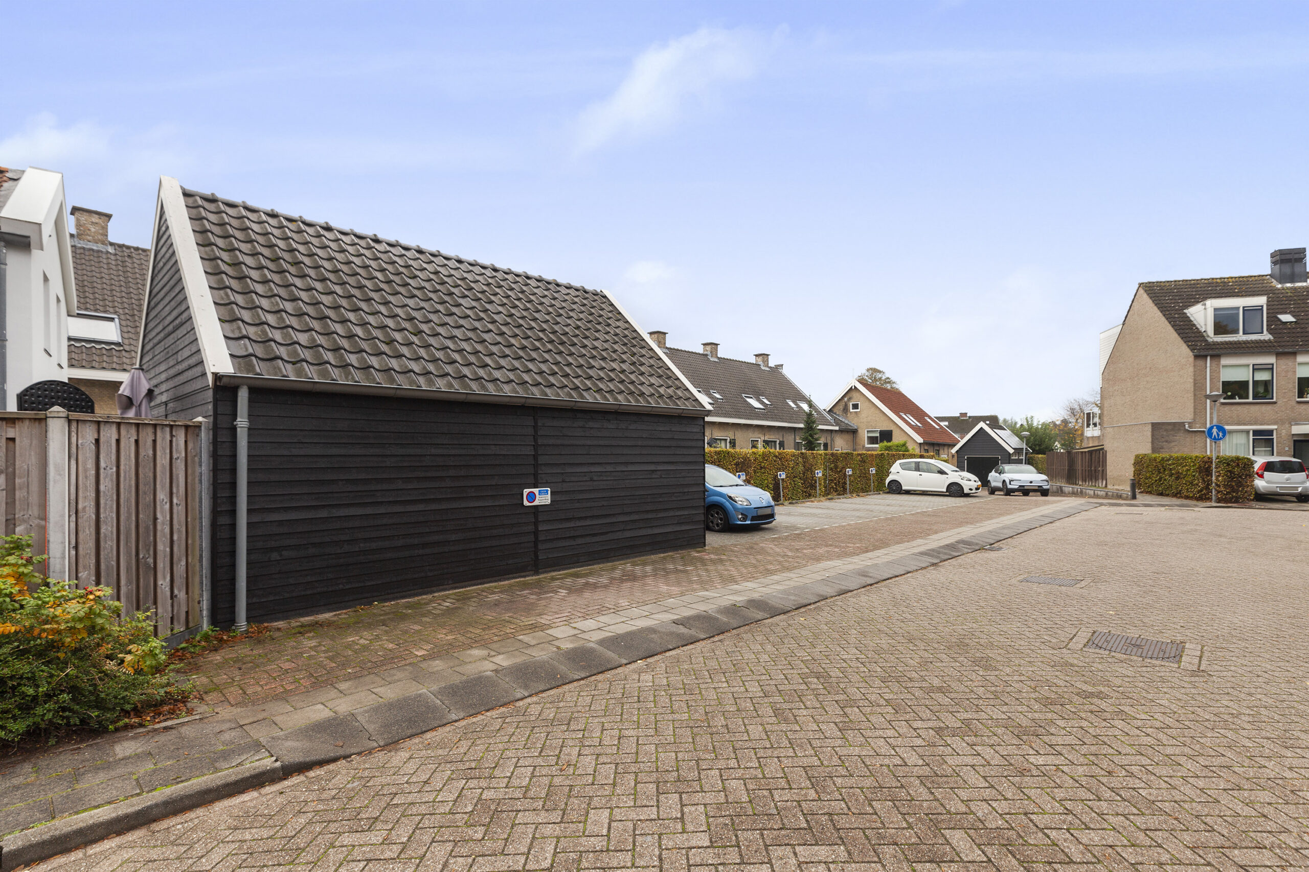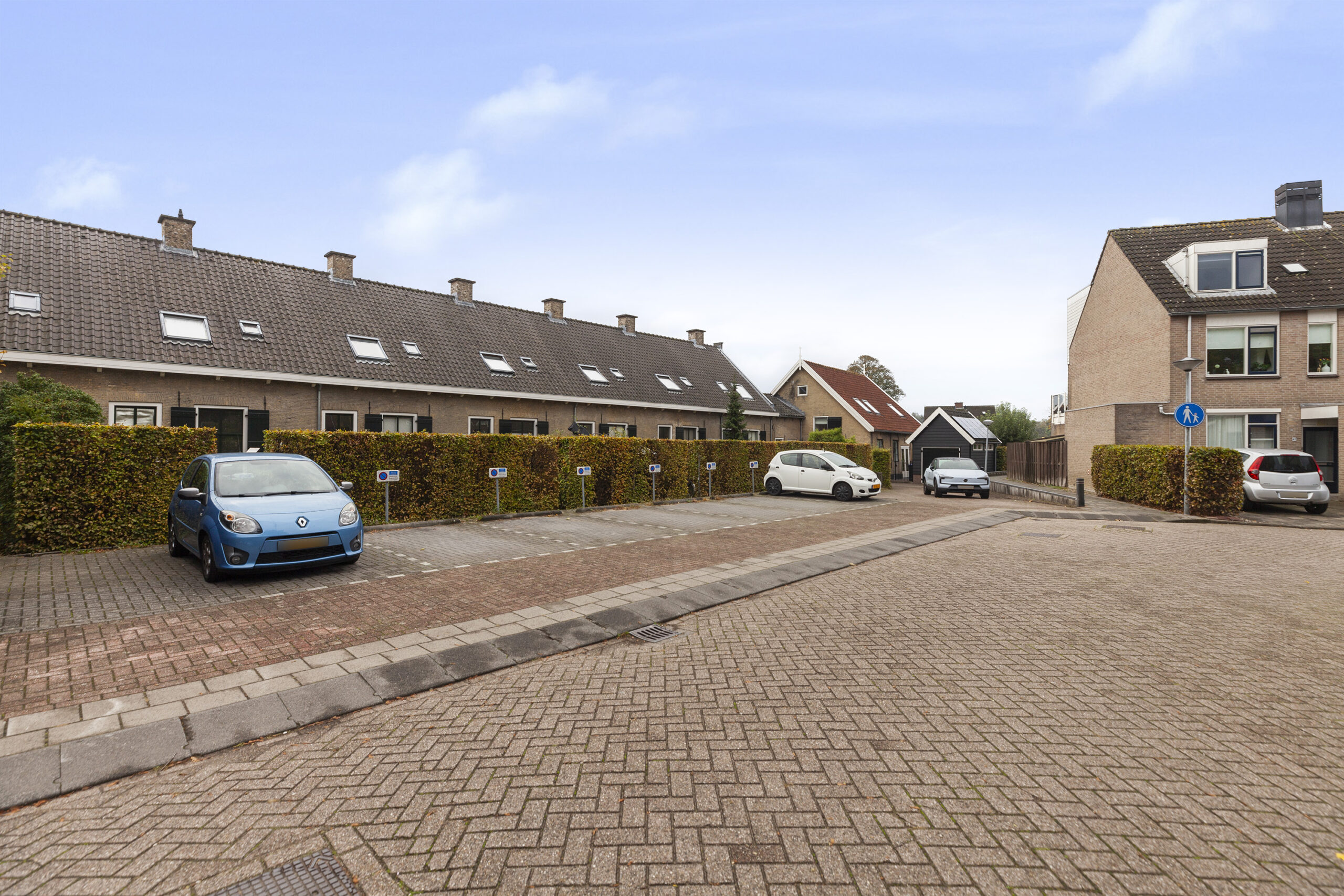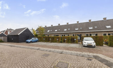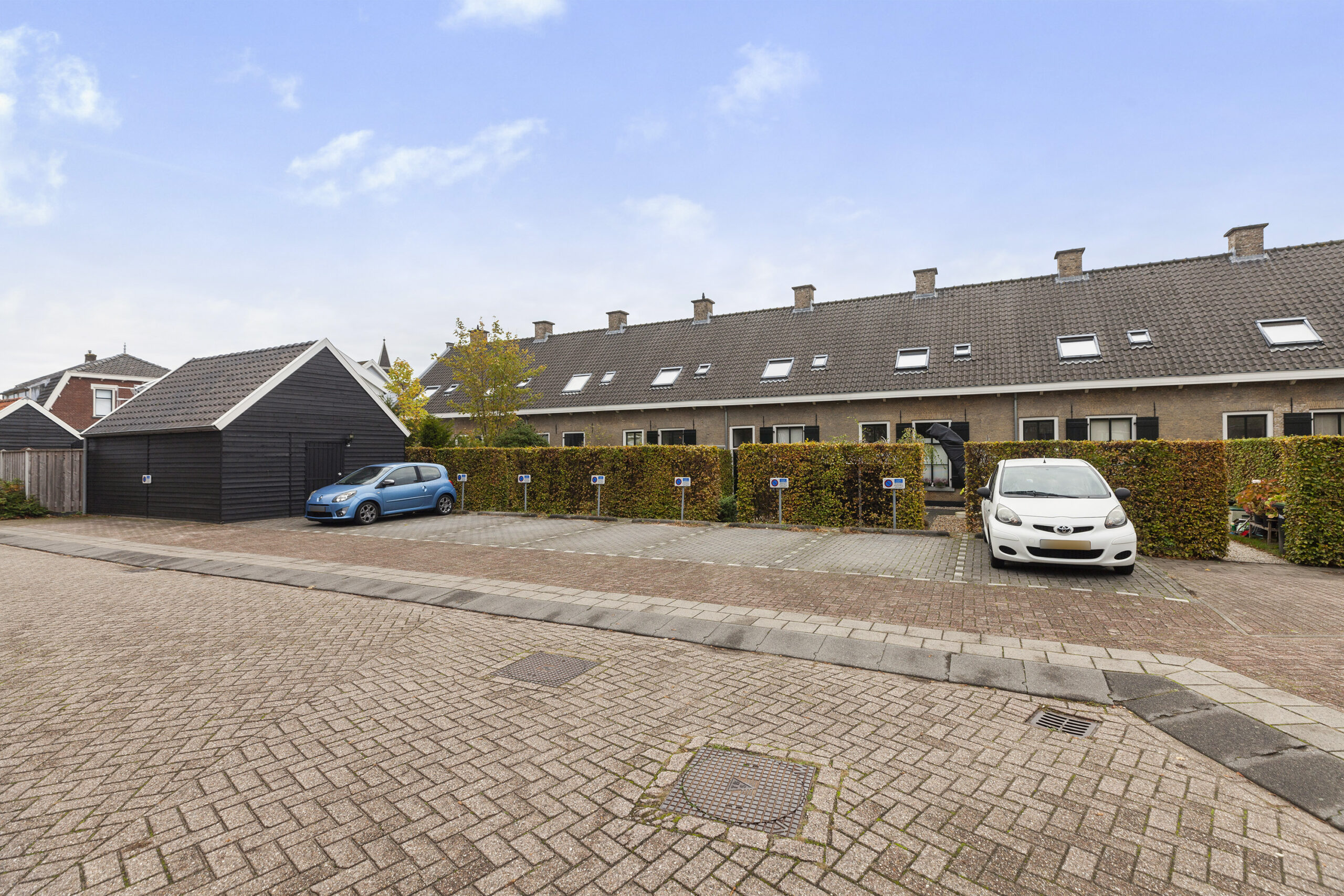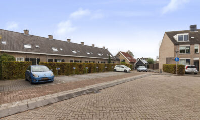 Aan de rechterzijde zijn totaal acht parkeerplaatsen bestemt voor deze rug-aan-rugwoningen. Daarnaast is een gezamenlijke berging voor het plaatsen van uw fiets.