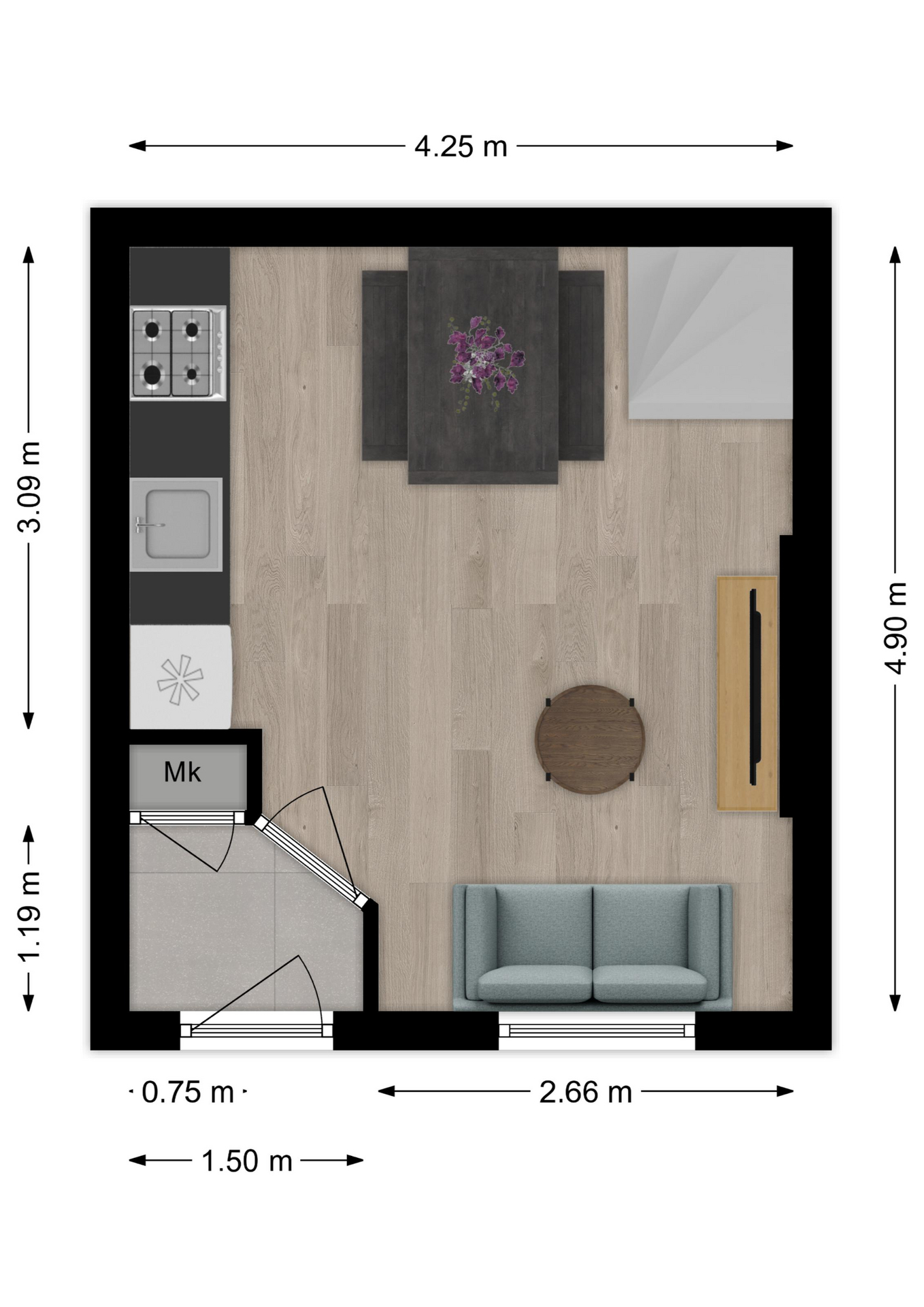 U komt binnen een (kleine) hal waar u de meterkast en de toegang heeft naar de woonkamer.