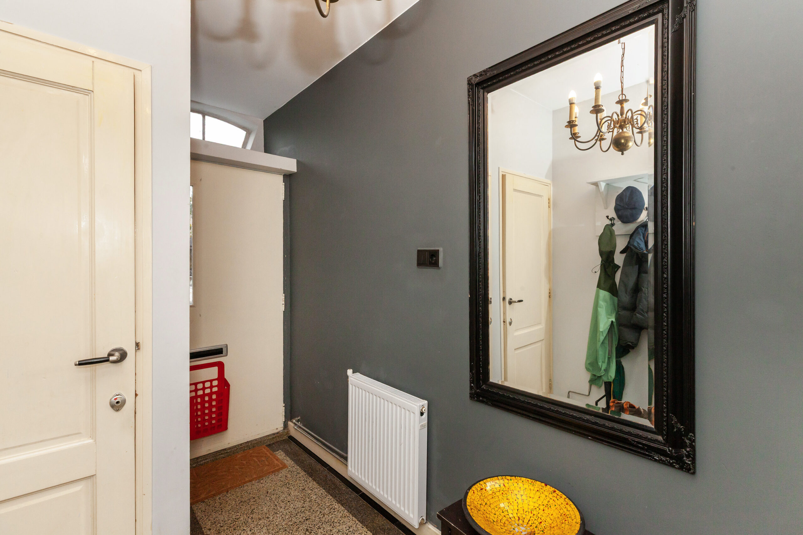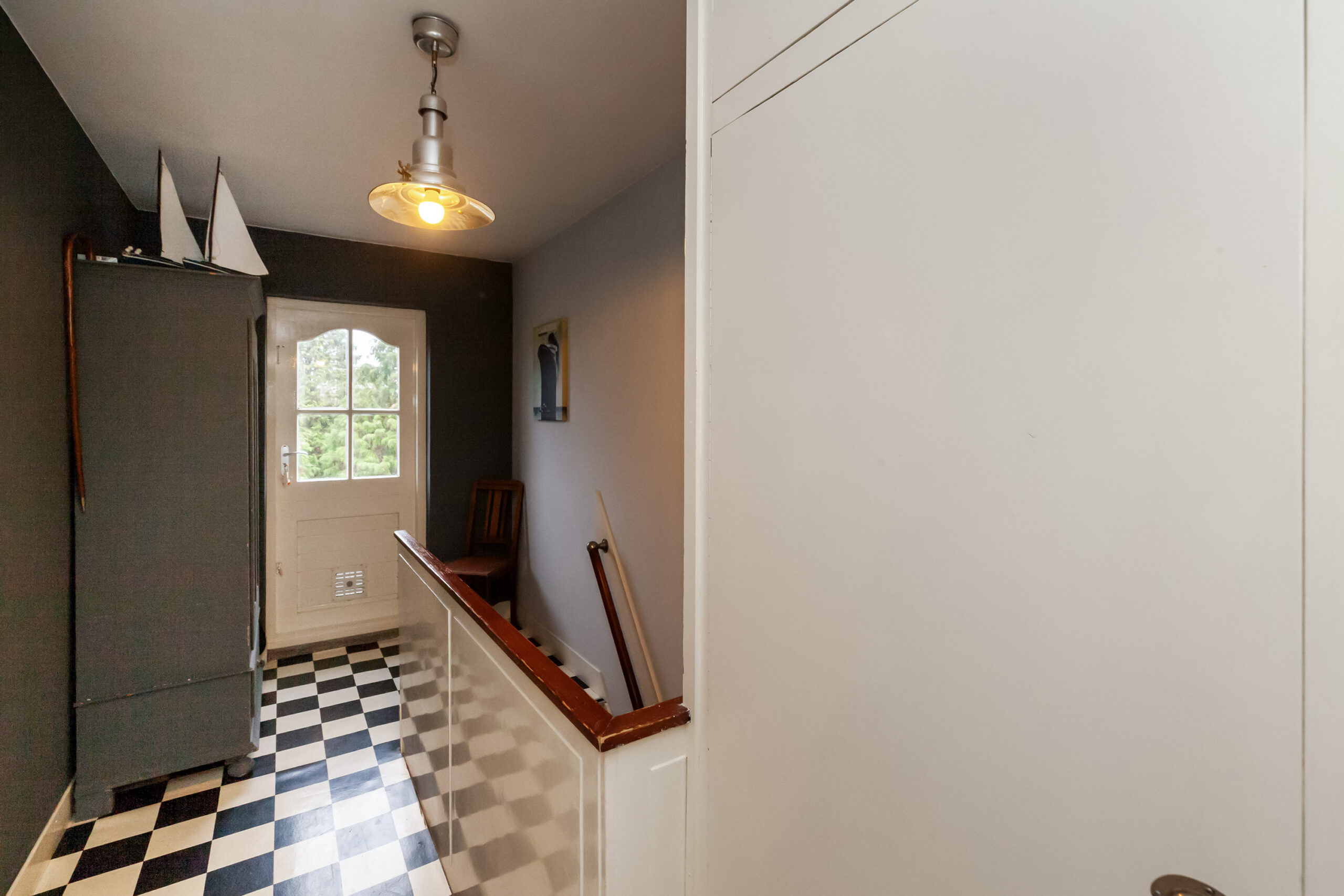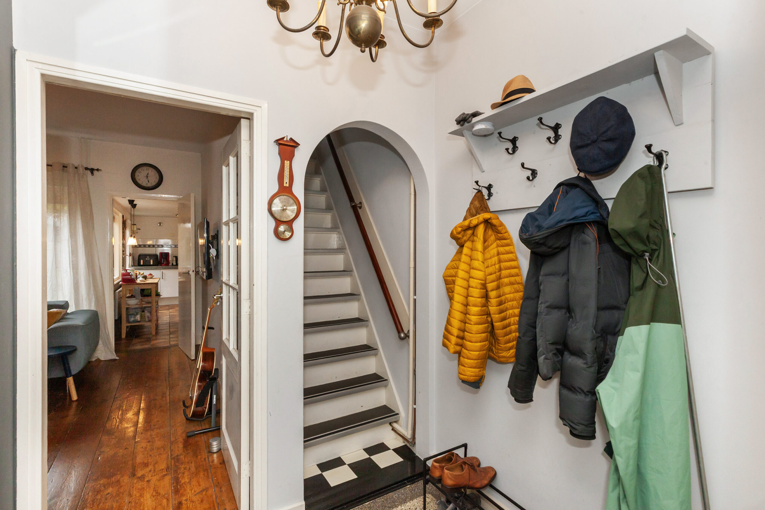 Direct bij binnenkomst in de hal ziet u de originele granietvloer. Naast de meterkast en toiletruimte heeft u toegang tot de woonkamer en de trap naar de eerste verdieping.