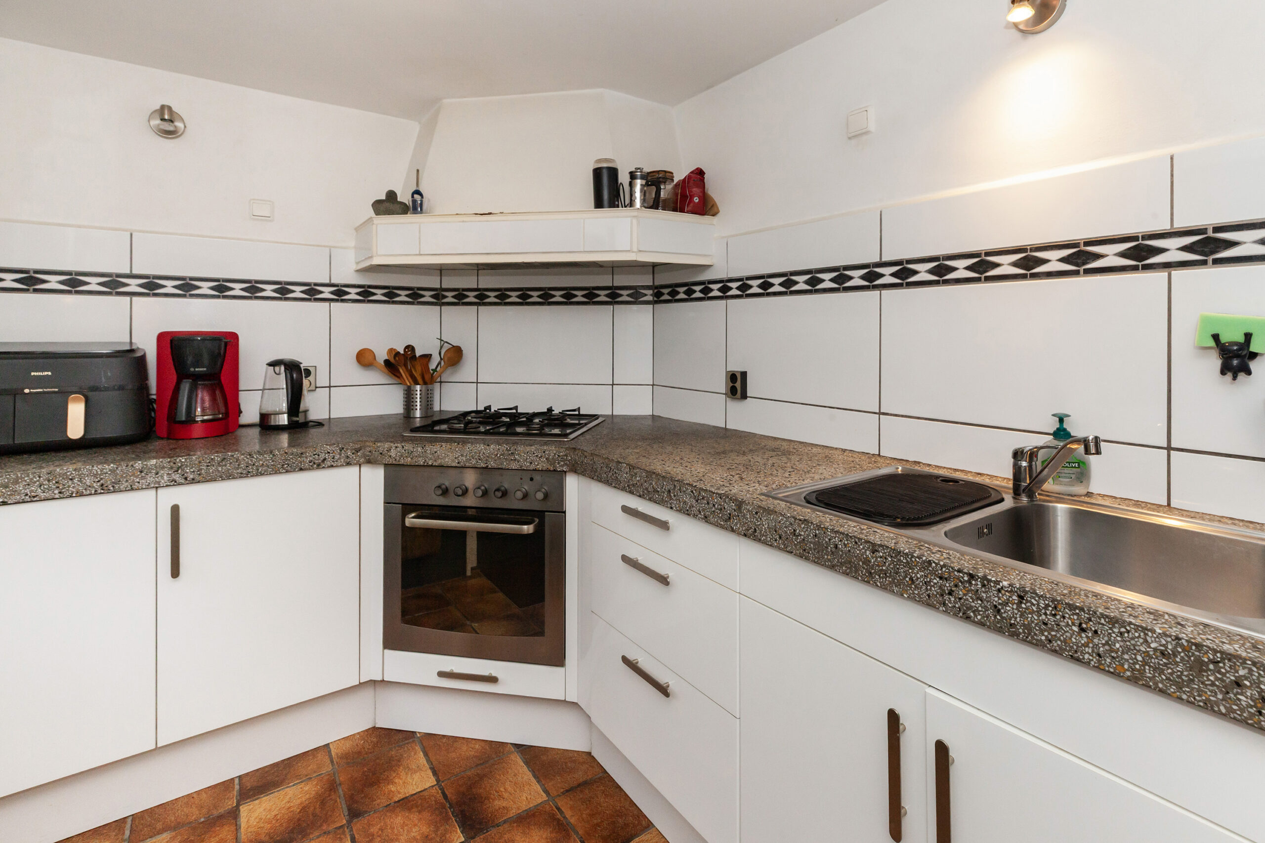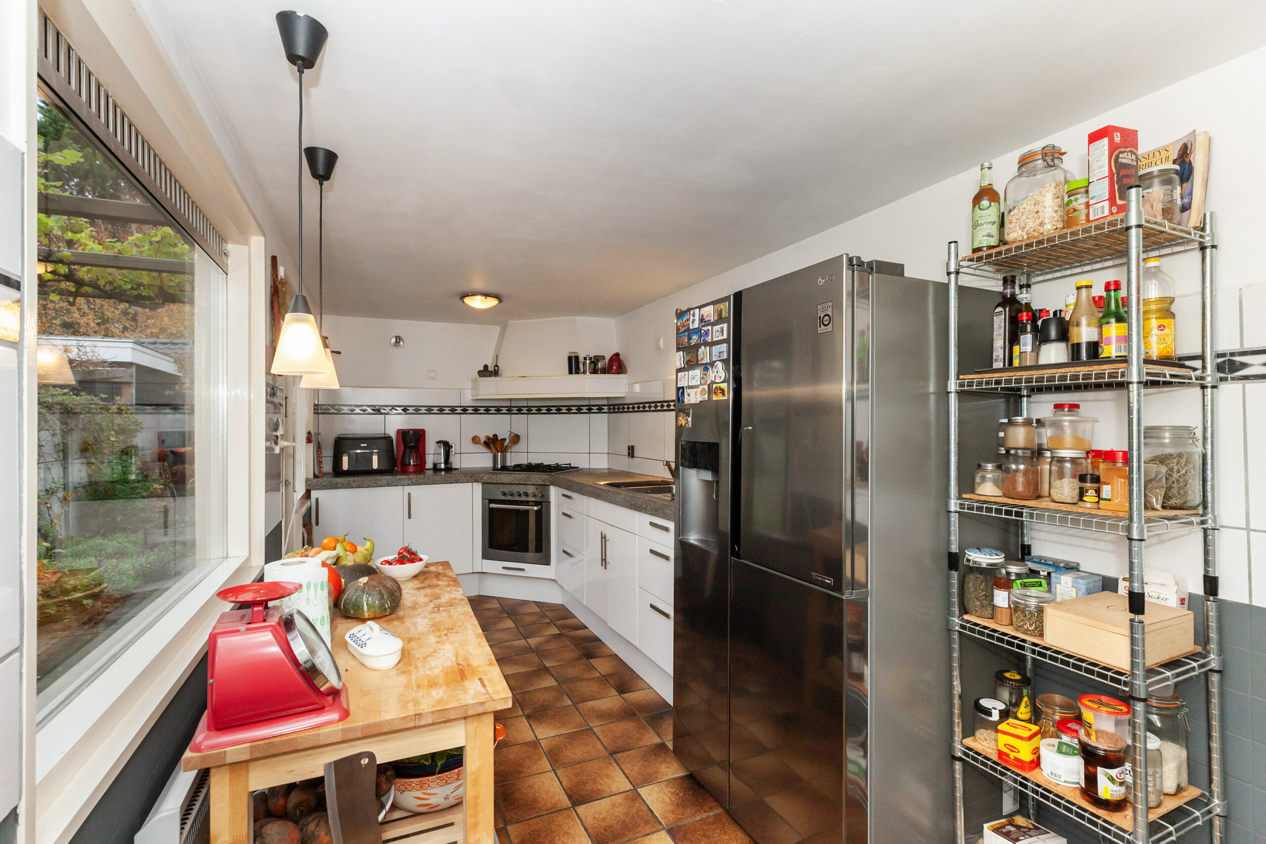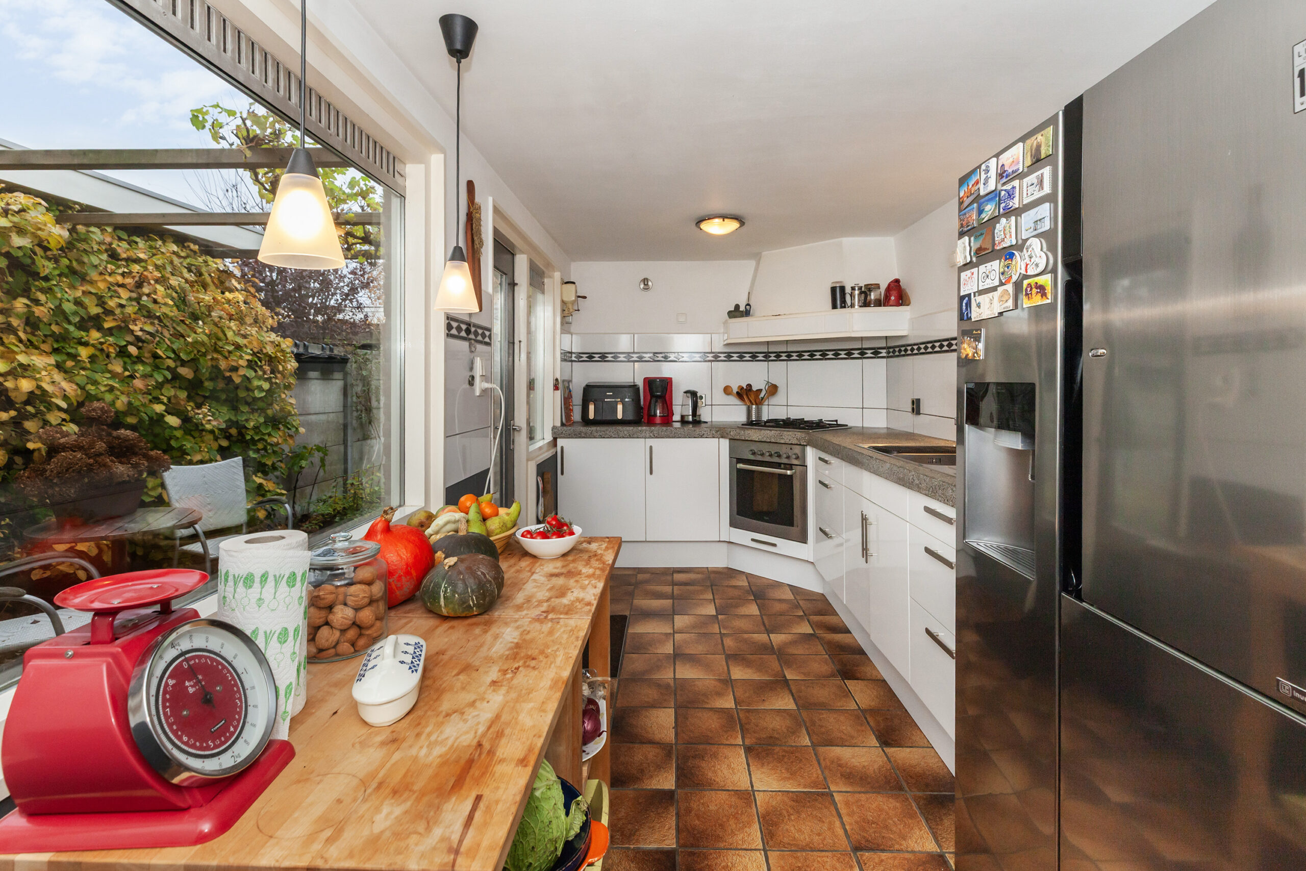 Aan de achterzijde is er een grote aanbouw geplaatst waar u de keuken heeft. Aan de ruime hoekopstelling met graniet aanrechtblad kunt u heerlijk kokkerellen. Aan keukenapparatuur is er de beschikking over een 4-pits gaskookplaat, afzuigkap, oven en koel-/vriescombinatie (ter overname). Daarnaast is er een close-in boiler voor direct warm water. Wat eveneens heel fijn is, is de grote kelderruimte (circa 3.35 x 0.89m), welke geheel onder de trap doorloopt. Hier kunt u allerhand proviand opbergen. Verder kunt u via de achterdeur naar de tuin.