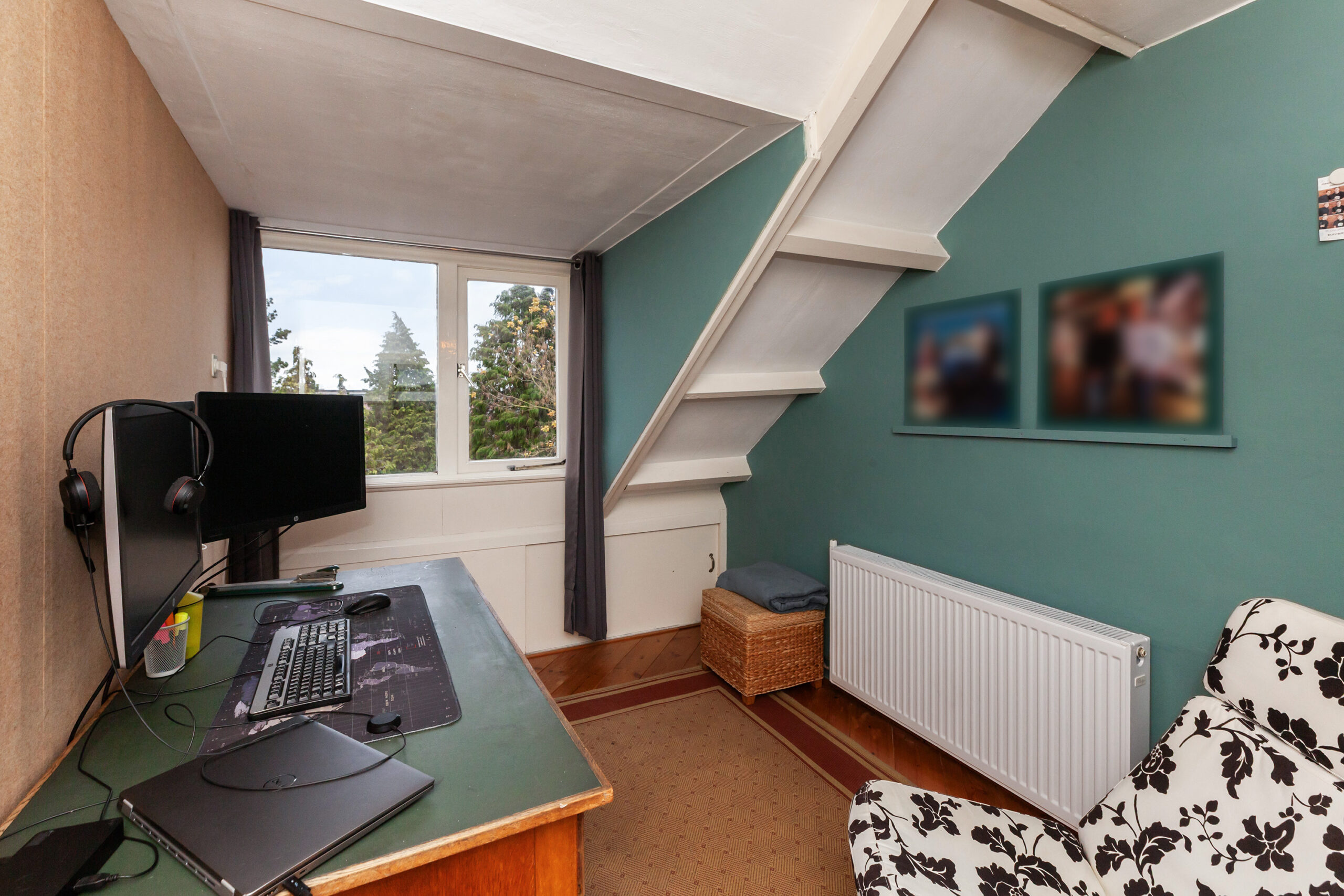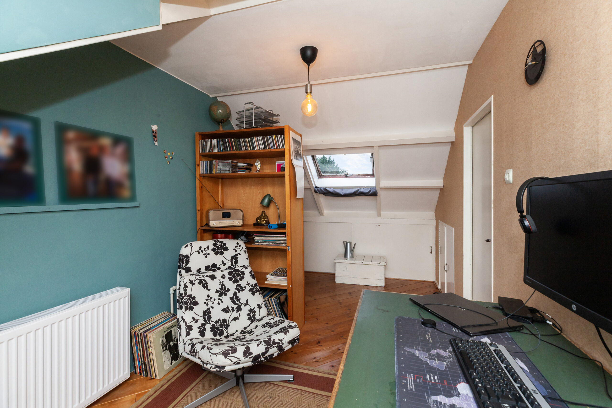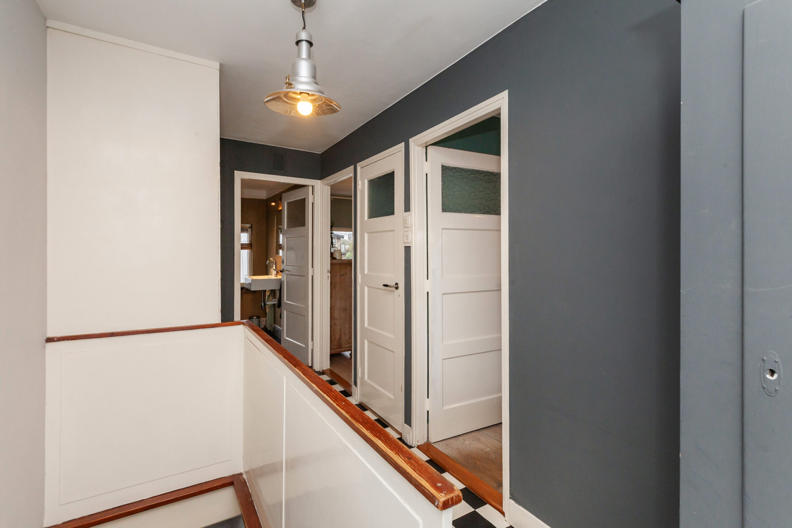 Vanaf de overloop komt u in de twee slaapkamers en badkamer. Verder is er de trap naar de tweede verdieping, inbouwkast (circa 1.51 x 0.65m) en er is er een buitendeur waar u op het platte dak van de aanbouw komt.