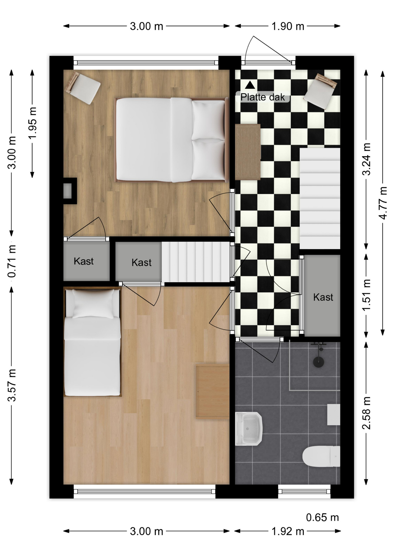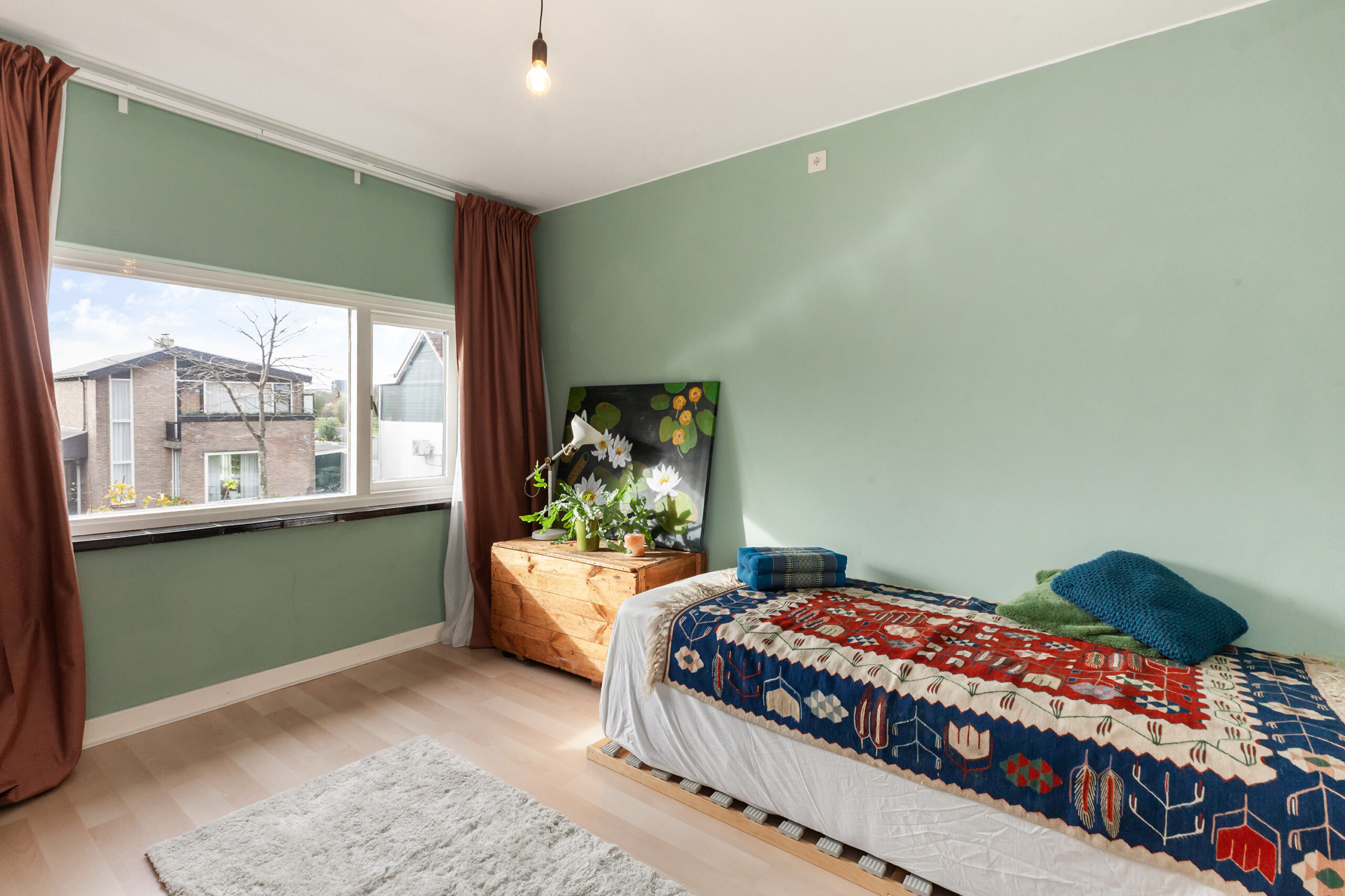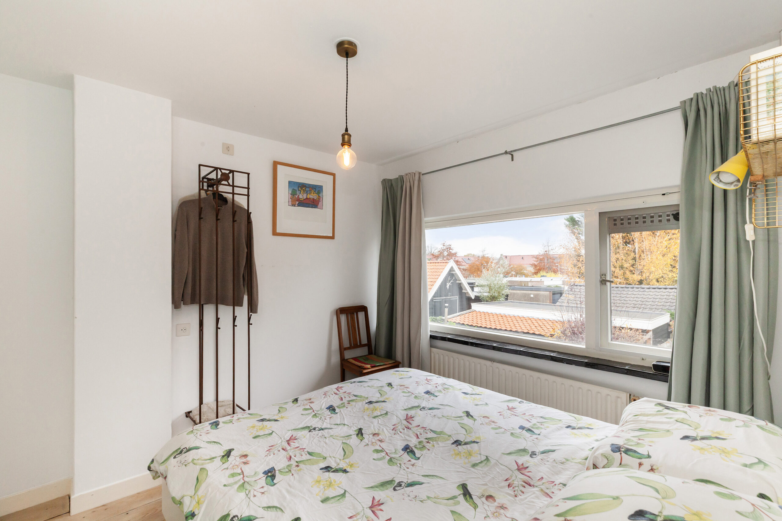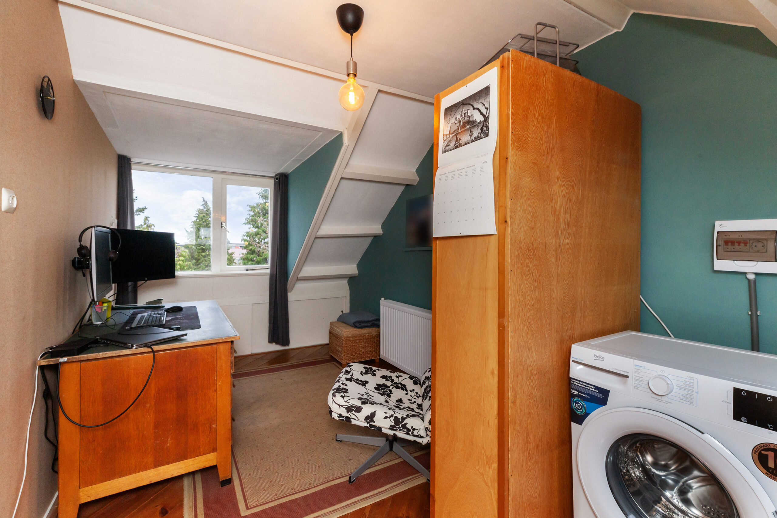 Vanaf de overloop komt u in de twee slaapkamers en badkamer. Verder is er de trap naar de tweede verdieping, inbouwkast (circa 1.51 x 0.65m) en er is er een buitendeur waar u op het platte dak van de aanbouw komt.