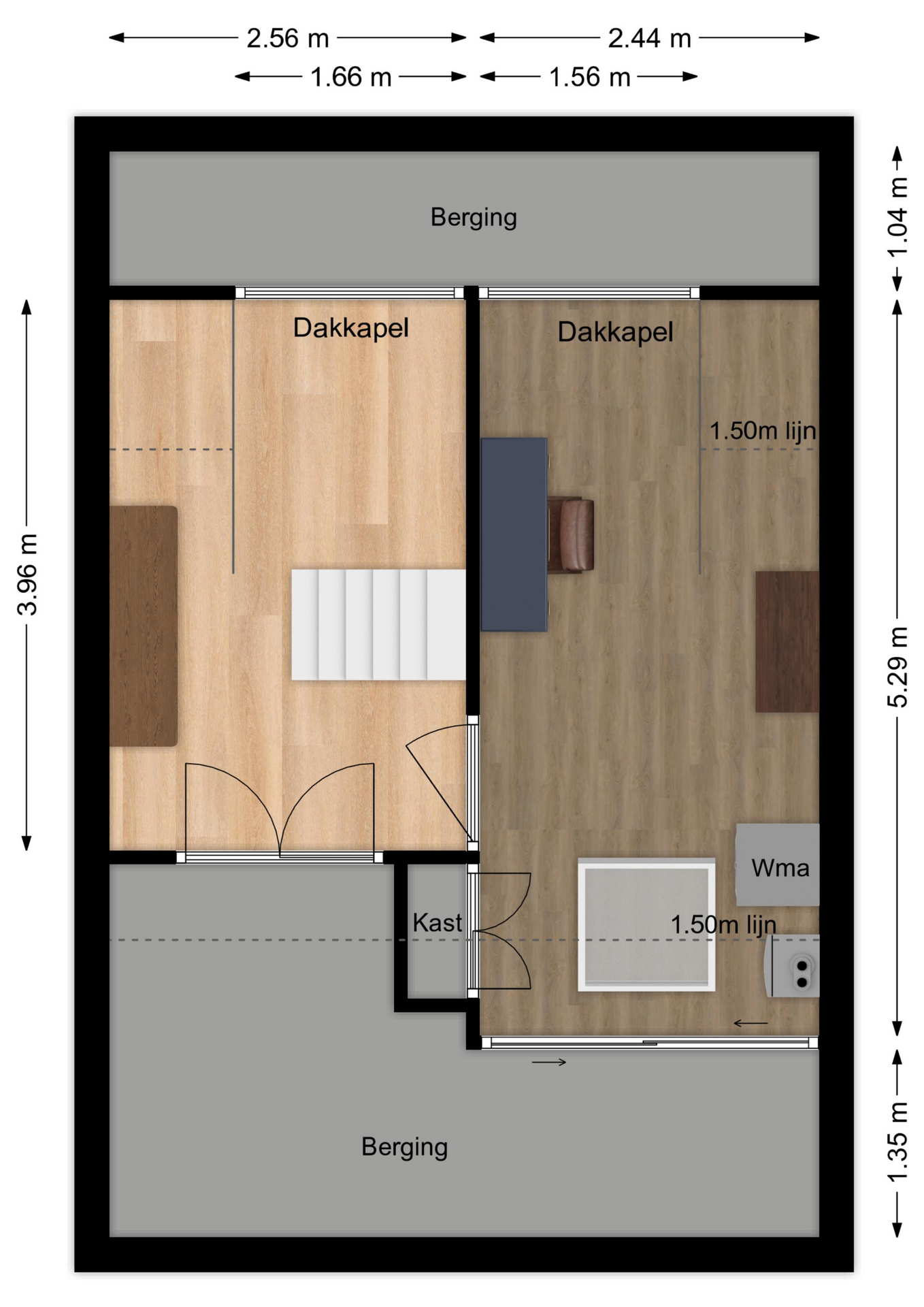 Aan de voorzijde heeft u grote inloopberging 2.56 x 2.50m. Eveneens aan de achterzijde is er bergruimte. Vanaf de overloop komt u in derde slaapkamer.