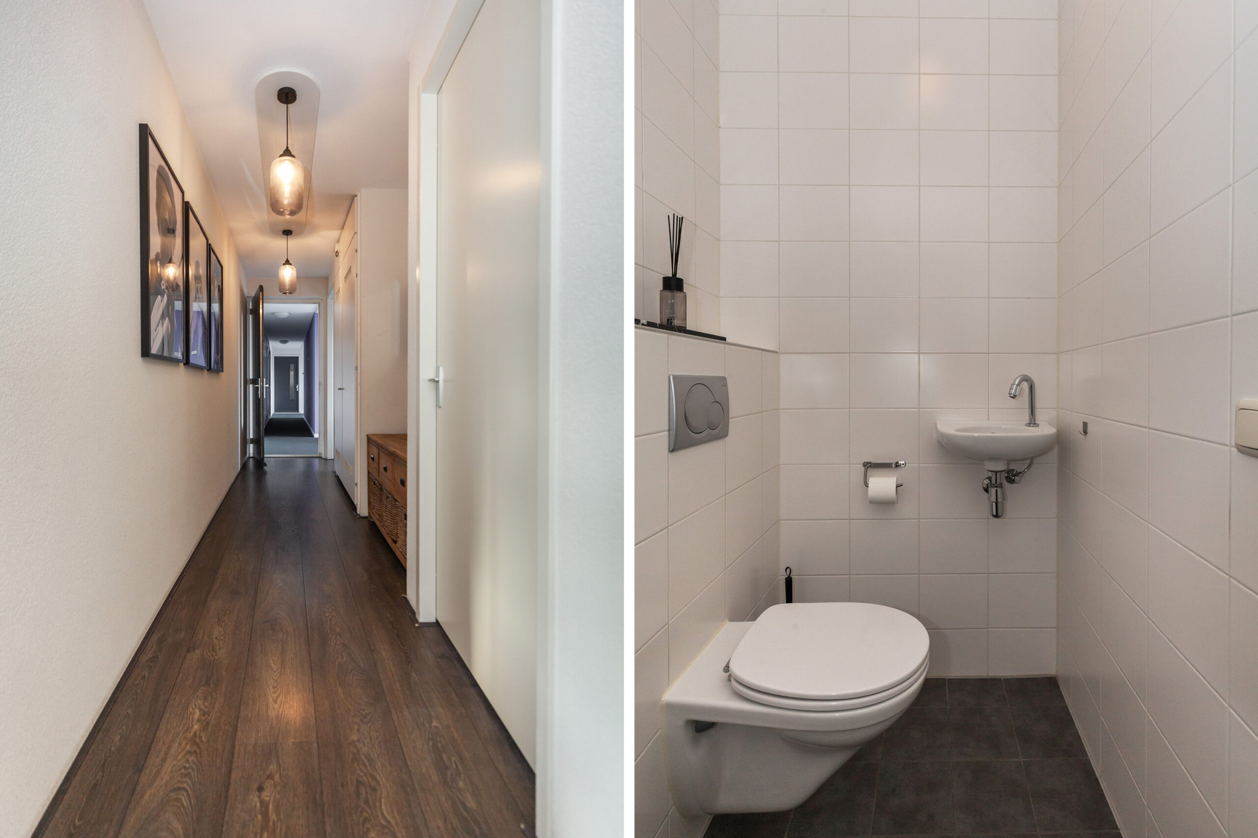 Nette toiletruimte voorzien van een vrijhangend closet en een handwasfonteintje.