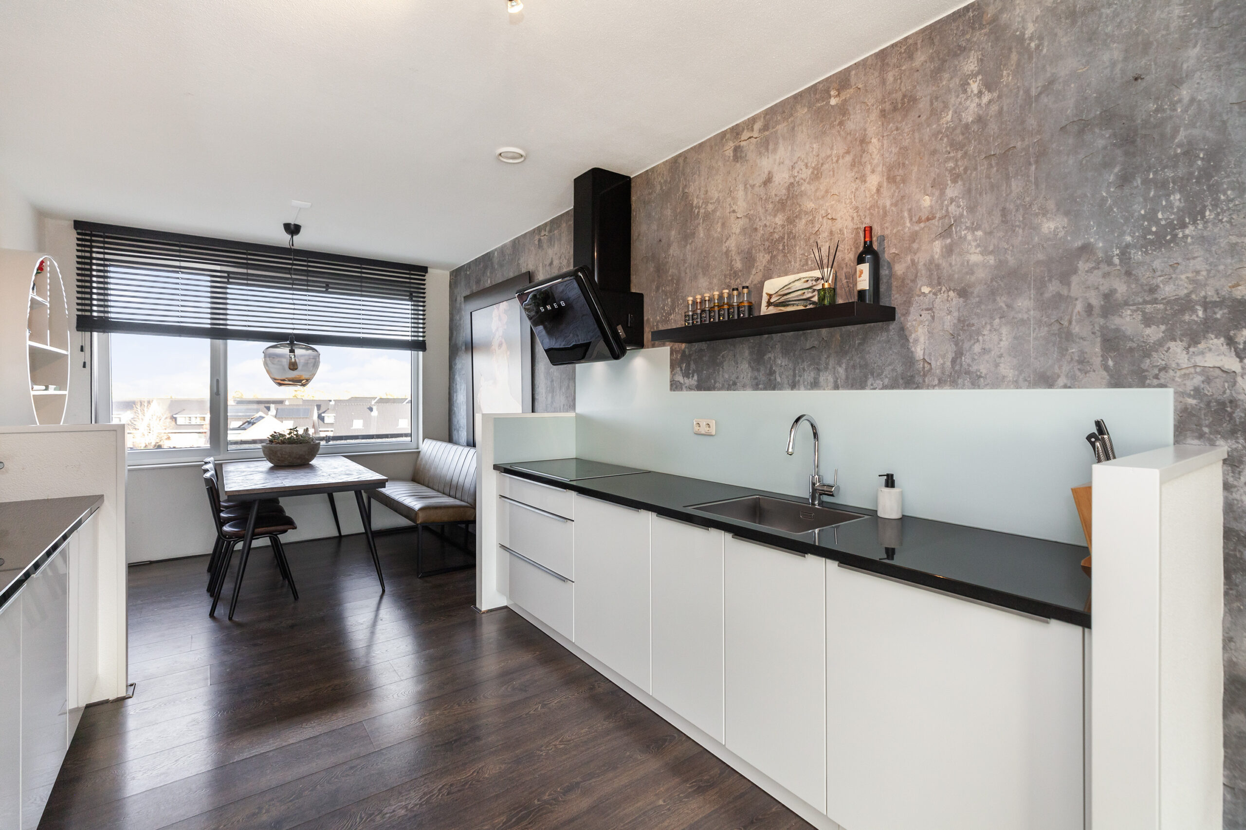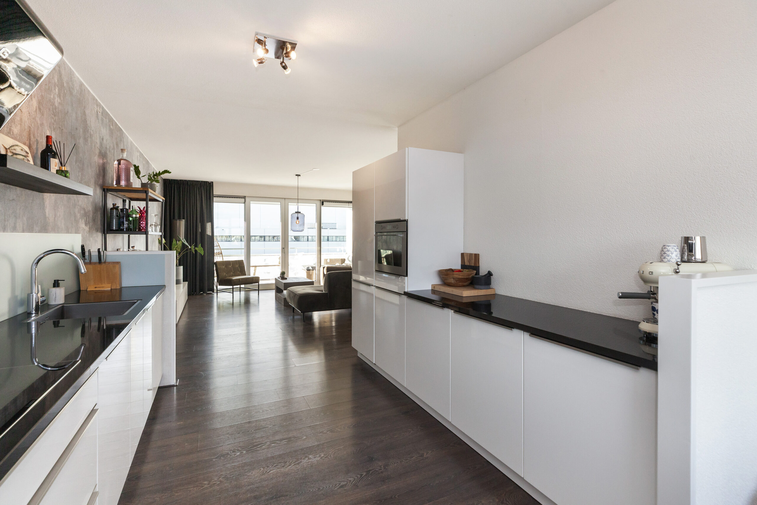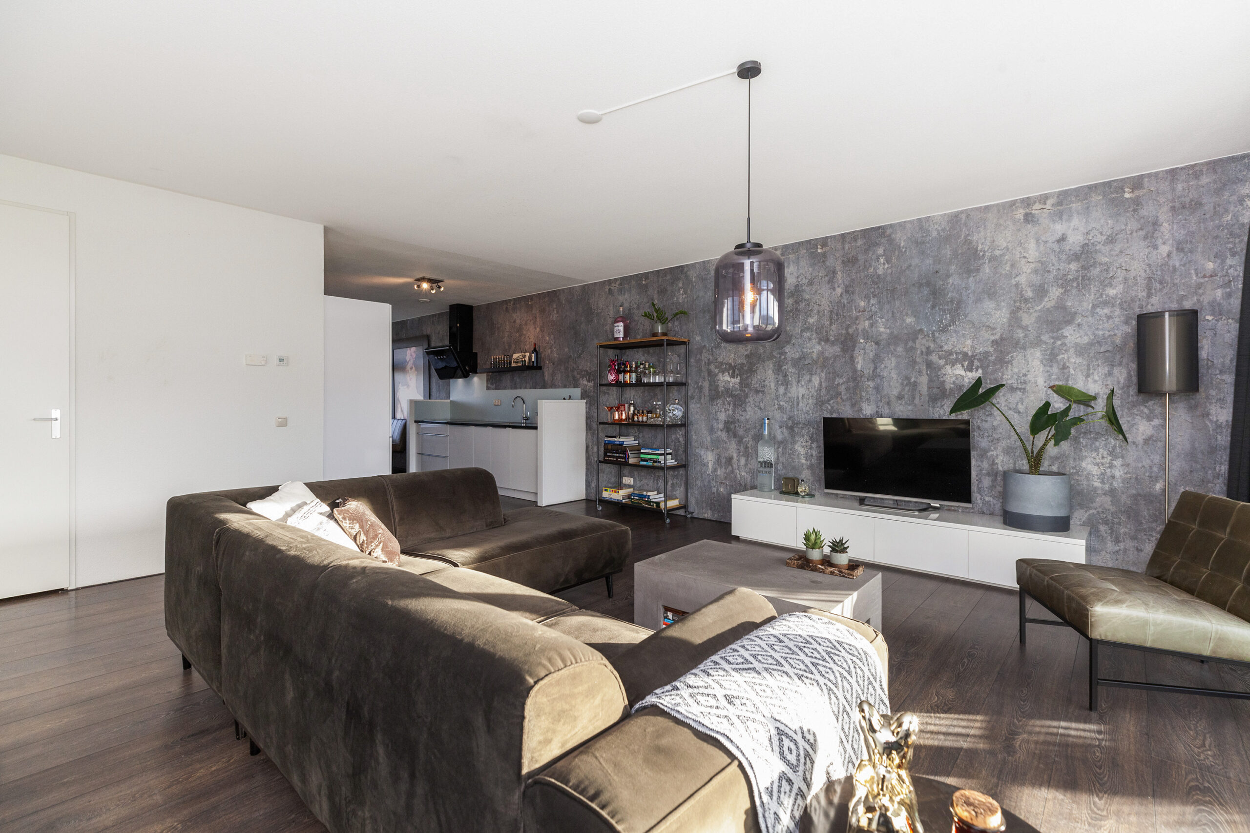 Wauw, wat een heerlijke woonkamer is dit! Het liefst neemt u direct een zit op de bank, om te genieten van deze fijne kamer. Maar ook wordt uw oog getrokken naar de raampartijen waar u leuk weg kijkt richting de rivier de Noord. Doet u de openslaande deuren open, dan loopt u zo naar de loggia (circa 5.47 x 2.22m). Aan de voorzijde loopt de woonkamer naadloos over in de keuken.