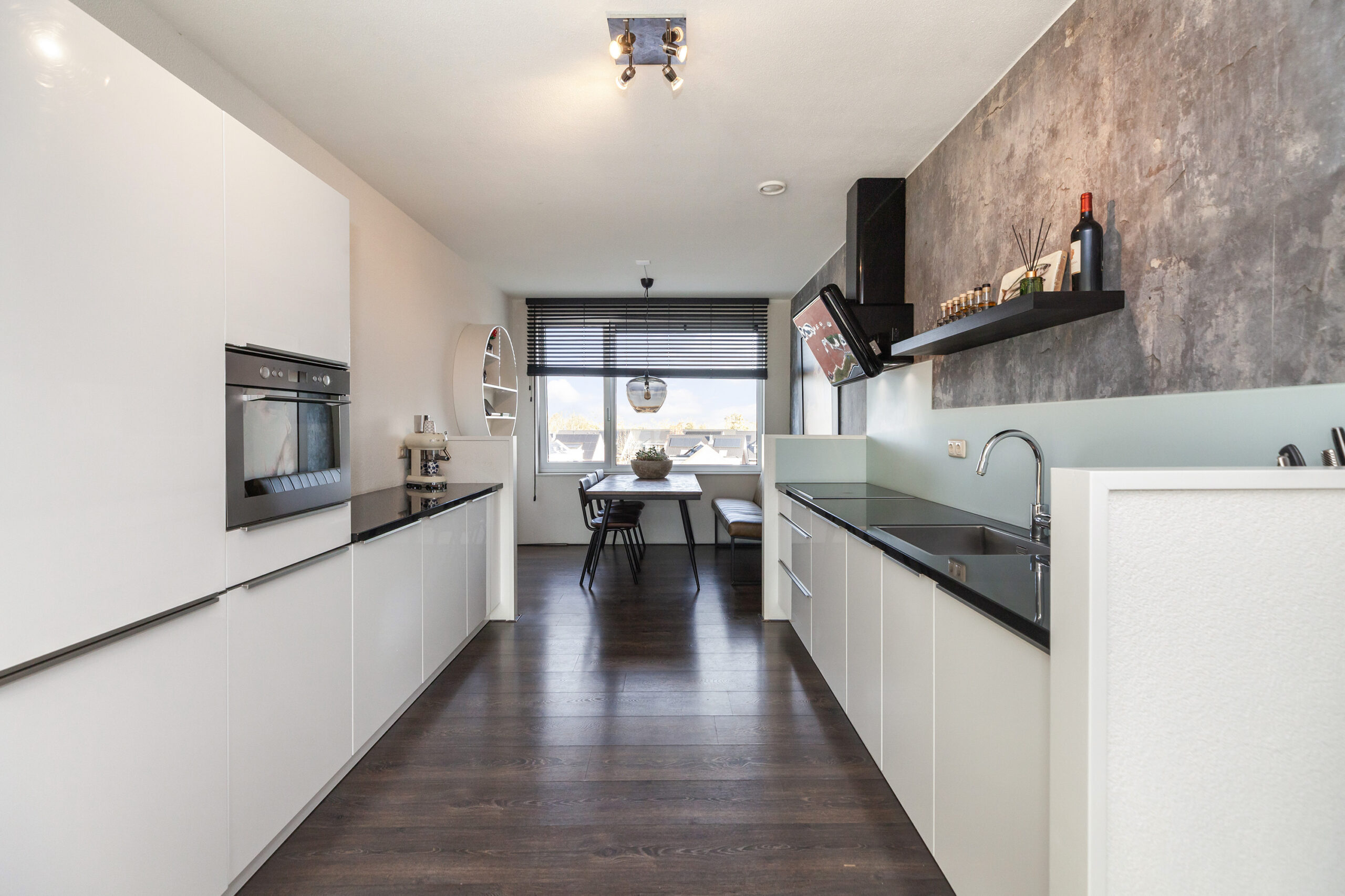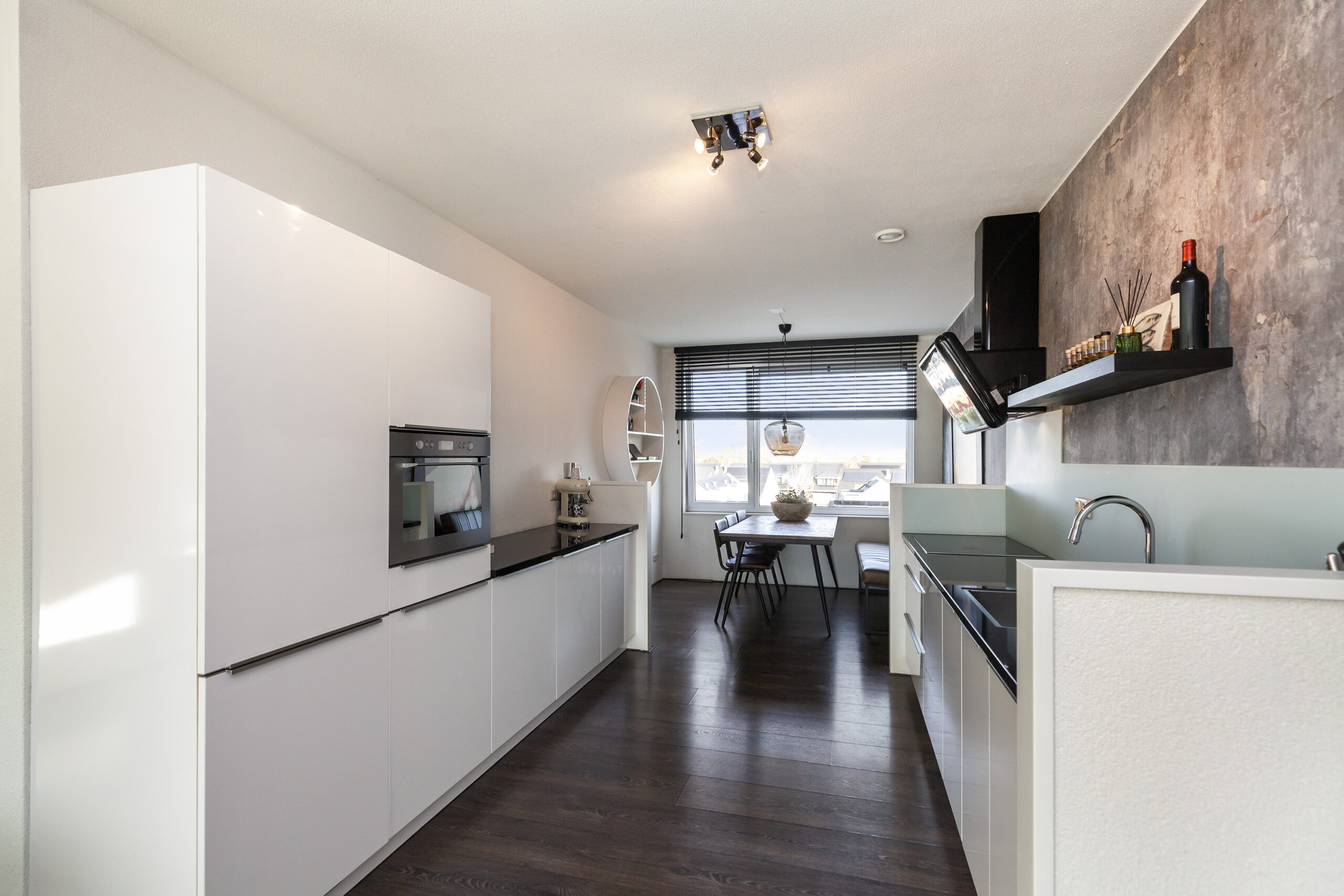 Ook in deze keuken is het oprecht genieten! Aan de ene zijde heeft u de woonkamer en aan de andere zijde vloeit deze over naar de eetkamer. Wonen, koken, dineren en lang tafelen gaan hier absoluut hand in hand! Vanuit de eetkamer kijkt u leuk weg over de woonwijk. De keuken zelf is in een moderne hoogglans opstelling aan beide zijden geplaatst. Aan inbouwapparatuur heeft u de beschikking over een inductiekookplaat met recirculatie afzuiging, koel-/vriescombinatie, combimagnetron en vaatwasser. Oftewel alle gemak voor het bereiden van de lekkerste maaltijden!