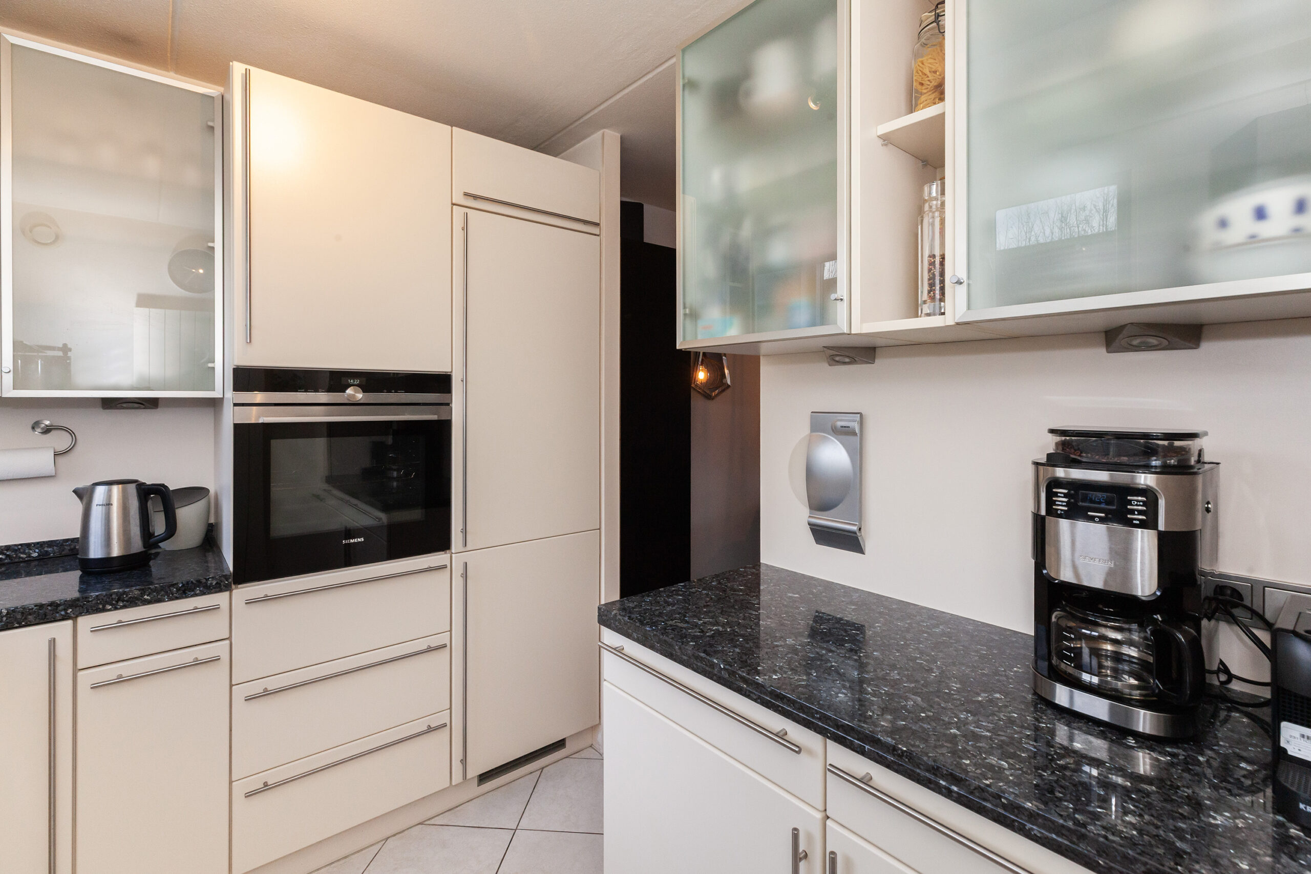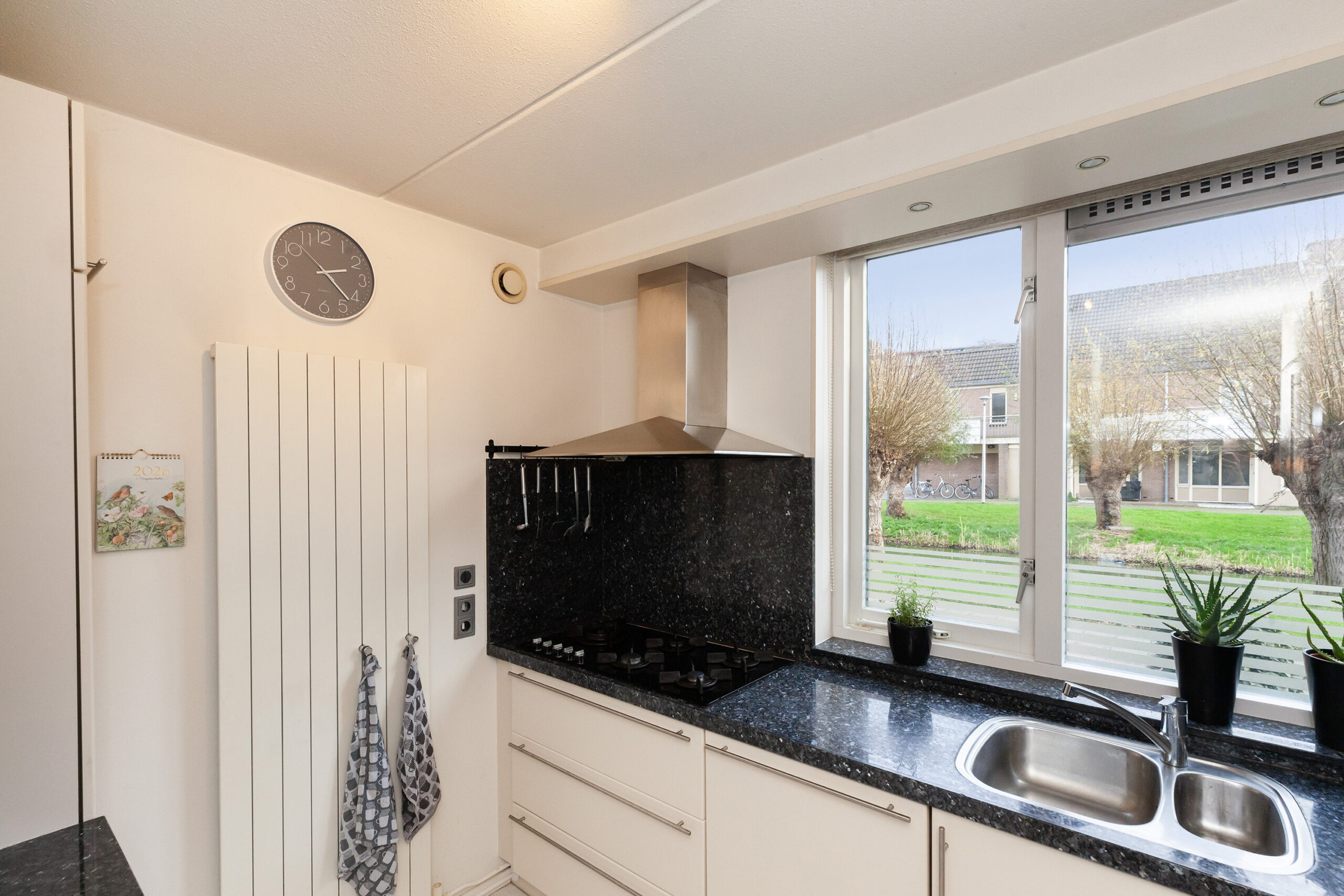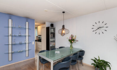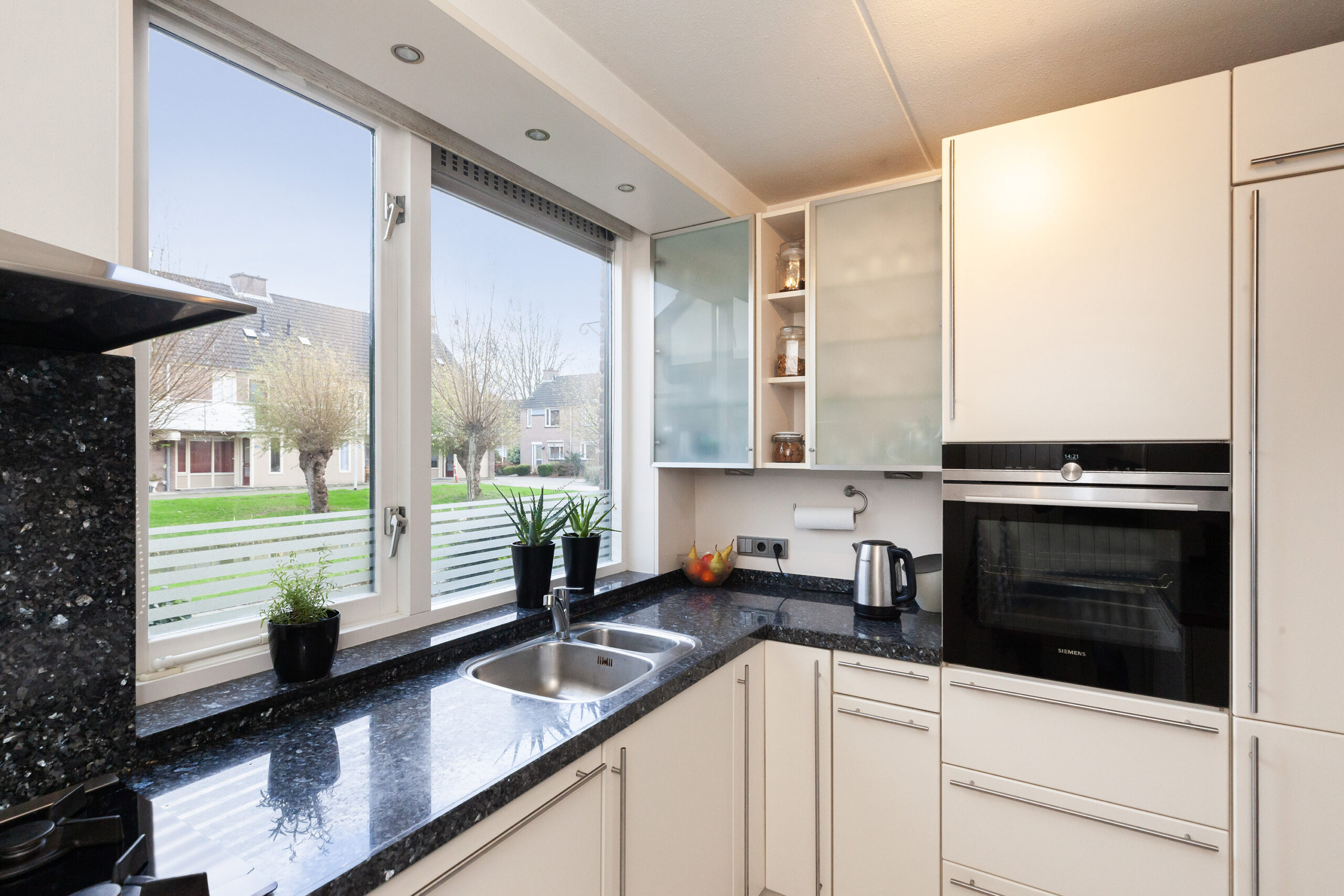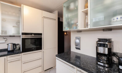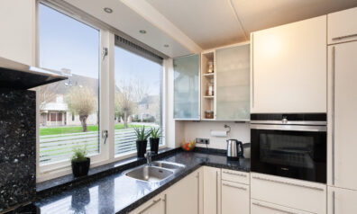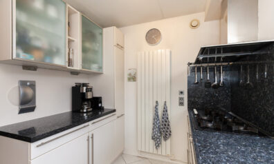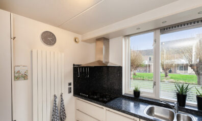 Aan de voorzijde is de keuken gesitueerd waar u leuk zicht heeft over de voorgelegen groenstrook. De keuken is praktisch opgesteld met een graniet aanrechtblad. Aan inbouwapparatuur heeft u de beschikking over 5-pits gaskookplaat, afzuigkap, vaatwasser, oven en een koel-/vriescombinatie.