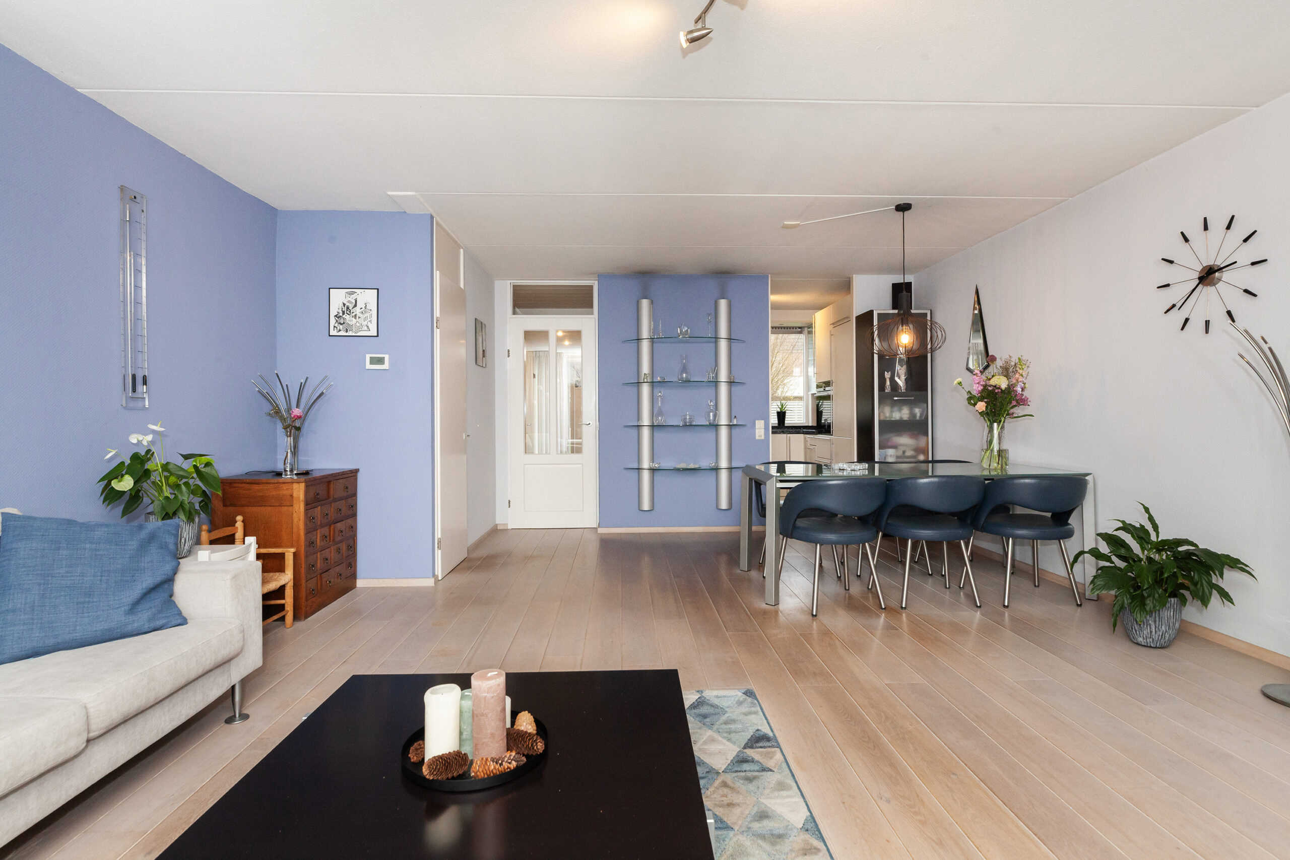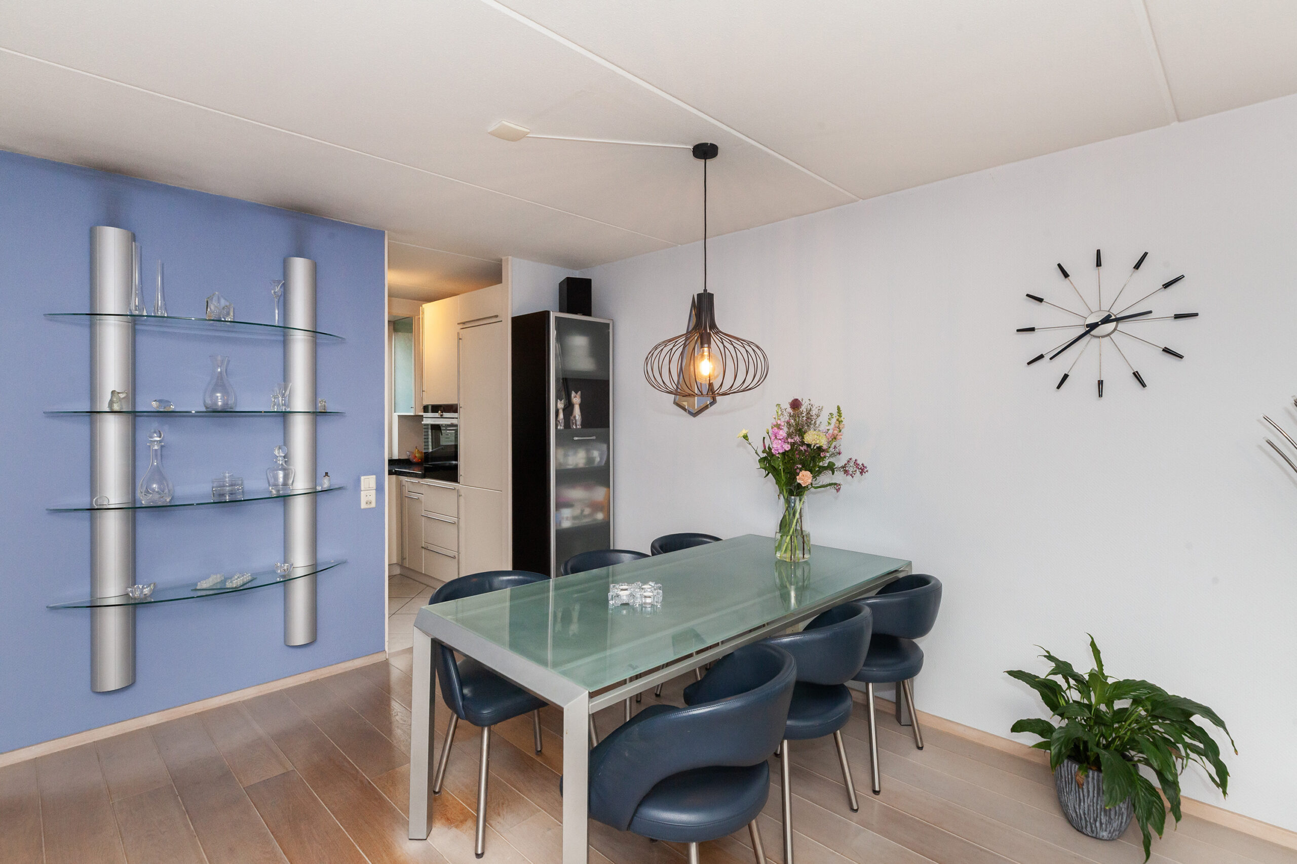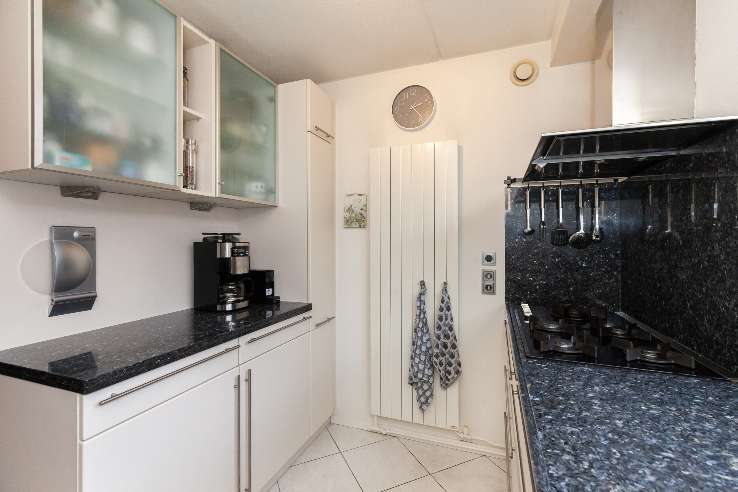 Aan de voorzijde is de keuken gesitueerd waar u leuk zicht heeft over de voorgelegen groenstrook. De keuken is praktisch opgesteld met een graniet aanrechtblad. Aan inbouwapparatuur heeft u de beschikking over 5-pits gaskookplaat, afzuigkap, vaatwasser, oven en een koel-/vriescombinatie.