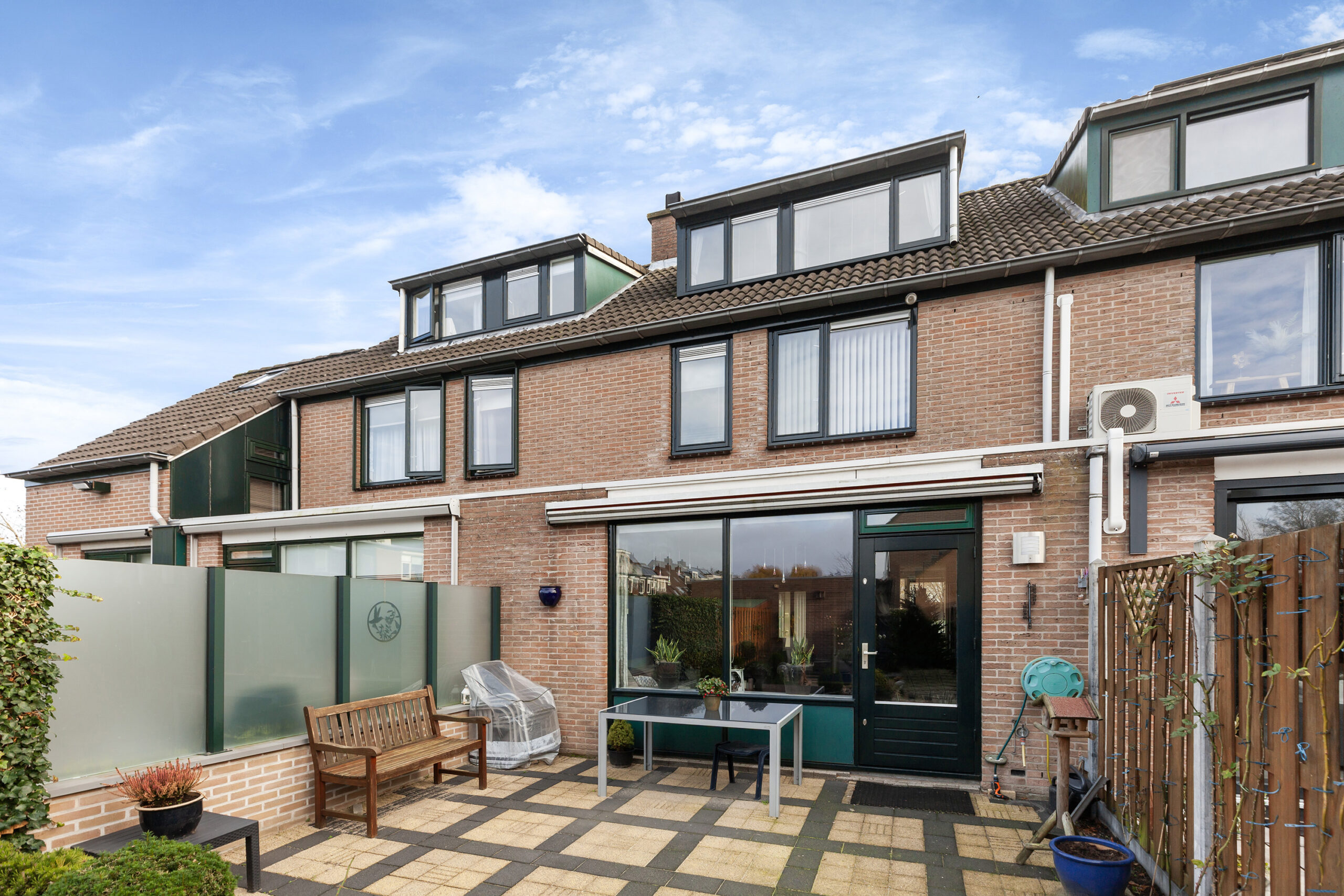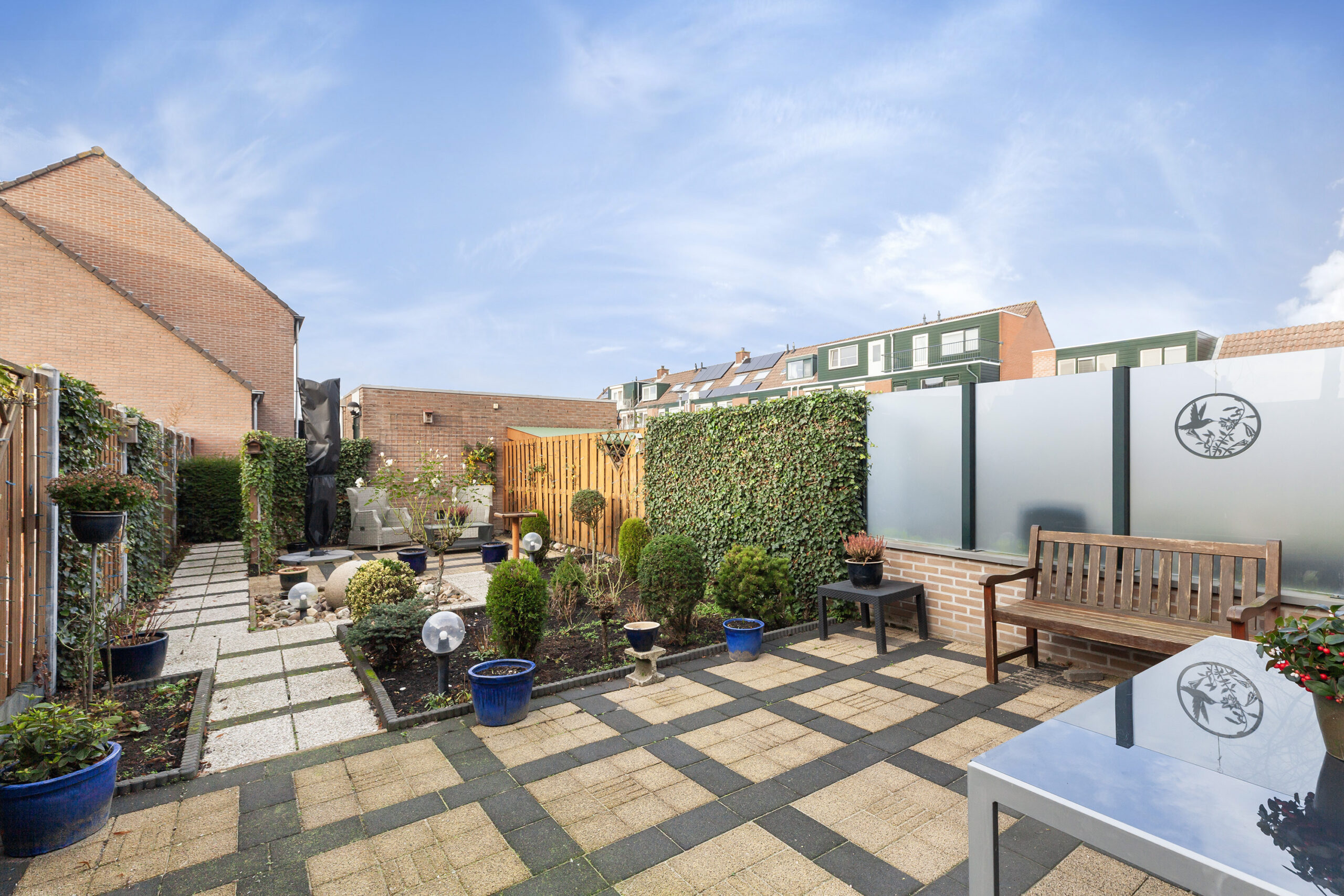 Met een achtertuin gericht op het noordwesten en zo’n 18 meter diep is het hier goed vertoeven. De tuin is aangelegd met een terras achter de woning waar ook een zonnescherm aanwezig is. Maar ook als u verder loopt in de tuin heeft u een leuk terras waar het heerlijk genieten is.