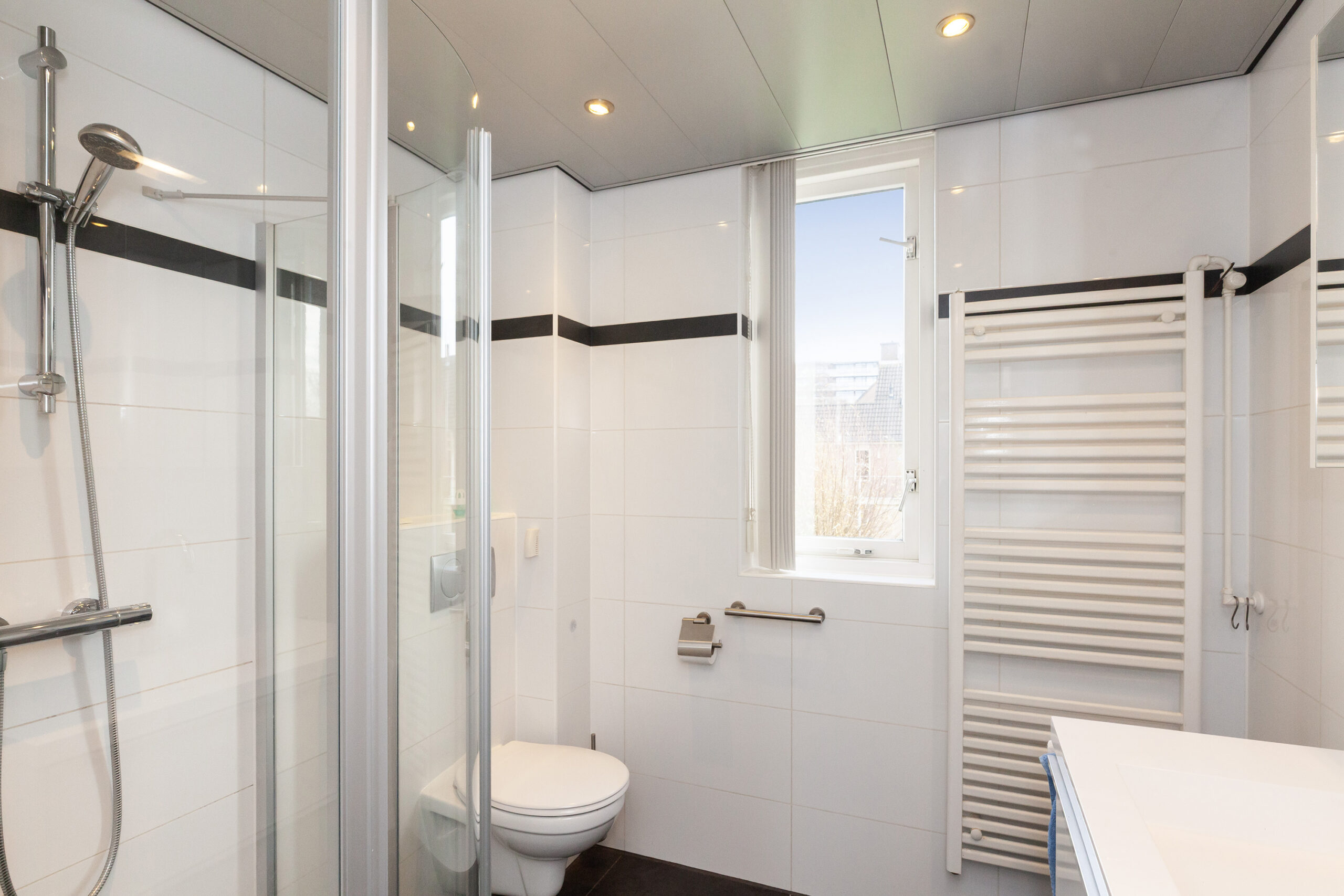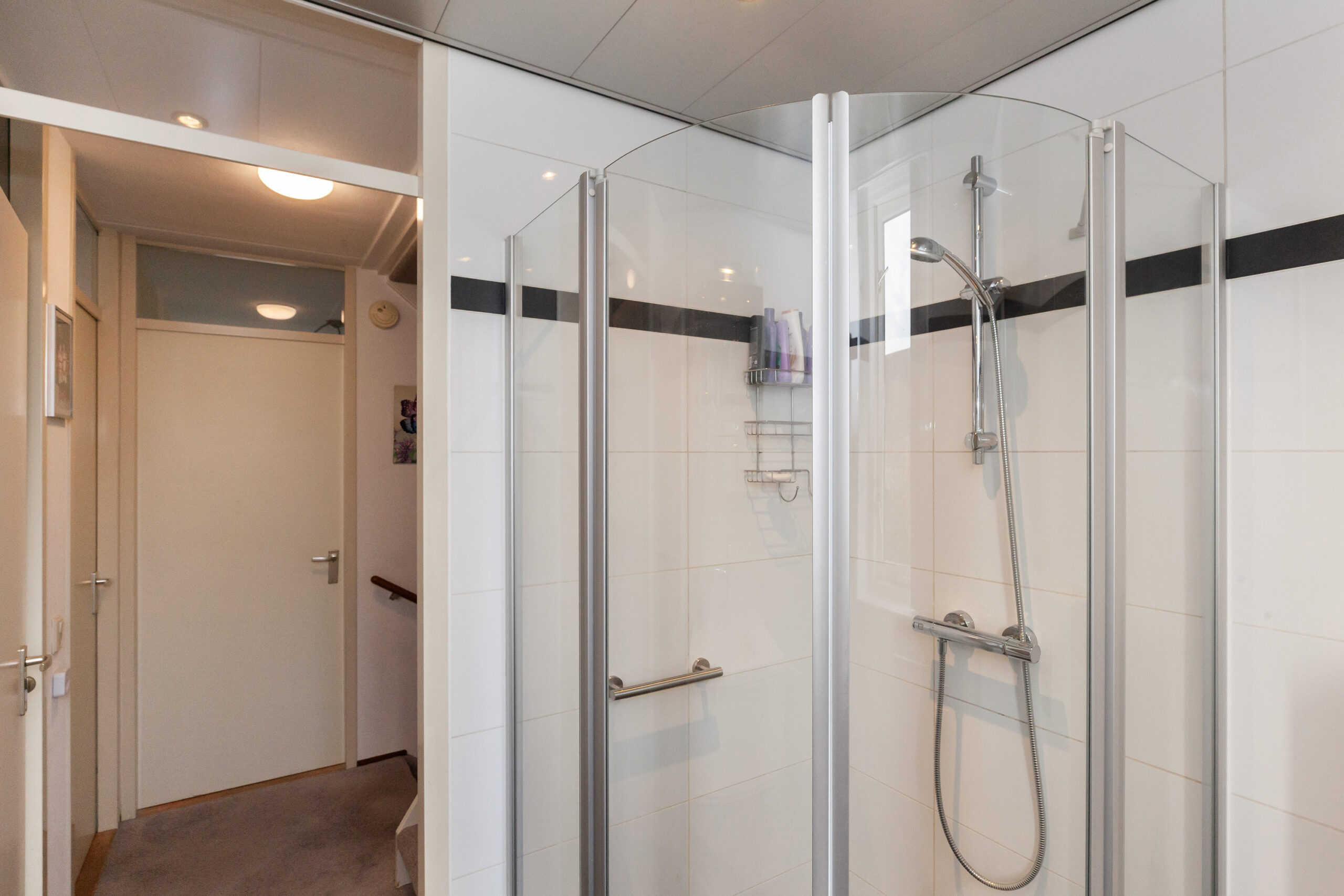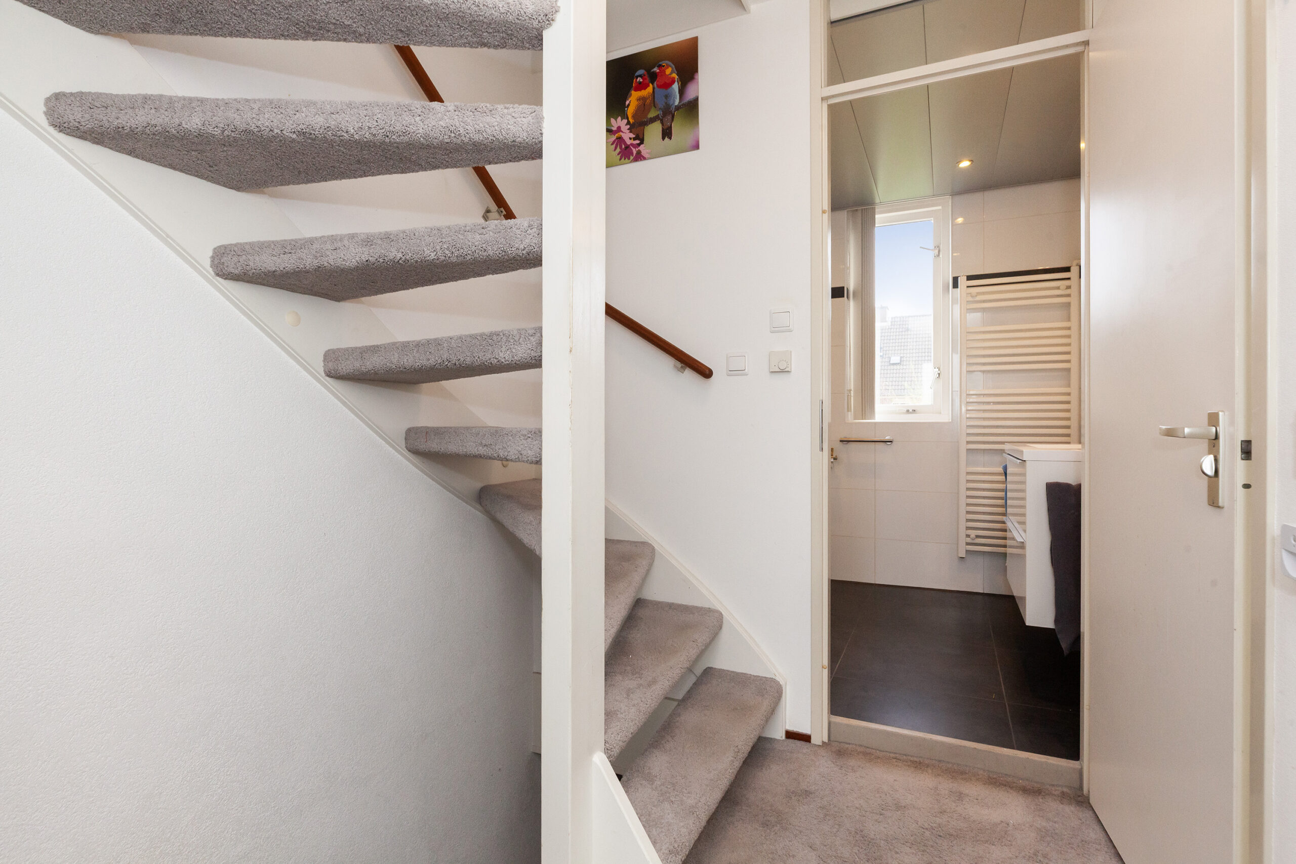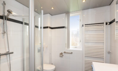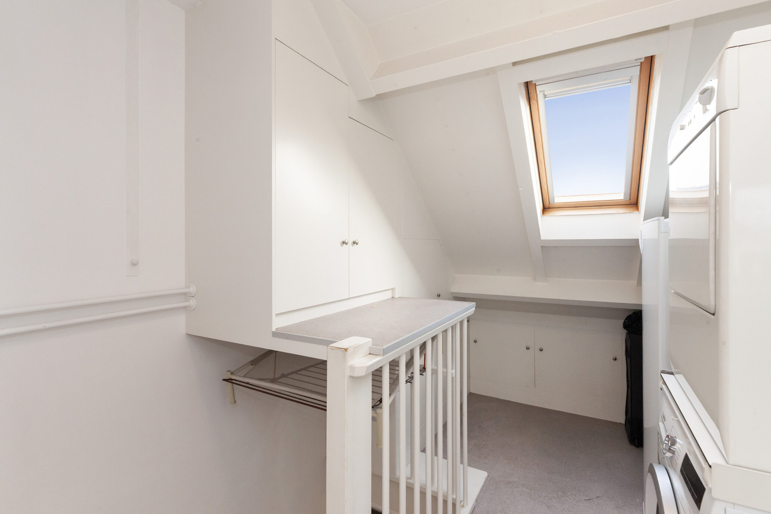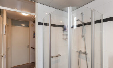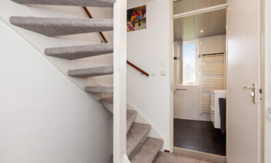 De toiletruimte is voorzien van een vrijhangend closet en een handwasfonteintje. Tevens is er een luik naar een kleine bergzolder.