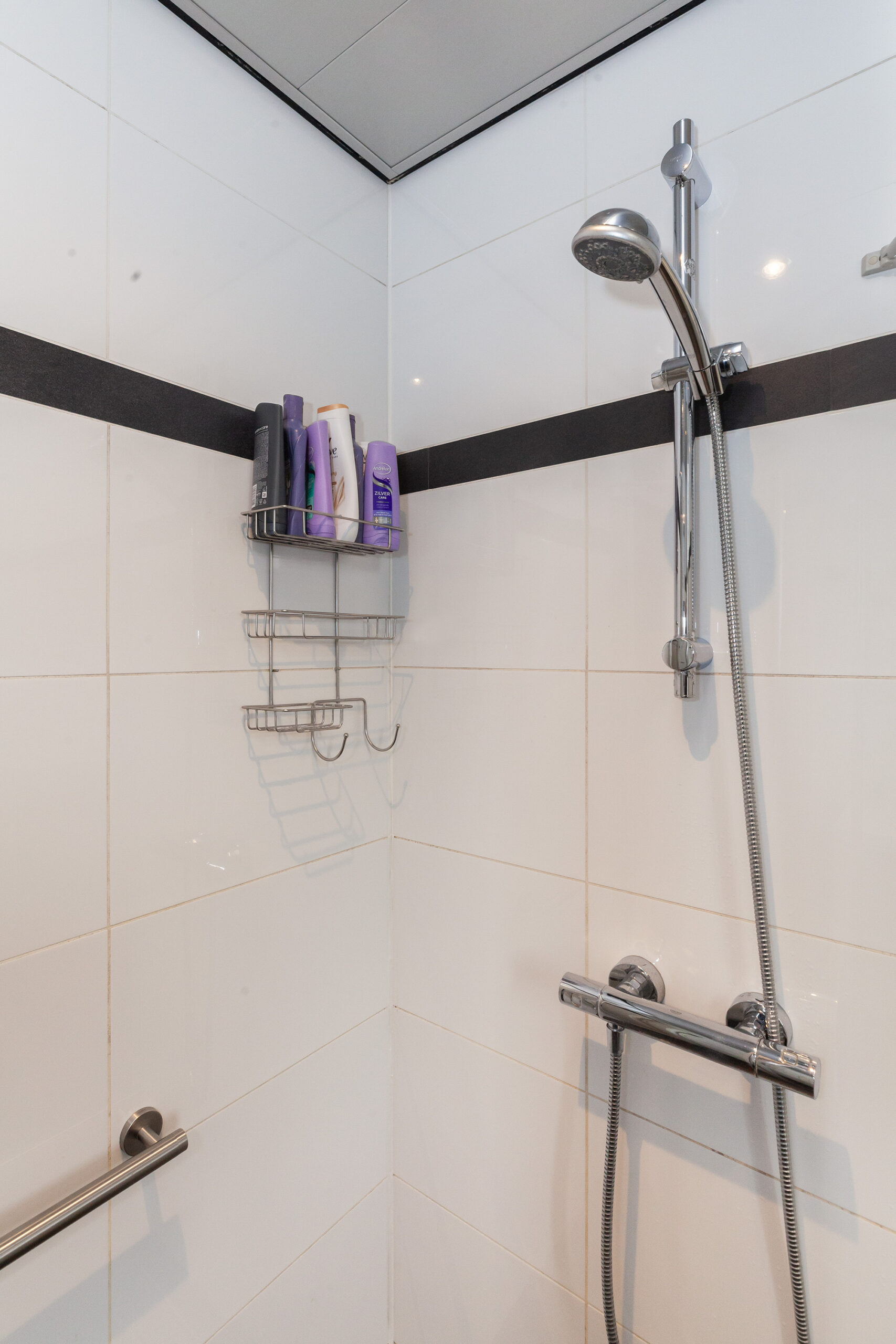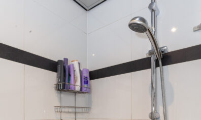 De badkamer treft u aan de voorzijde en uitgevoerd in een contrasterende kleurstelling. Er is een inloopdouche, wastafelmeubel en een toilet.