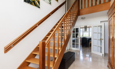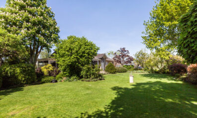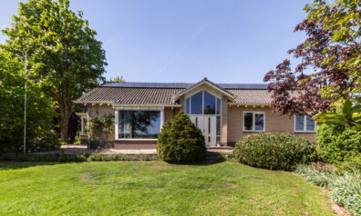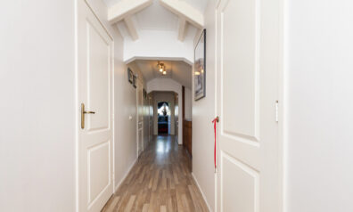 We passeren het ijzeren hek en lopen over de brede oprijlaan, van circa 30 meter, met grind naar de entree aan de voorzijde. De oprijlaan biedt plaats aan meerdere auto’s. De dubbele openslaande deuren nodigen u uit om binnen te komen. Liever achterom? Dat doet u via de poort naast de garage.