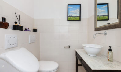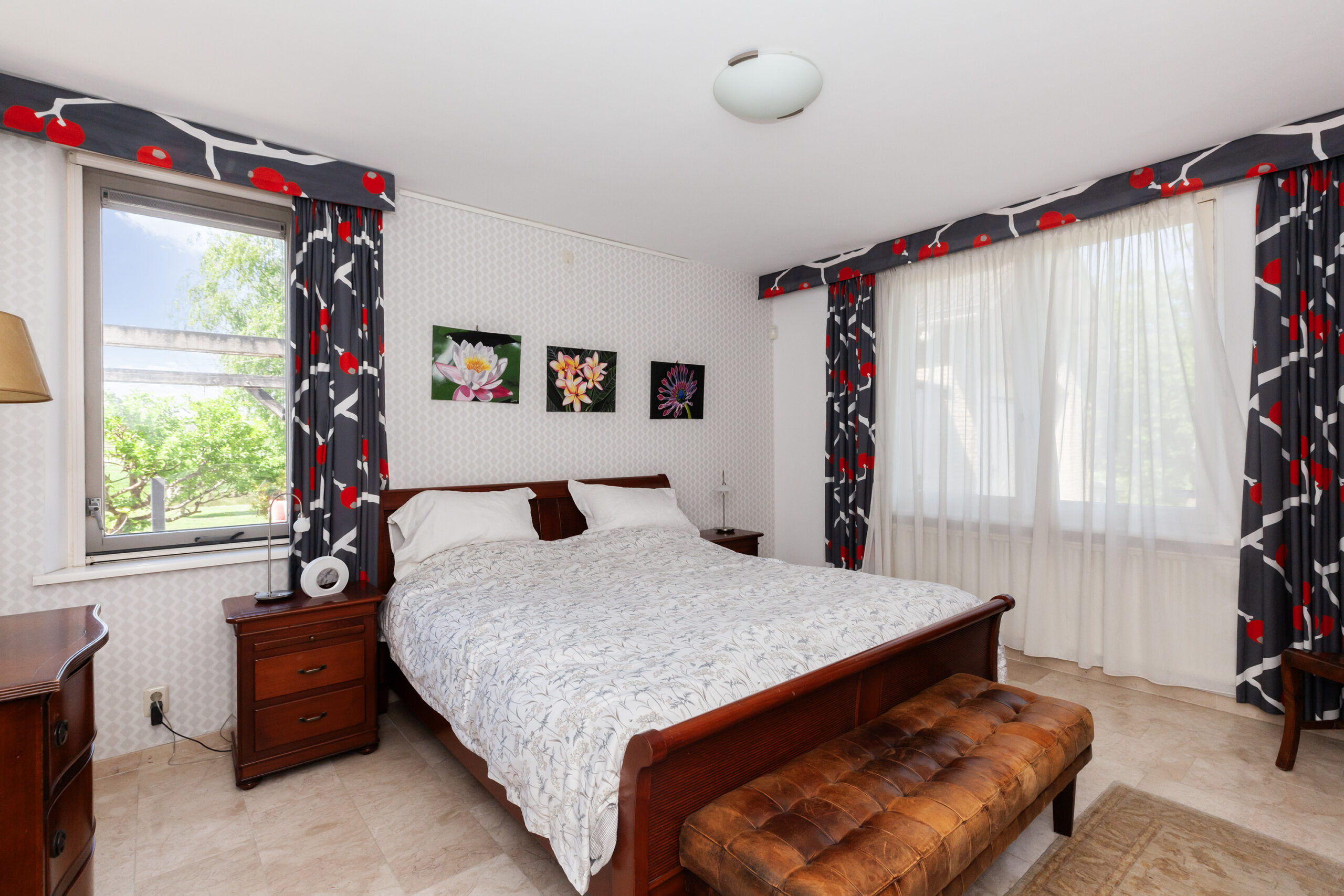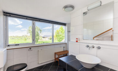 De master bedroom treft u aan het einde van de gang. De kamer is voorzien van een infraroodpaneel (ter overname) en inbouwkasten met schuifdeuren. Kunt u het zich voorstellen? Wakker worden met fluitende vogeltjes in de vroege ochtend?