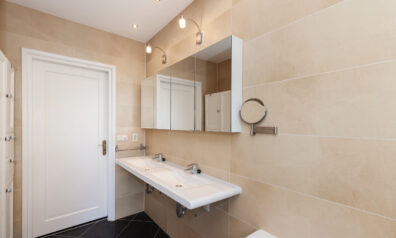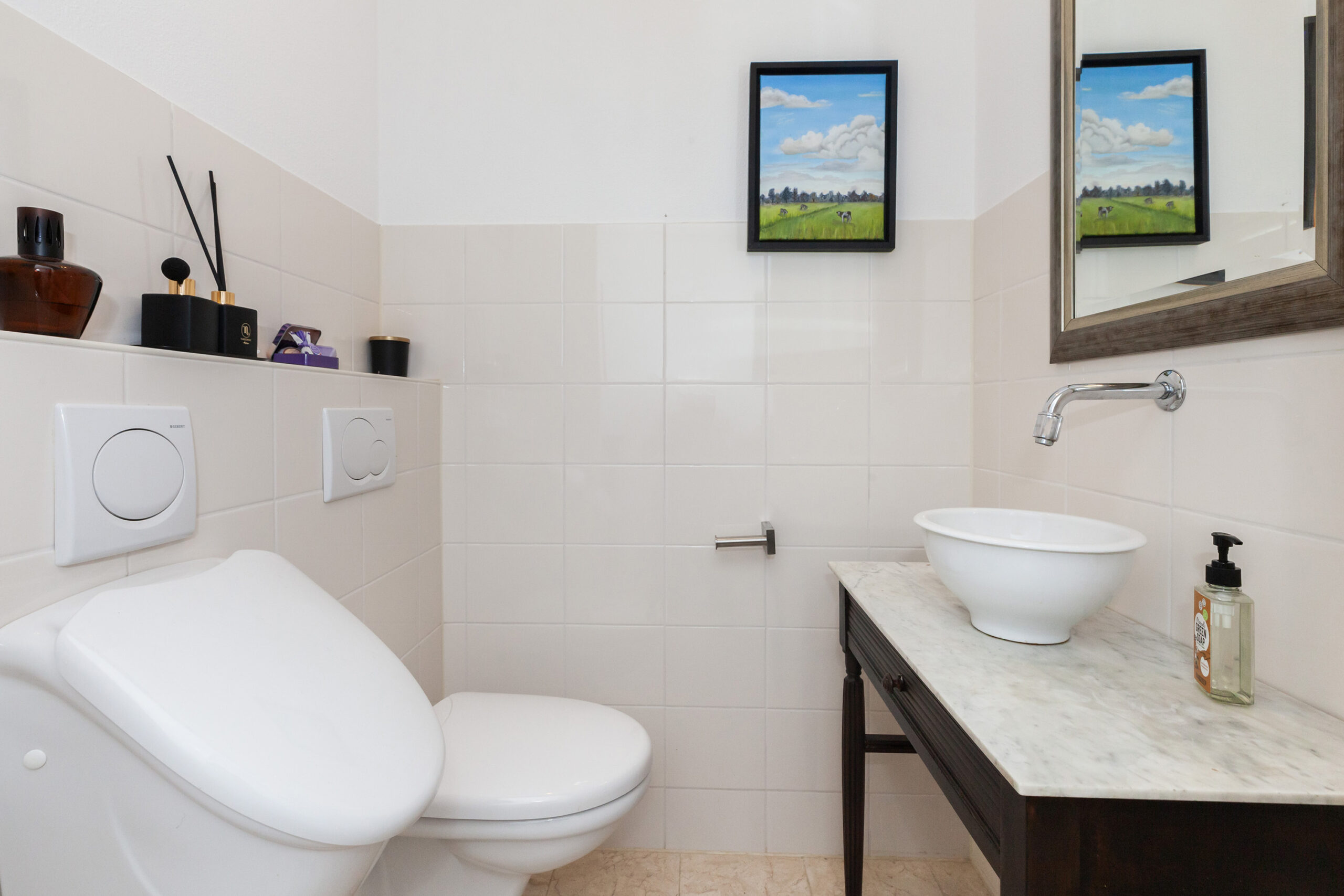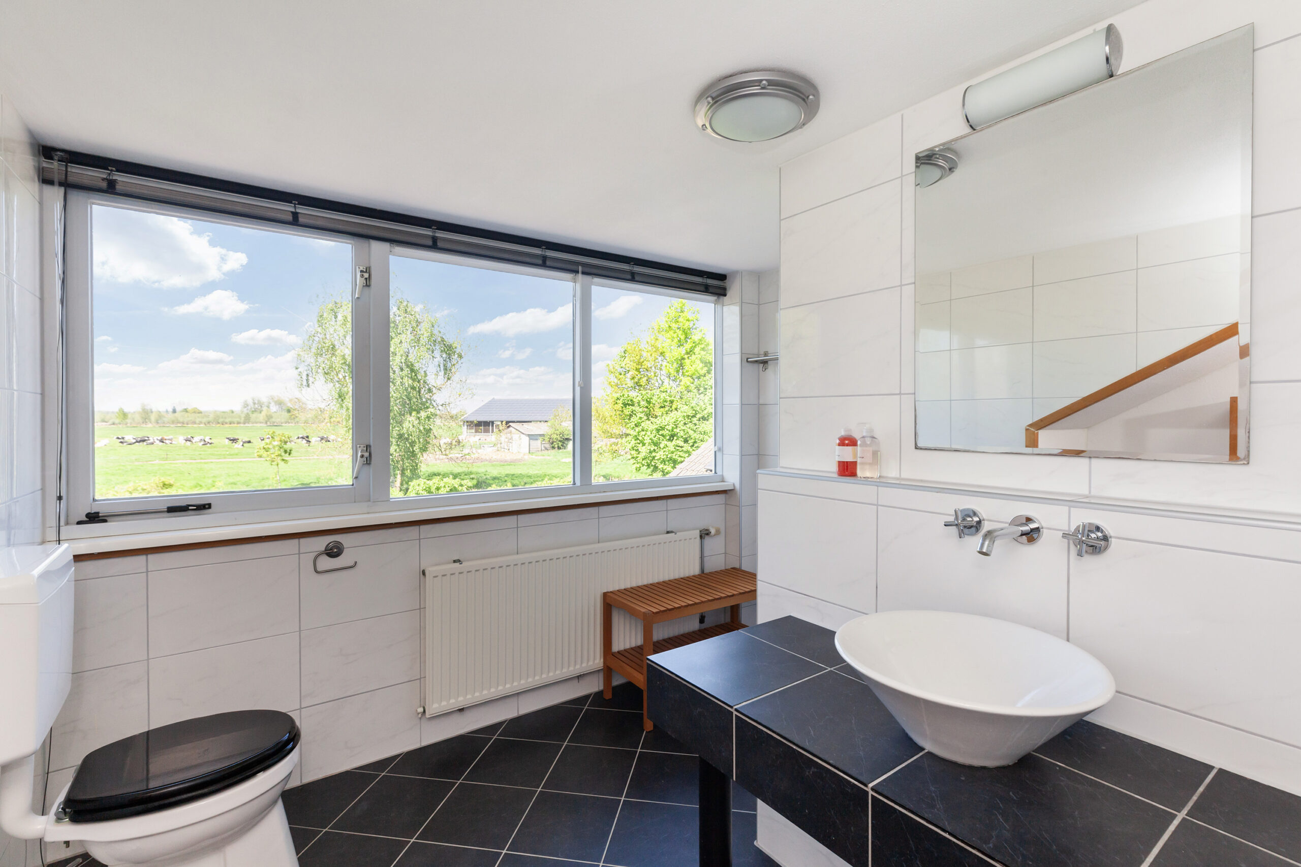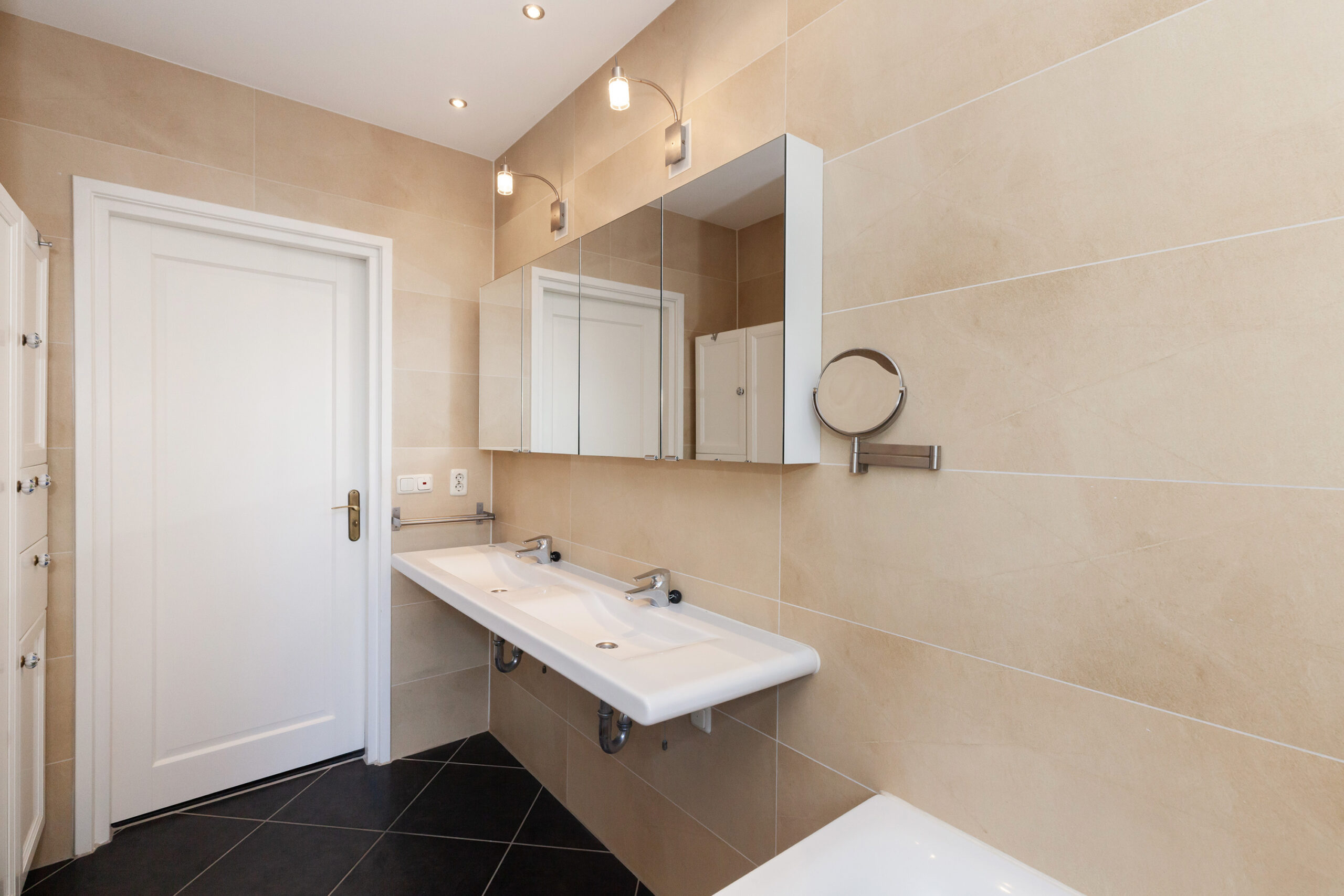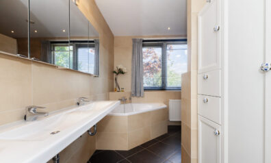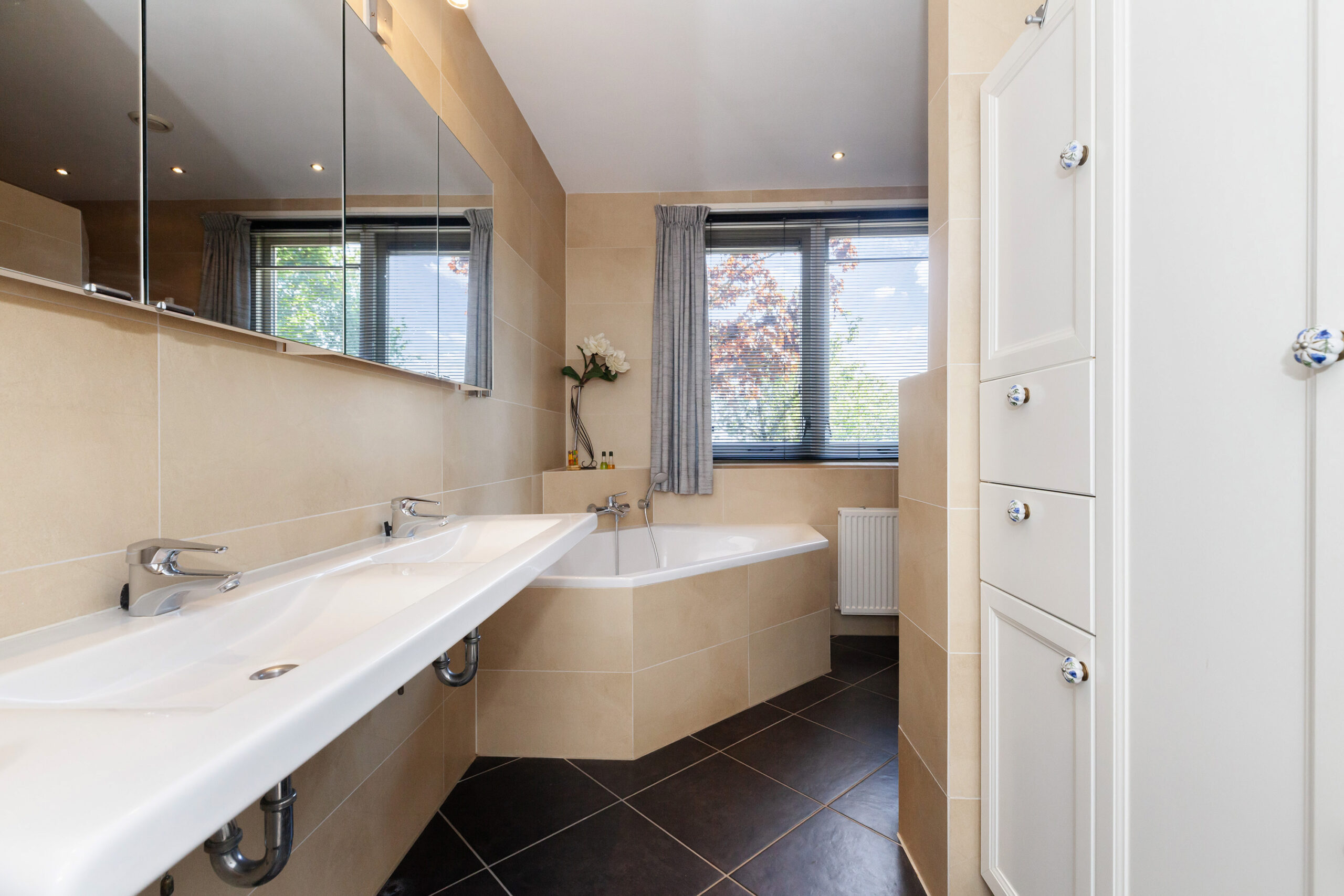 De geheel betegelde badkamer voorziet u in alle gemak. Naast een ligbad, is er ook een inloopdouche, dubbele wastafel, separaat toilet en een design radiator.