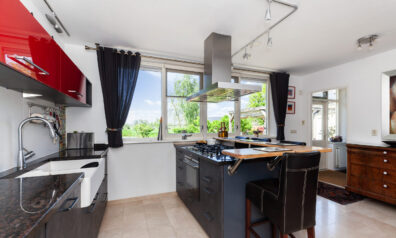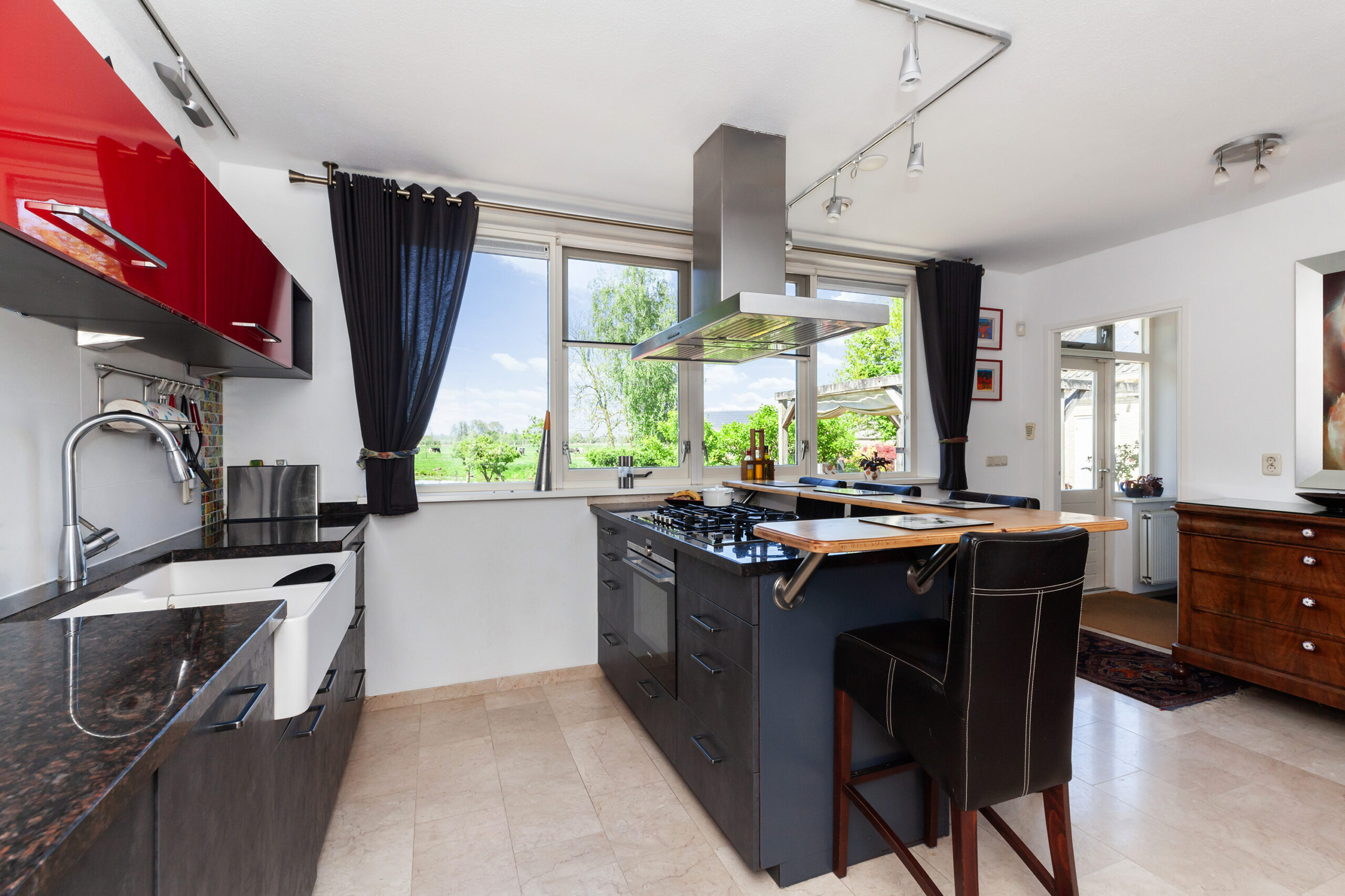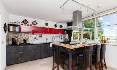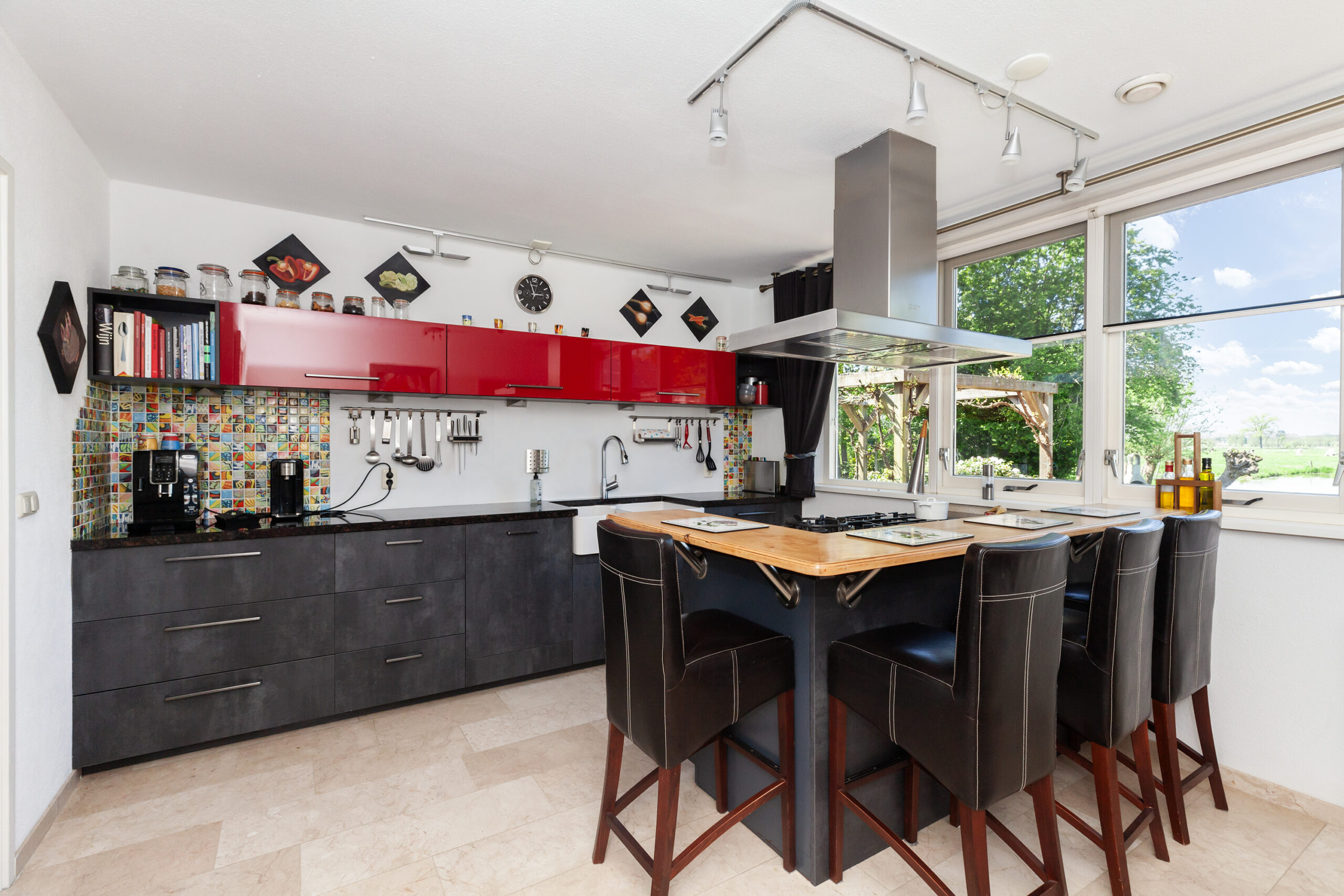 Vanuit de hal kunnen we door de openslaande deuren naar de woonkeuken. De keuken bestaat uit een rechte opstelling met spoelbak, vaatwasser en diverse keukenkasten/-lades. Aan het schier-/kookeiland heeft u een 4-pits gaskookplaat met wokbrander, afzuigkap en een oven. Plaats rondom een paar barkrukken en u geniet van ontbijt en drinkt gemakkelijk even een kopje koffie. Via de keuken komt u in de naastgelegen bijkeuken.