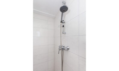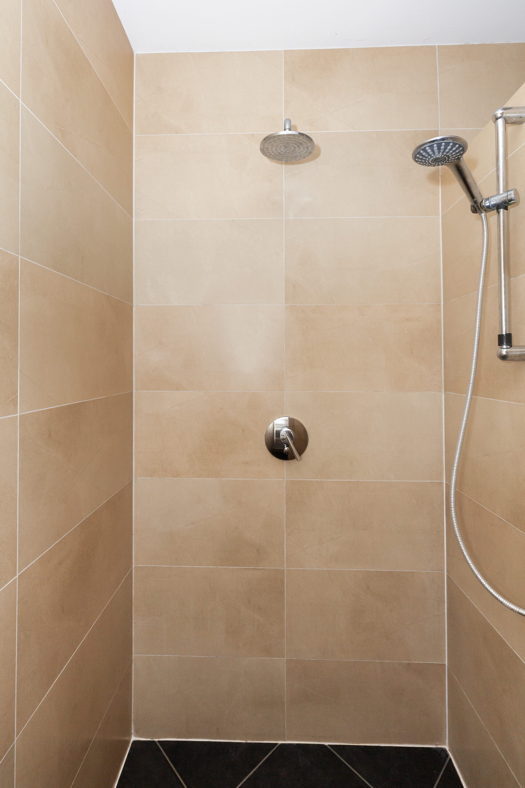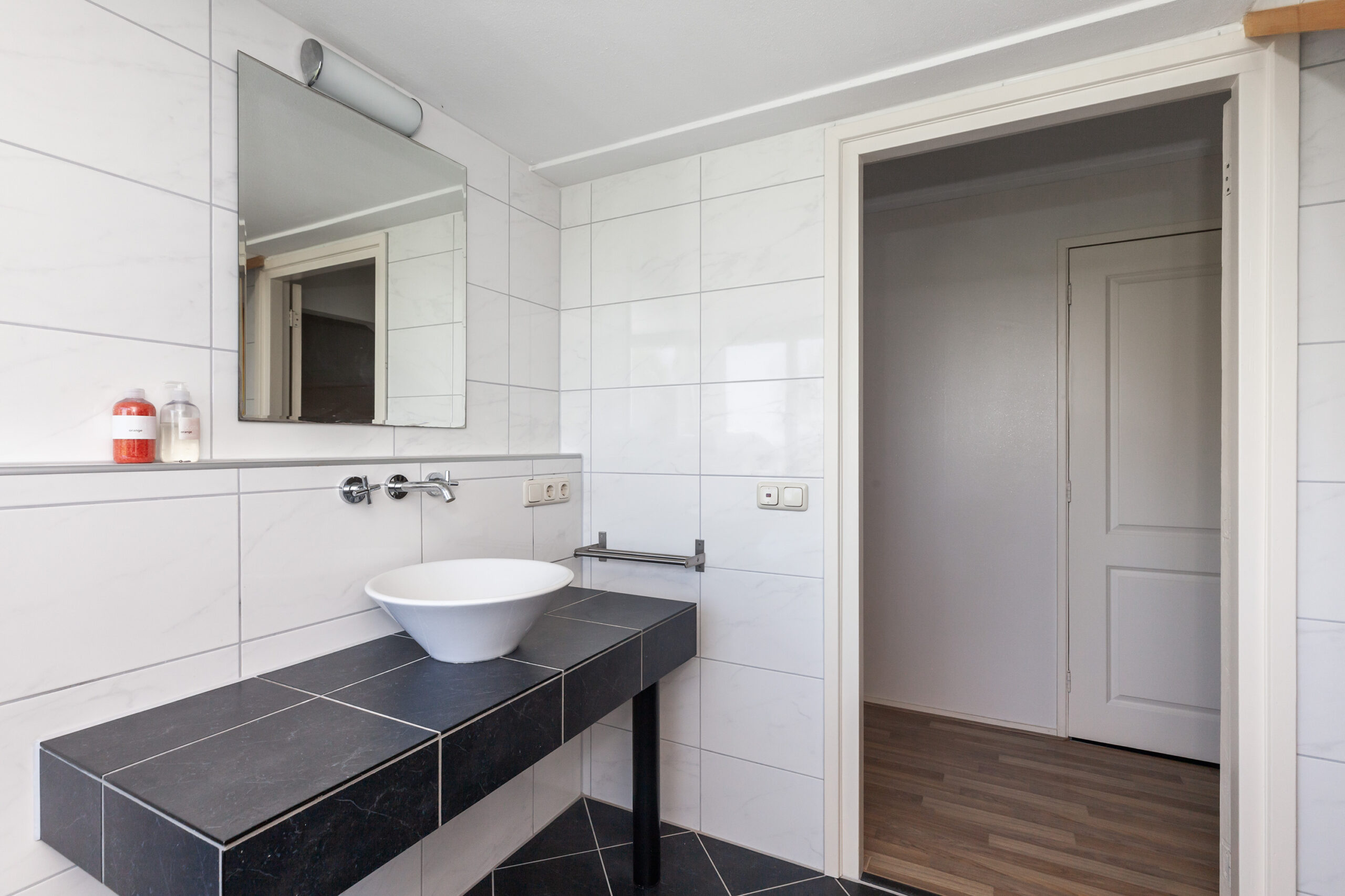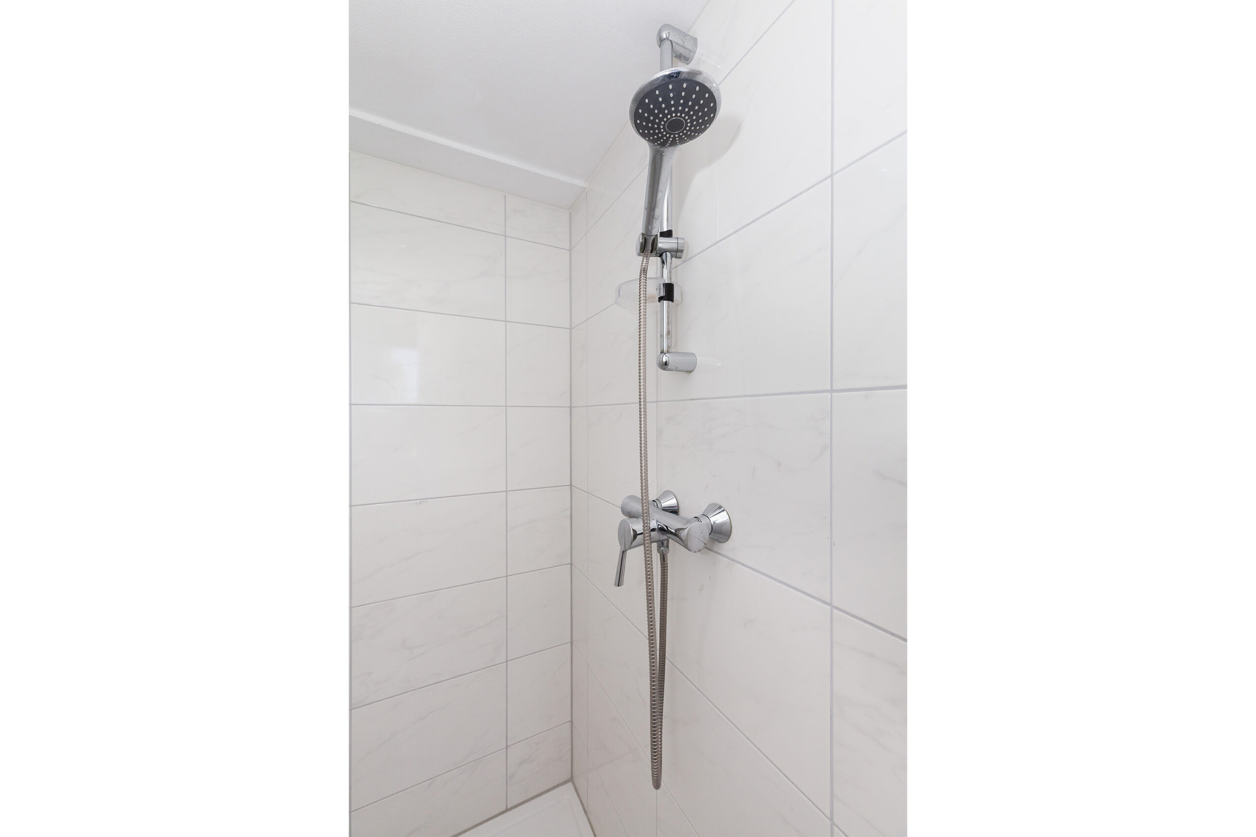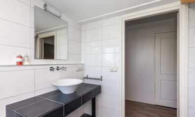 In contrasterende tinten is de badkamer afgewerkt. U heeft de beschikking over een inloopdouche, waskom en een toilet. Ook in deze badkamer heeft u het gemakt van de grote dakkapel.