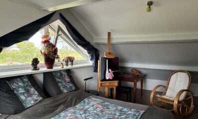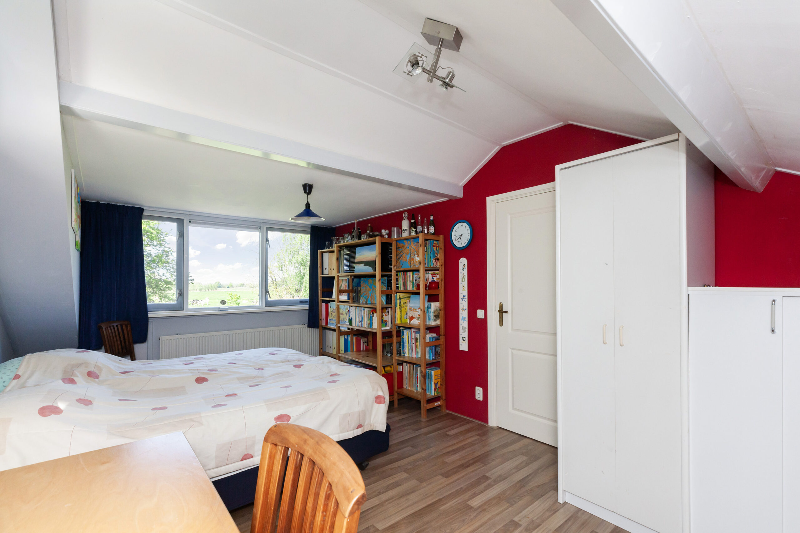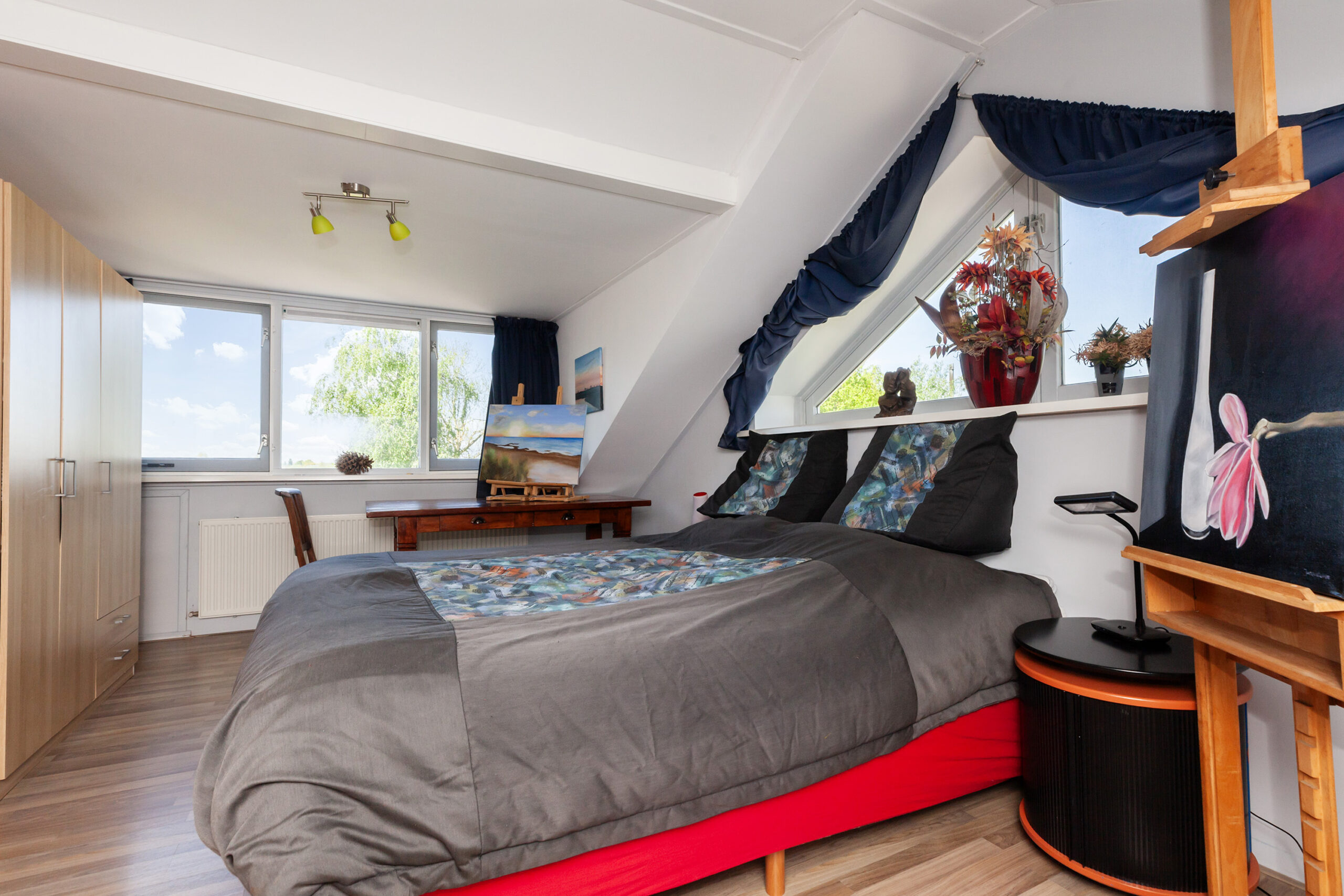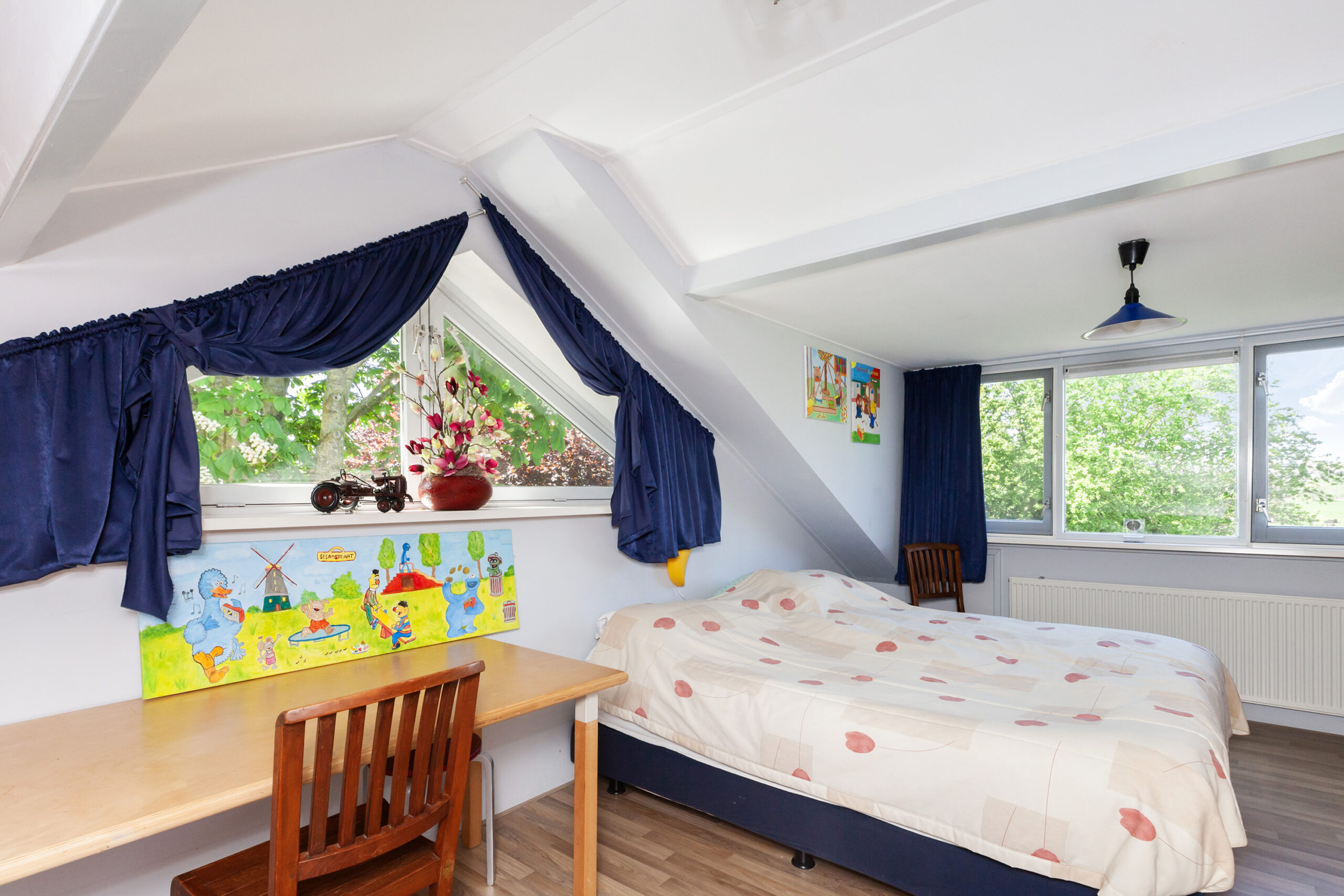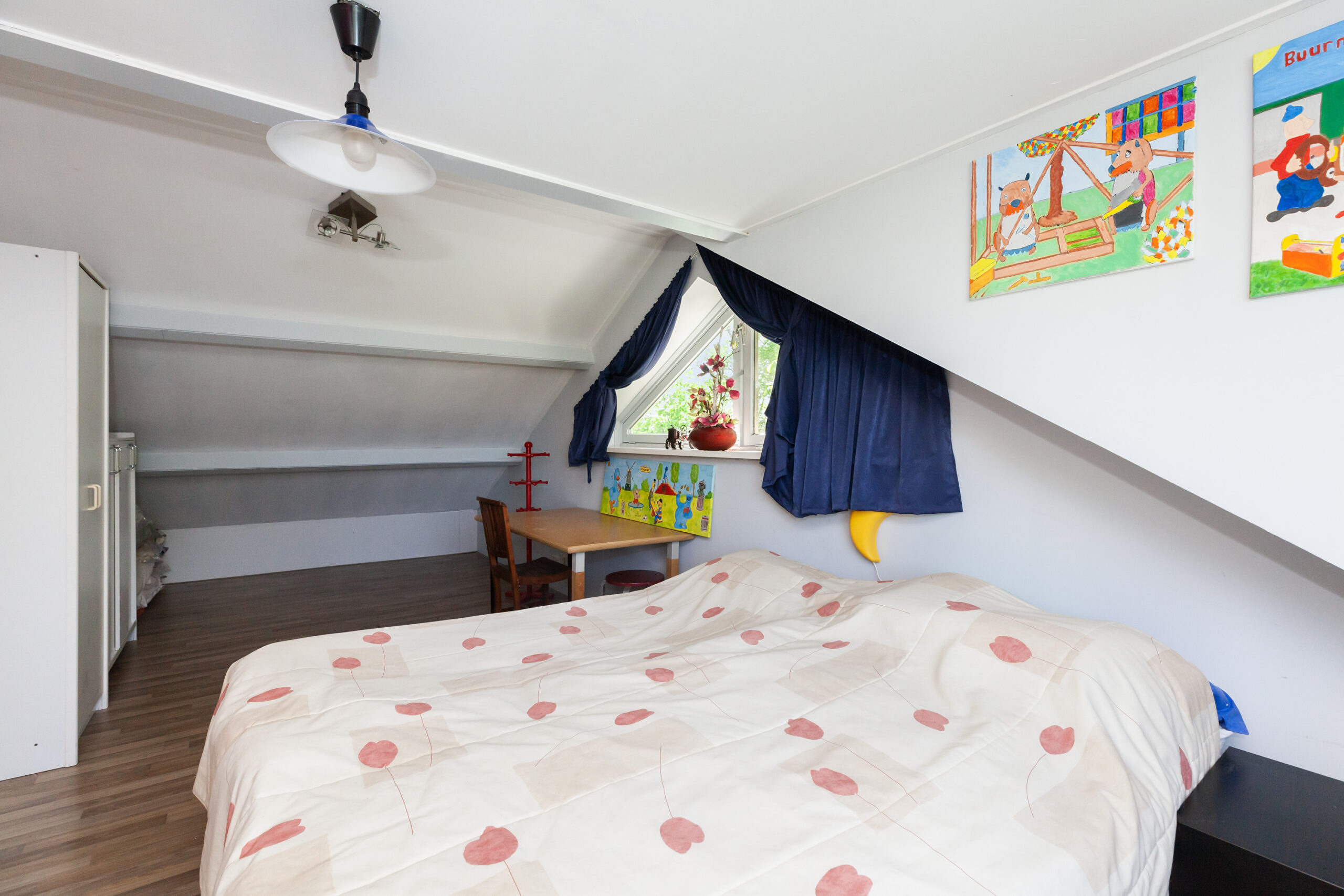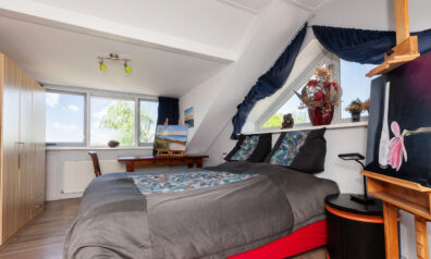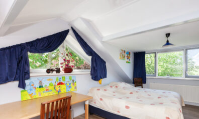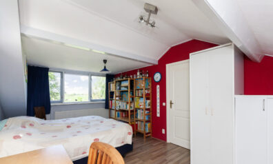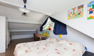 Deze slaapkamer is aan de achterzijde gesitueerd en eveneens voorzien van een dakkapel en bergruimte onder het schuine dak.