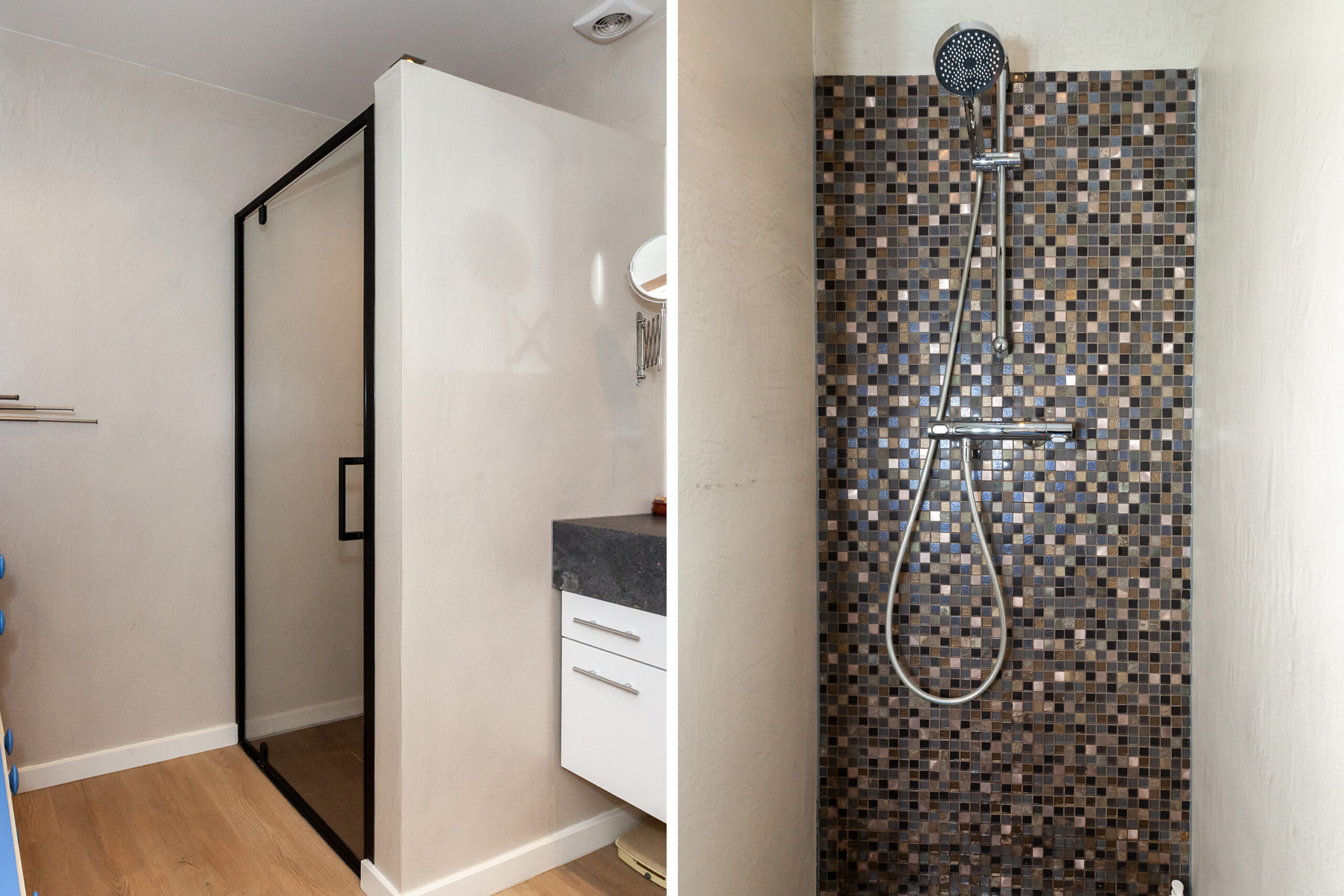Achter de schuifdeur treft u deze nette badkamer. Er is een inloopdouche en een wastafelmeubel.