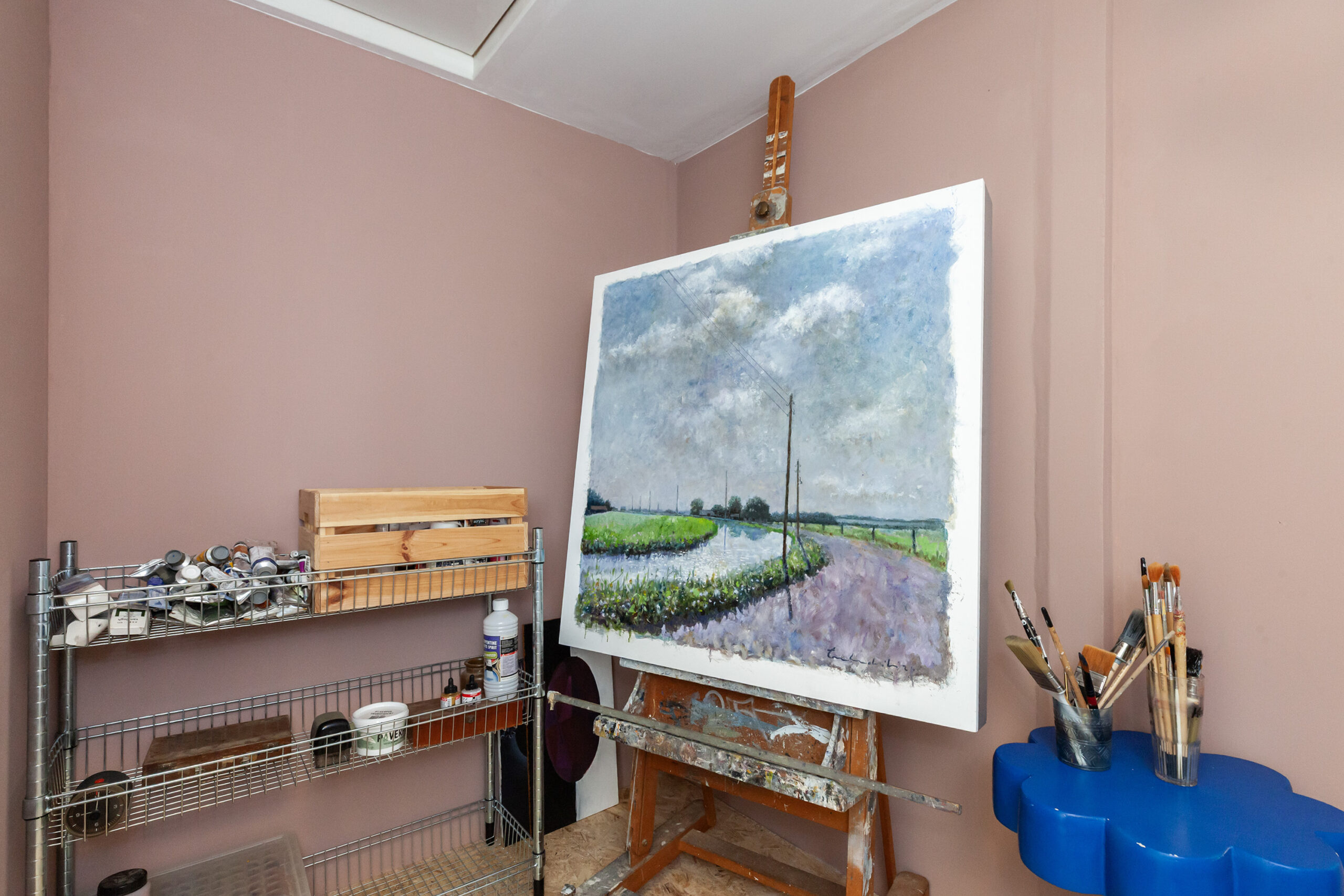 Deze kamer is momenteel in gebruik als atelier, maar leent zich uitstekend als werk- of hobbykamer. Via de vlizotrap is er toegang tot de bergzolder.