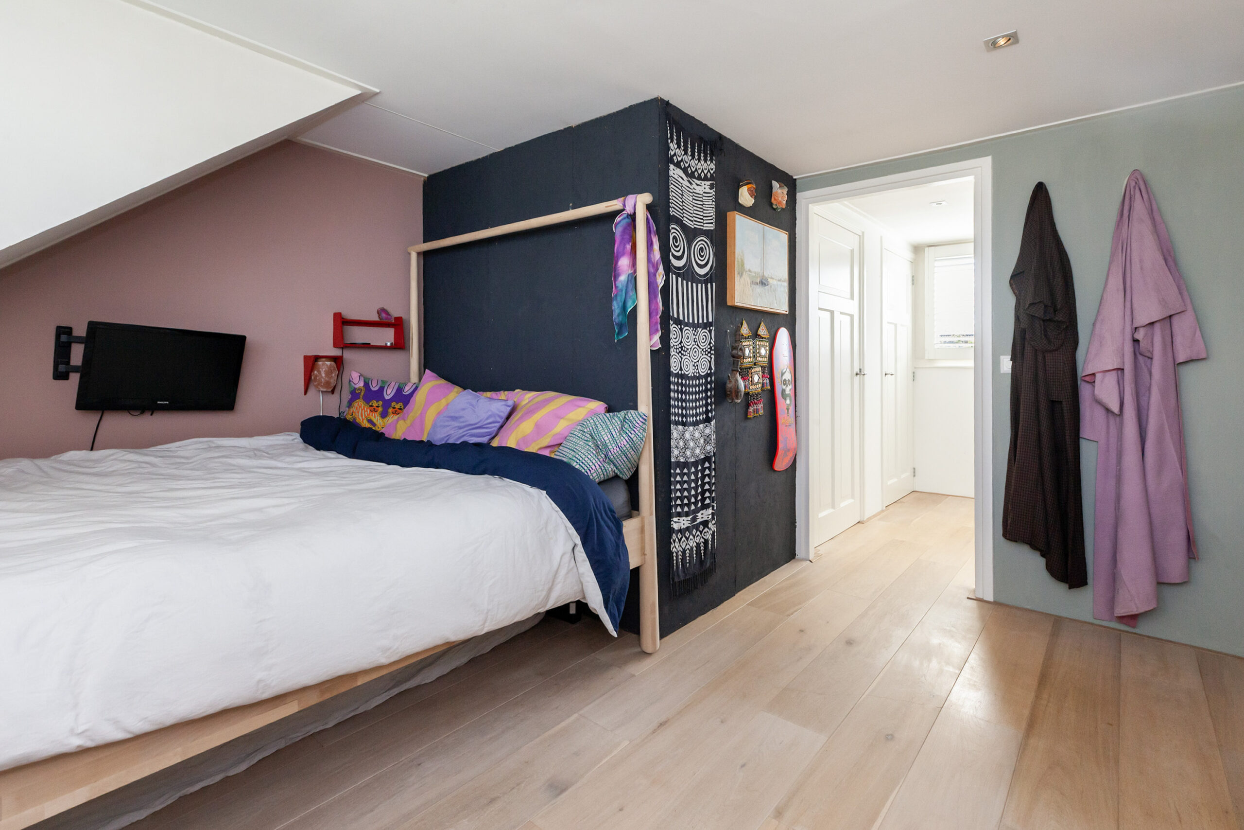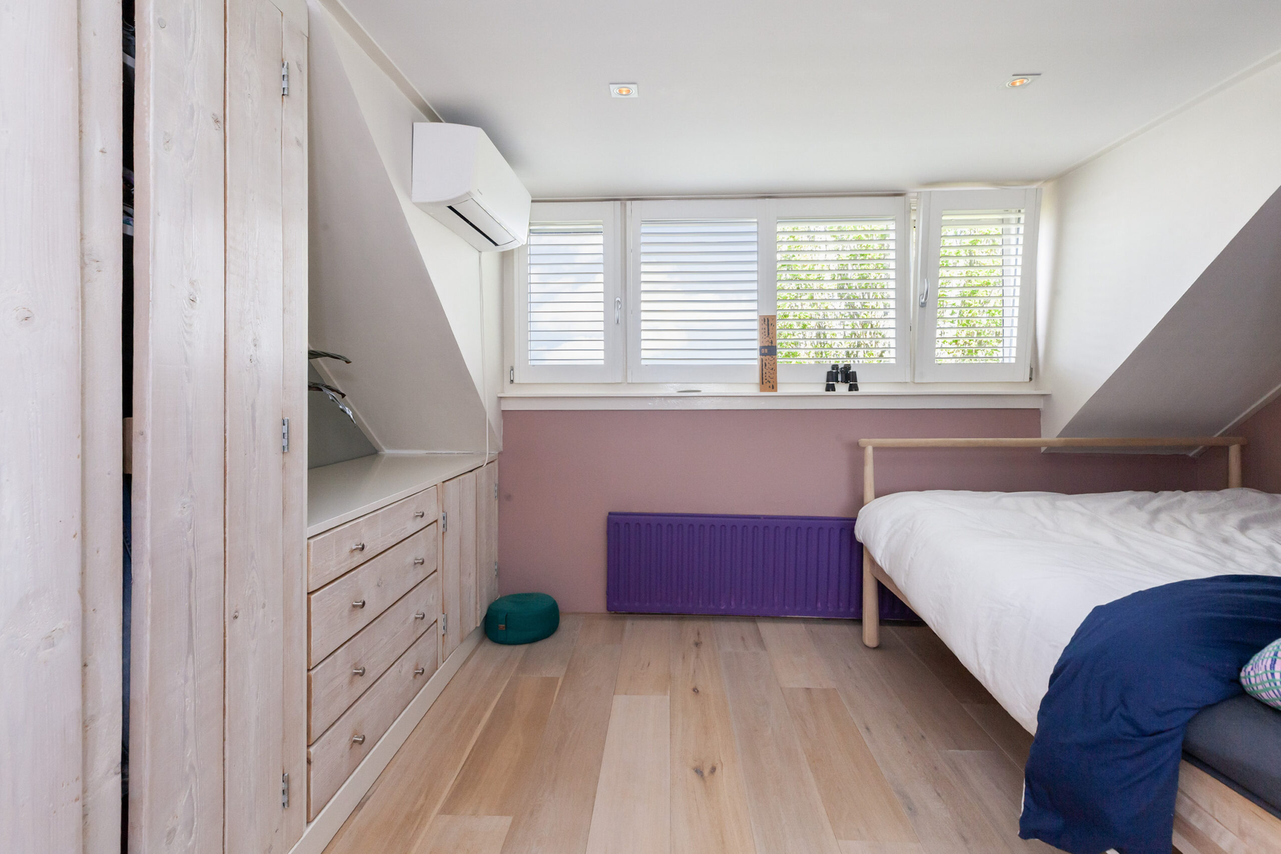 Dit is toch een heerlijke slaapkamer! Wakker worden met het uitzicht over de rivier wilt u toch elke morgen? Mede door de dakkapel is dit een grote slaapkamer waarbij u een airco heeft en inbouwkasten.