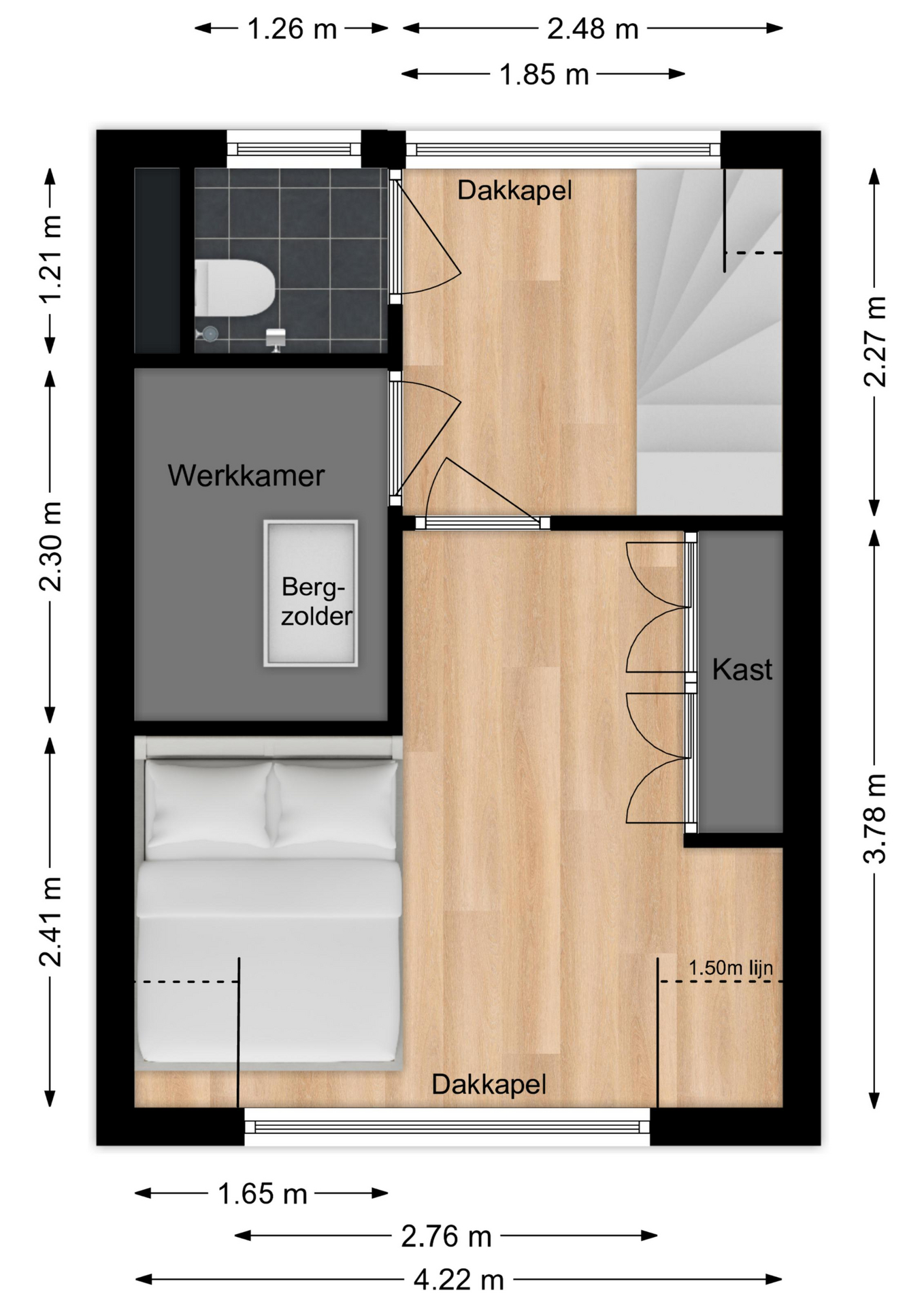 Vanaf de overloop heeft u toegang tot de slaapkamer, werkkamer en de toiletruimte.