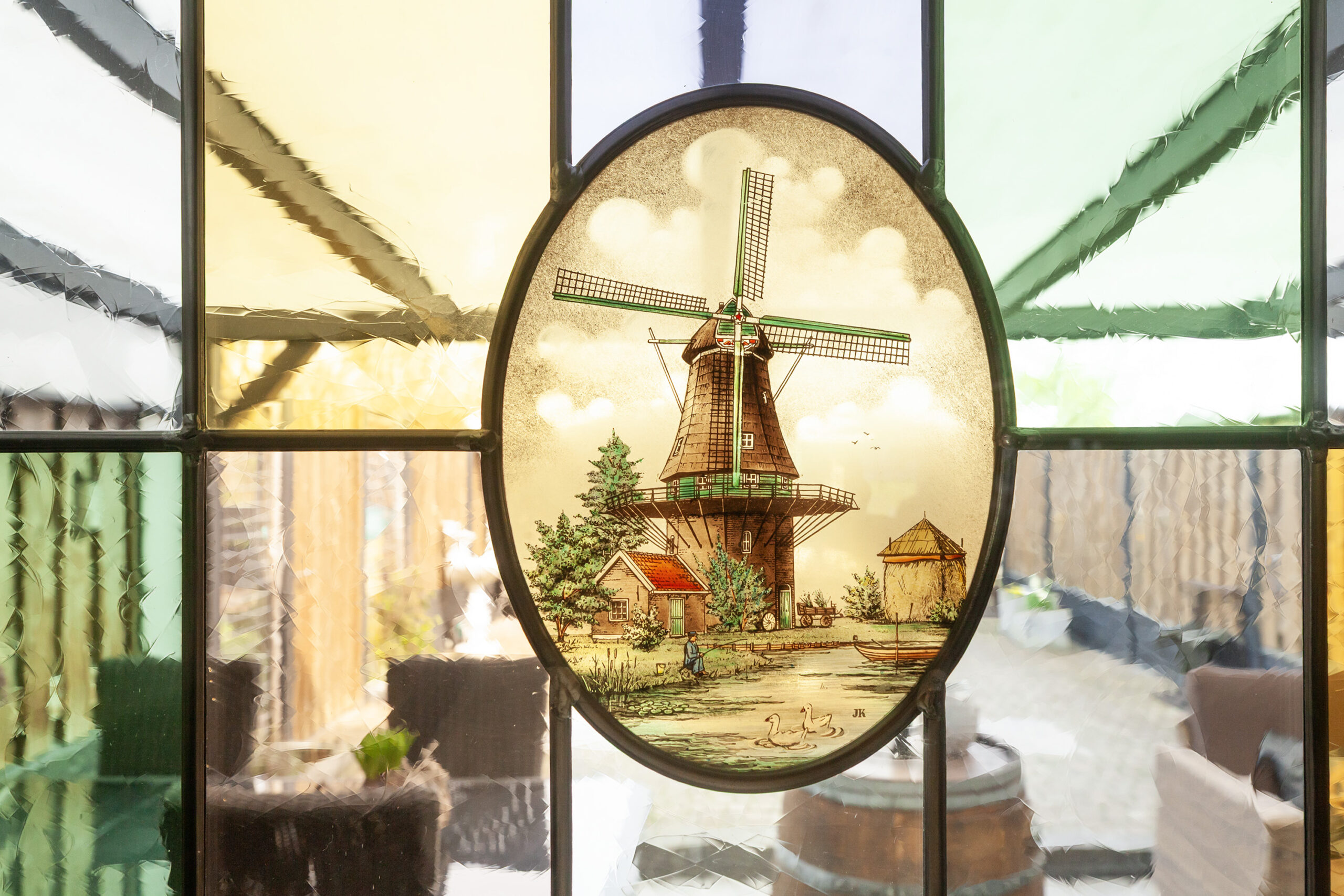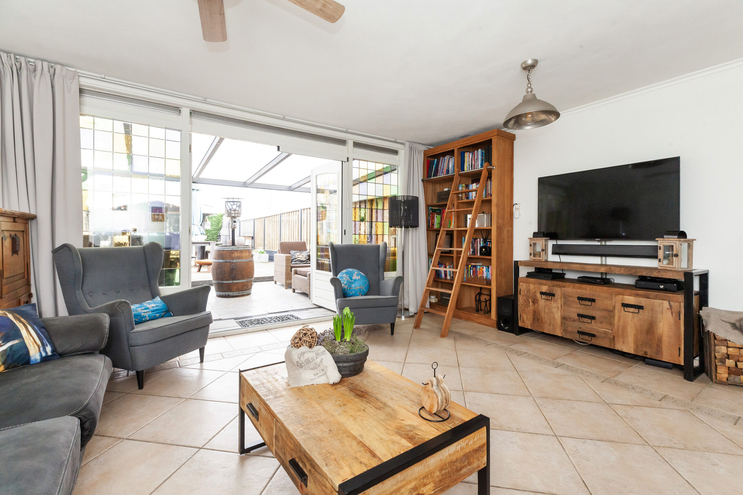 Ook de woonkamer nodigt u uit om heerlijk te genieten. Via de open toog vloeit de keuken over in deze uitgebouwde kamer. Kijkt u eens rond! De sfeervolle houtkachel en het mooie glas-in-lood in de ramen zijn details die het geheel extra aangenaam maken. Opent u de openslaande deuren, dan betrekt u het buitenleven direct bij binnen.