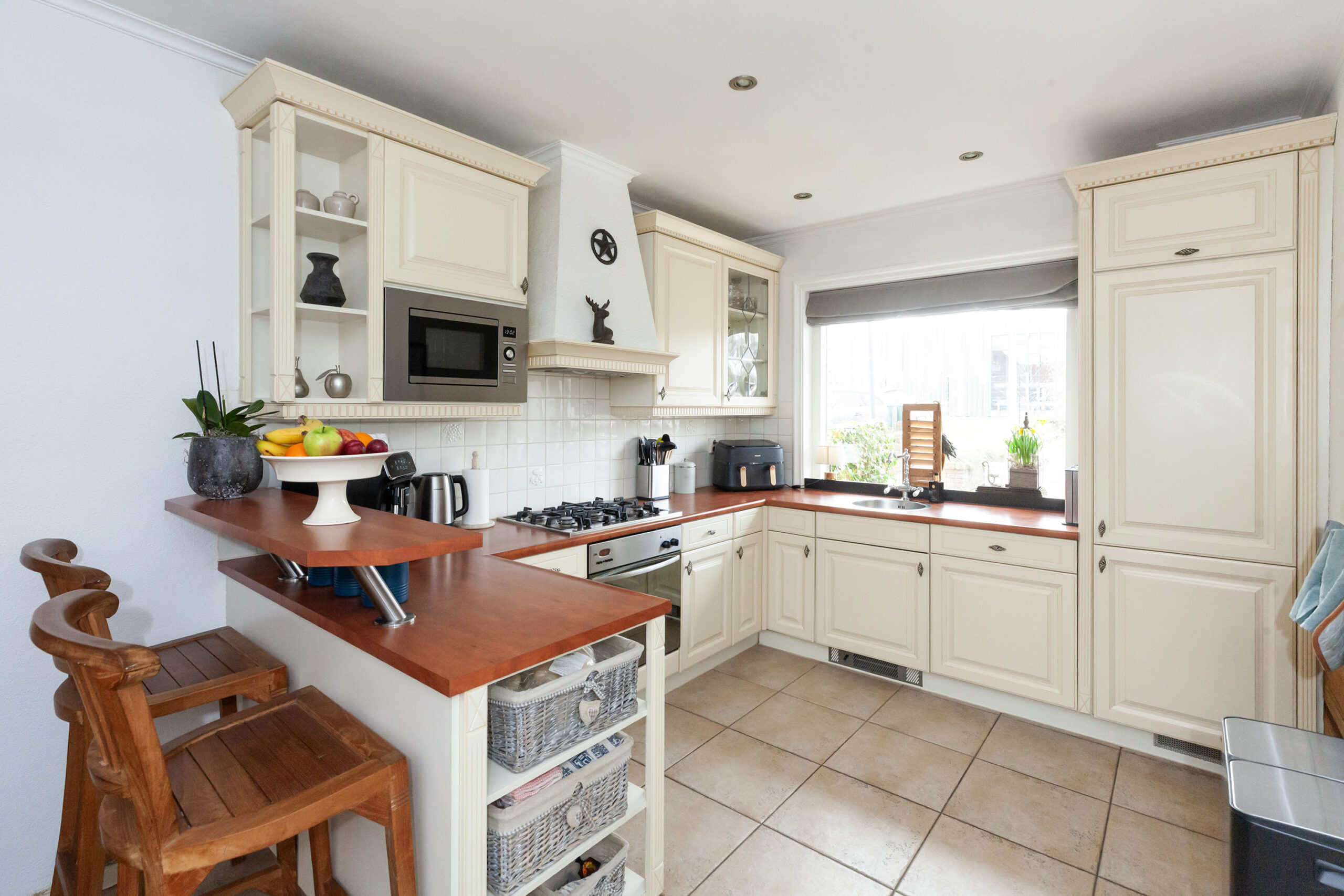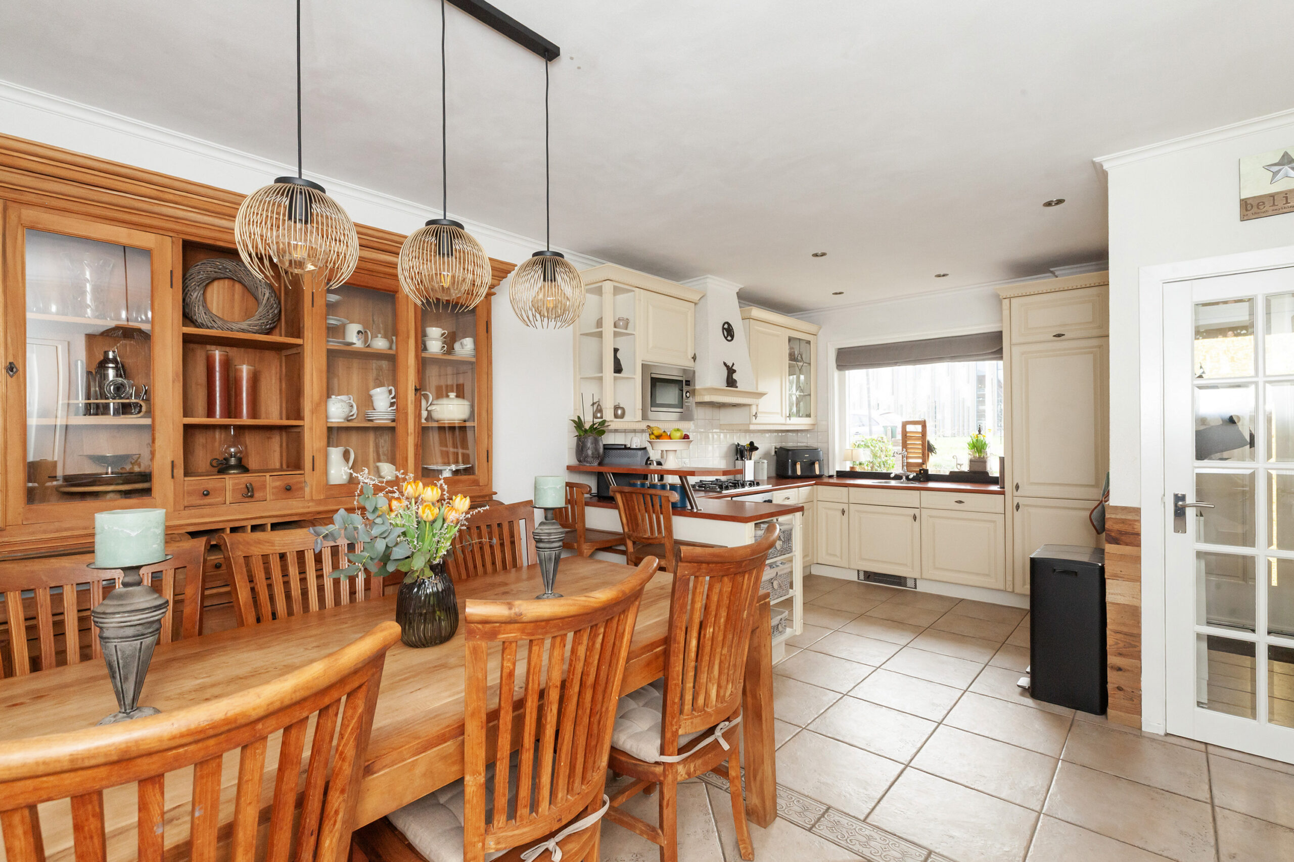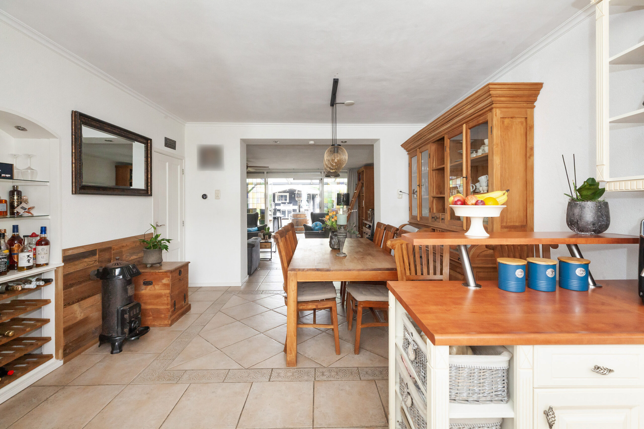 Vanuit de hal stapt u binnen in deze royale woonkeuken. Koken en uitgebreid tafelen gaan hier uitstekend samen en zorgen voor een gezellig samenzijn. Een leuk detail is de halfronde nis, waarin wijnflessen zijn opgeborgen. Daarnaast beschikt u over twee inbouwkasten, waarvan één kast is voorzien van de aansluitingen voor uw wasapparatuur.