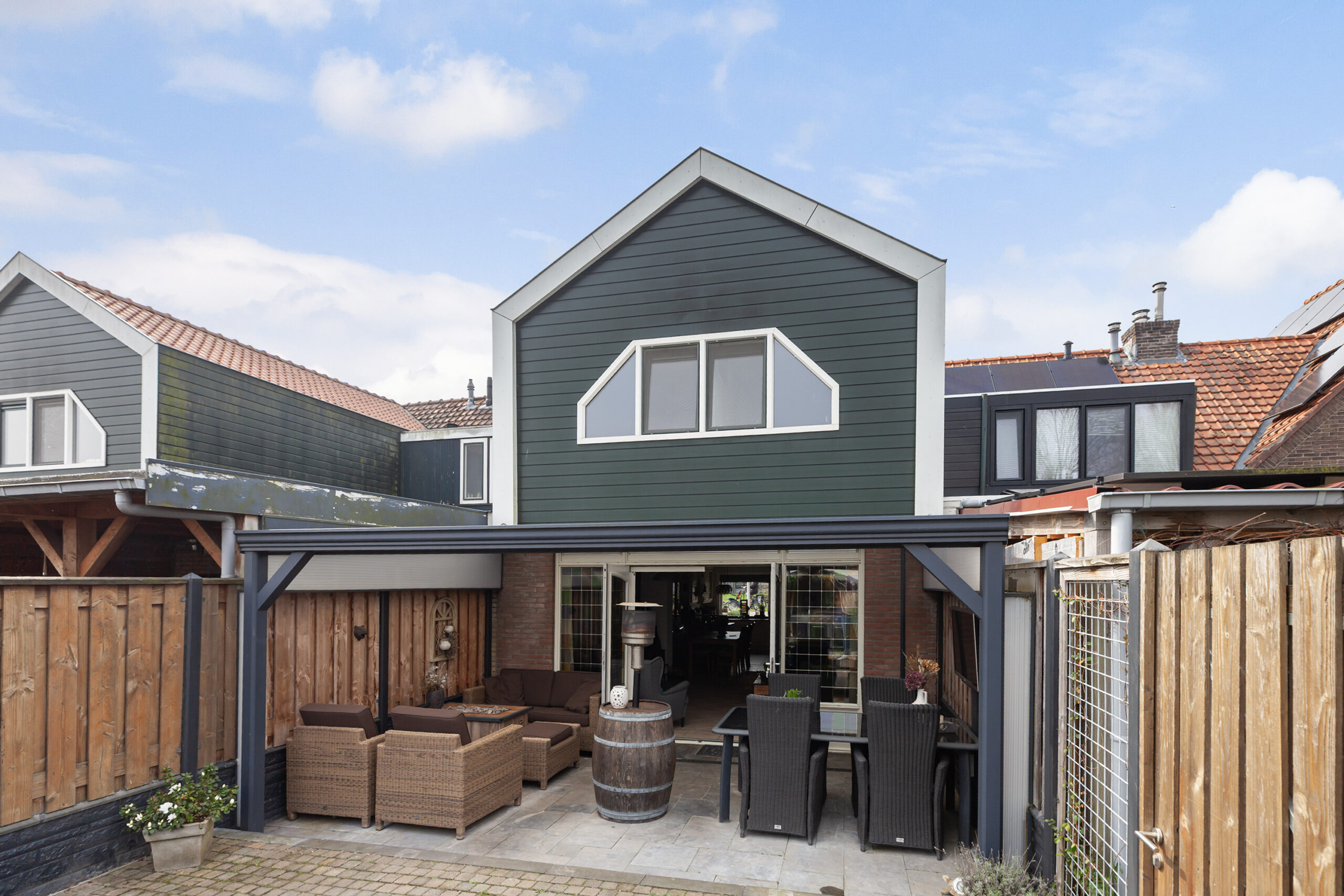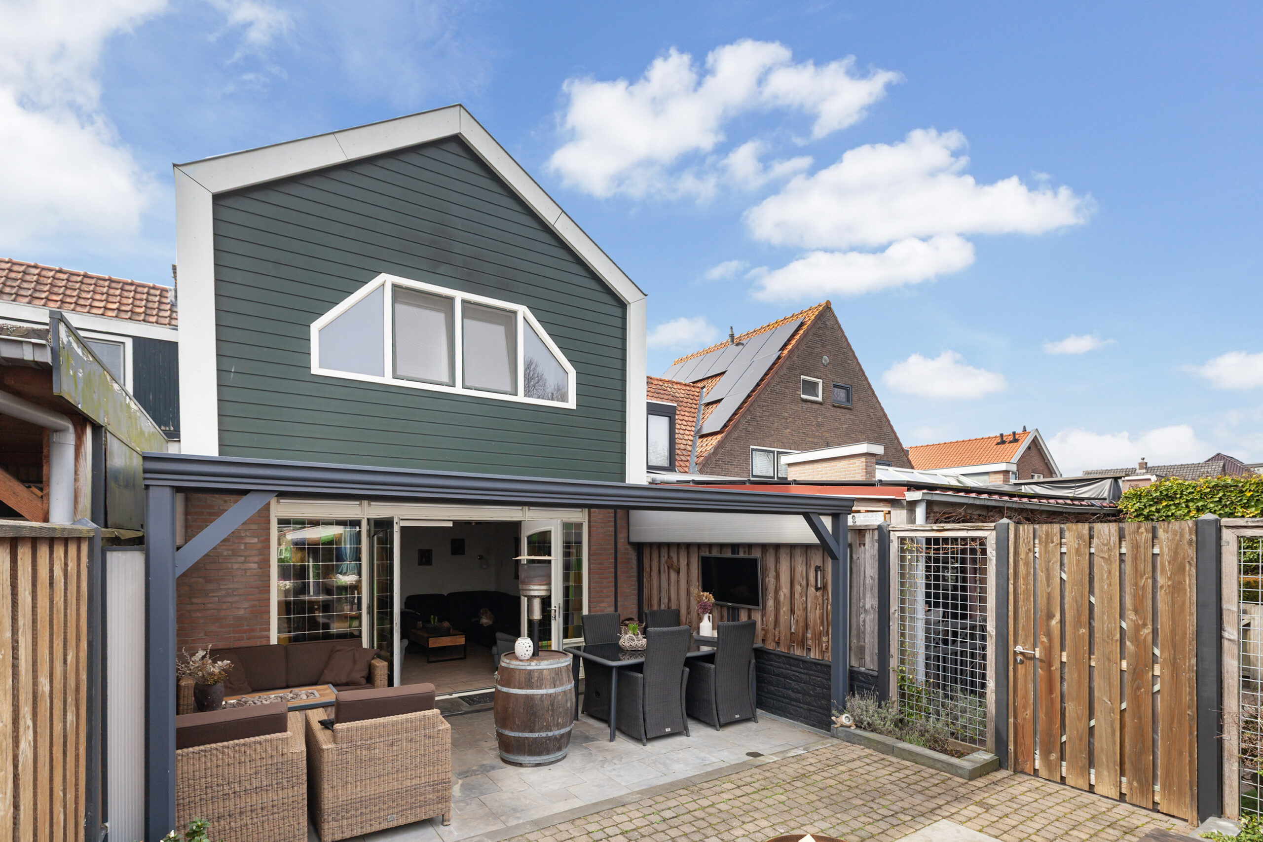 Achter de woning ligt een zeer diepe tuin, bestaande uit maar liefst drie percelen. Direct achter de woning bevindt zich een overkapping met een groot terras. Via het naastgelegen poortje is er een achterom, die loopt via de tuinen van de naastgelegen buren; hiervoor is een erfdienstbaarheid gevestigd.