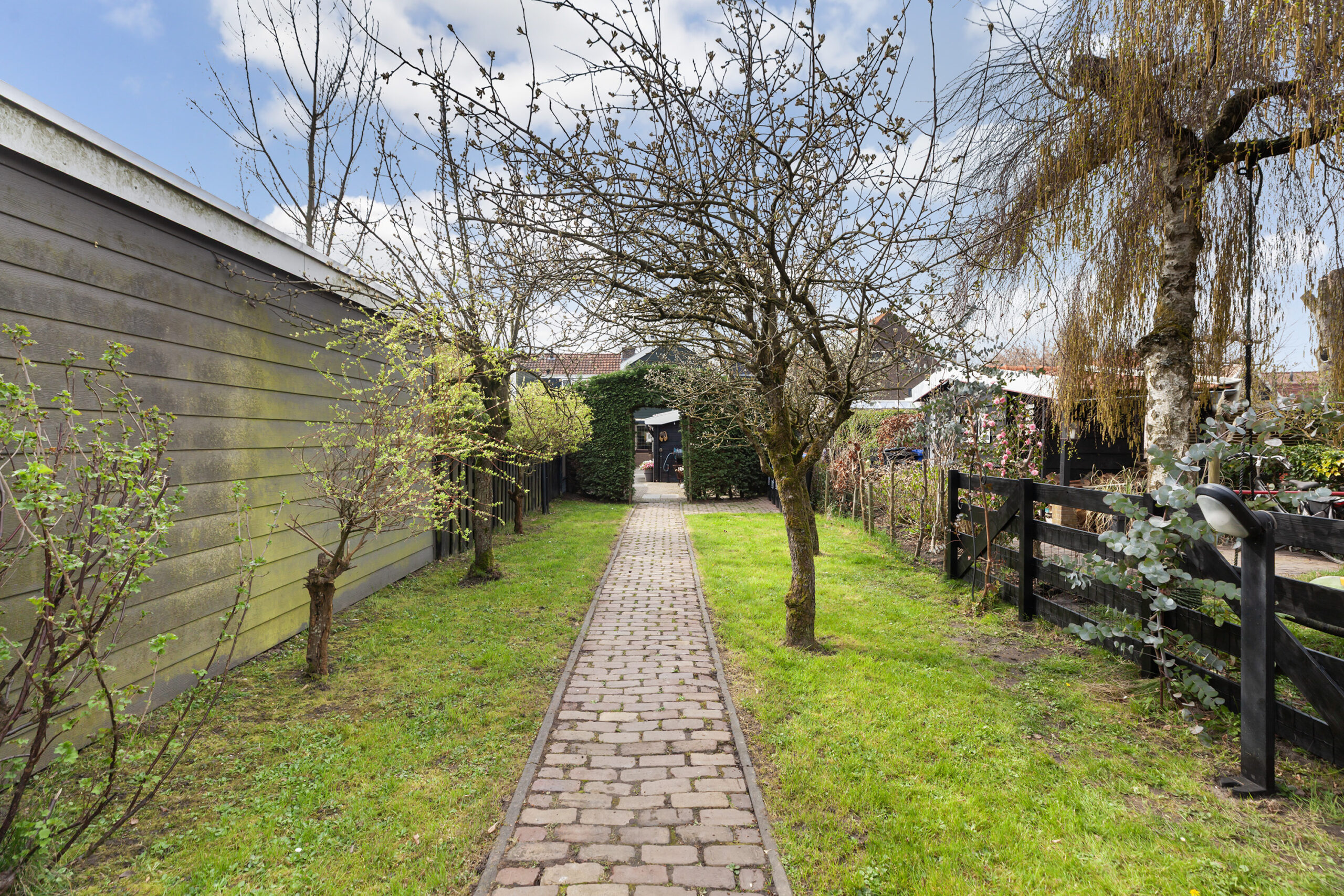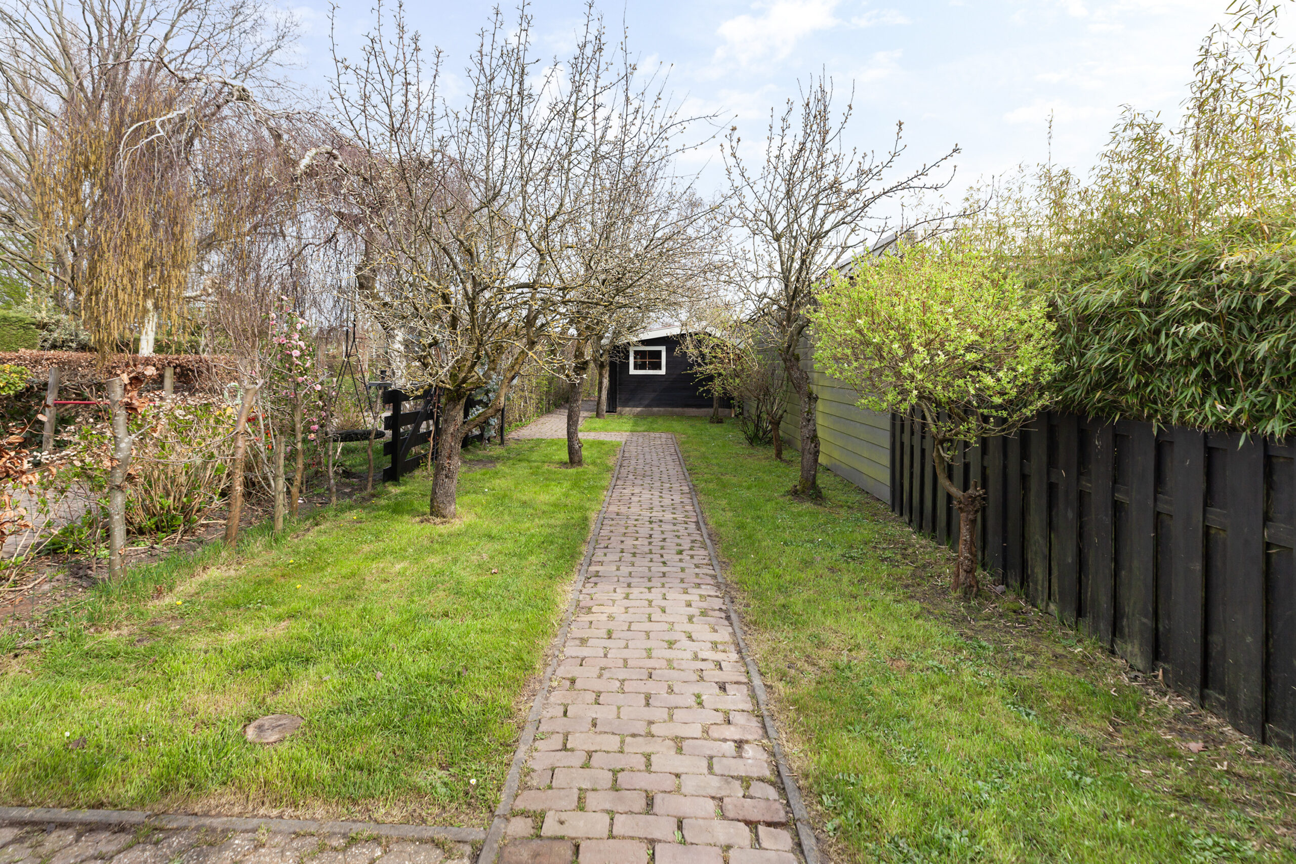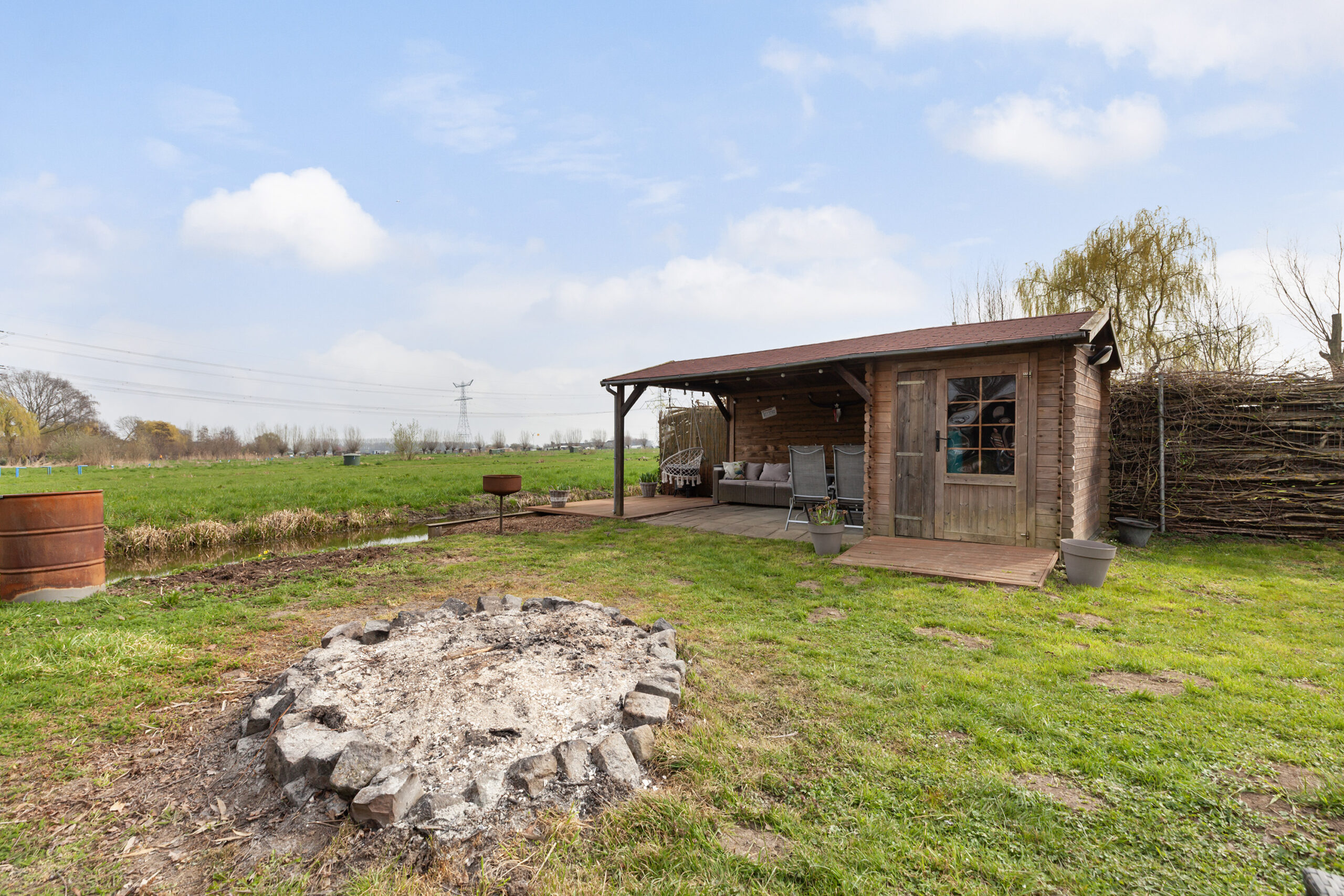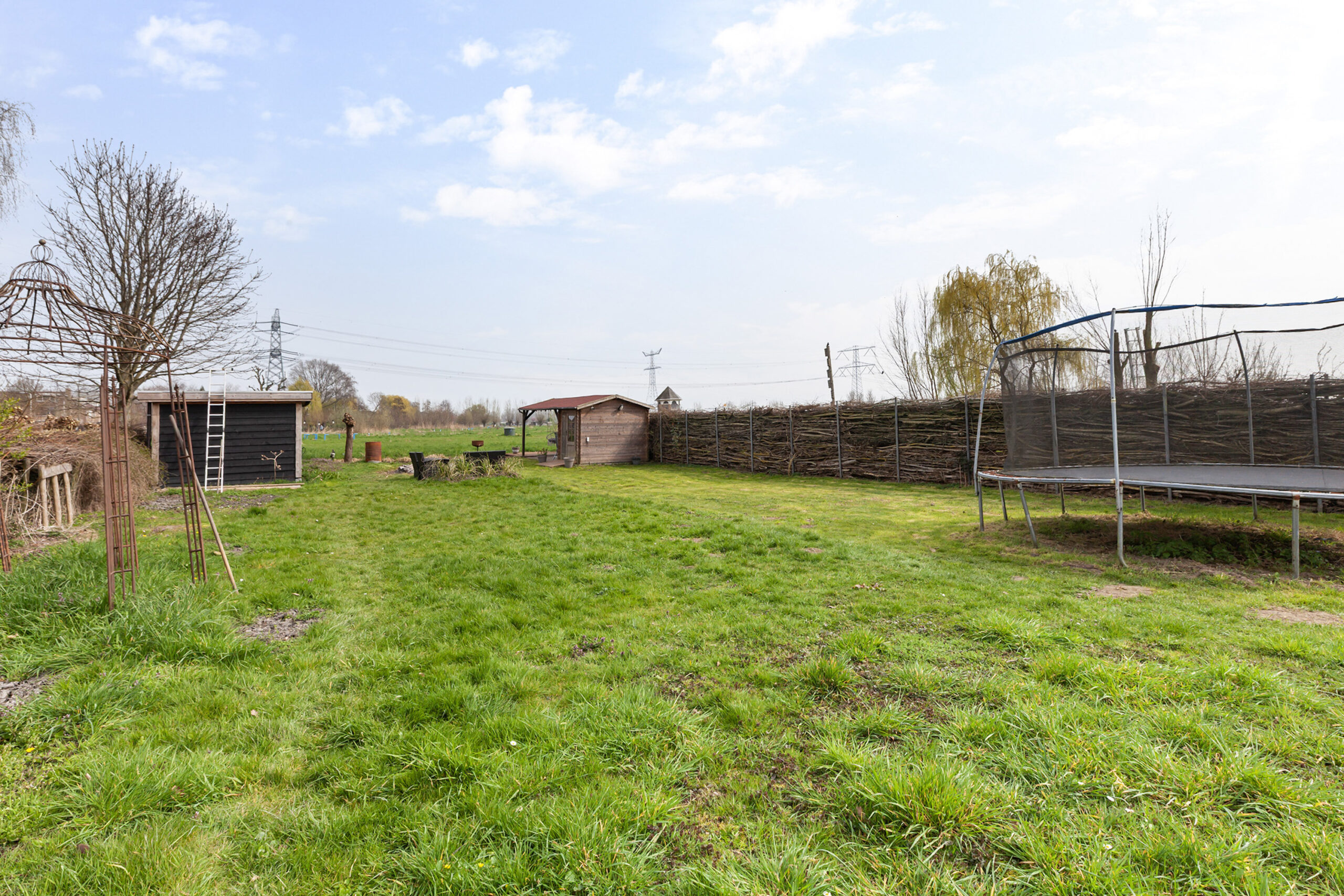 Vervolgens komt u bij een houten poort, waarachter zich een groot grasveld bevindt. Vanaf dit punt heeft u het gevoel midden in de polder te staan: fluitende vogels en een vrij uitzicht over de groene weilanden waar koeien grazen. Bij het water staat een houten berging (circa 2.75 x 1.78 m) met een leuke overkapping. Ook hier is het heerlijk vertoeven. In elk deel van de tuin is er wel een plek waar u in alle rust kunt ontsnappen aan de drukte en volop kunt genieten van alles wat het buitenleven te bieden heeft.