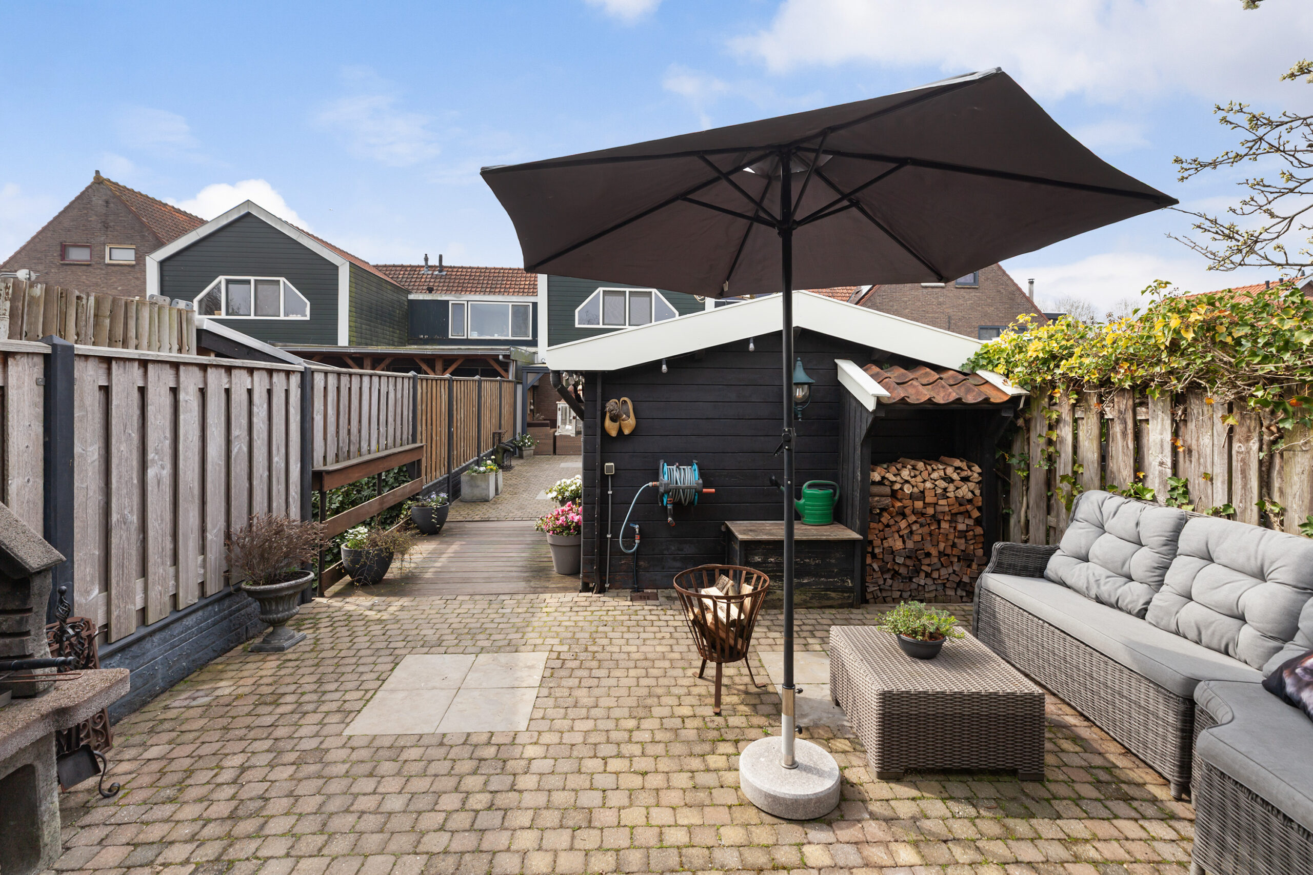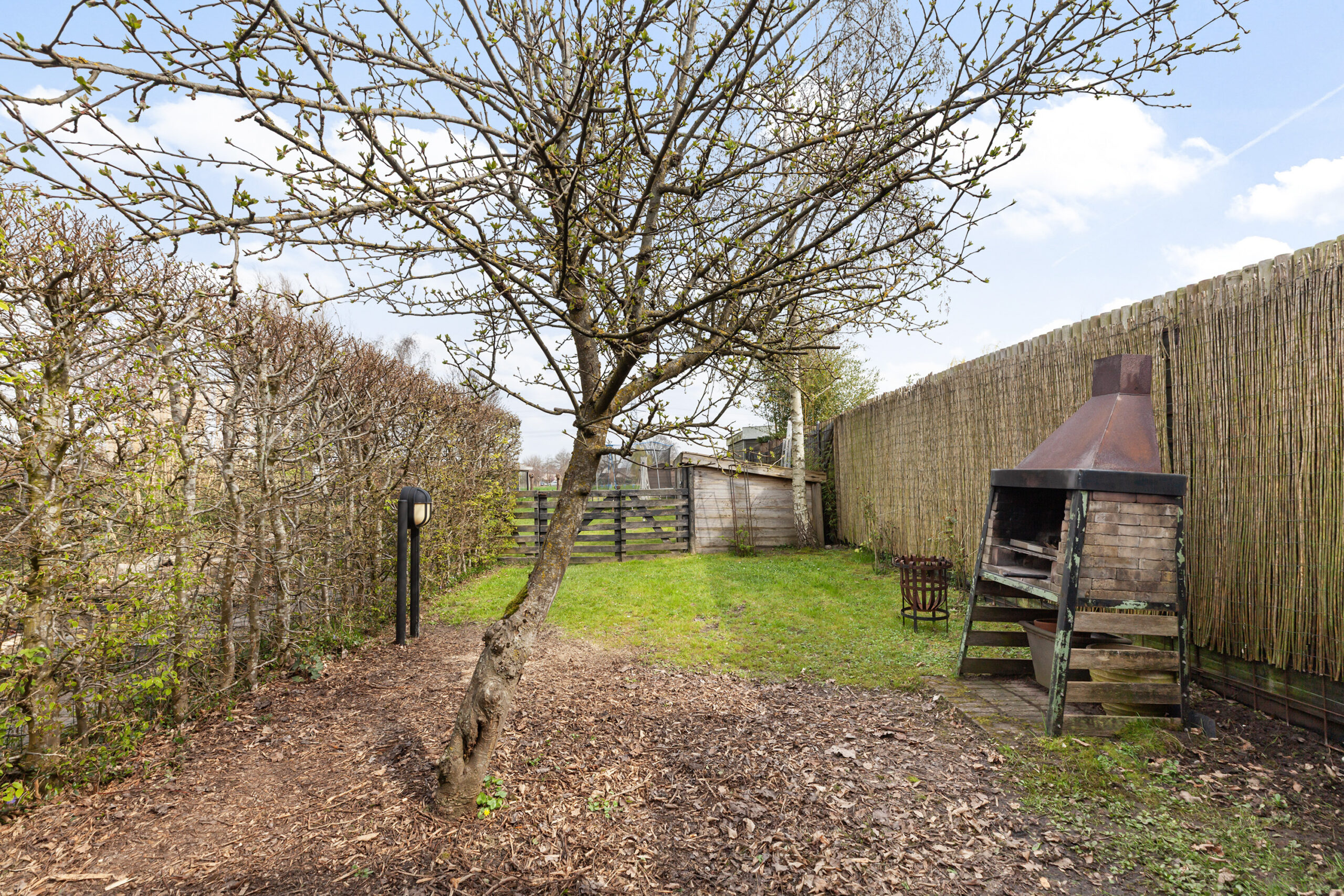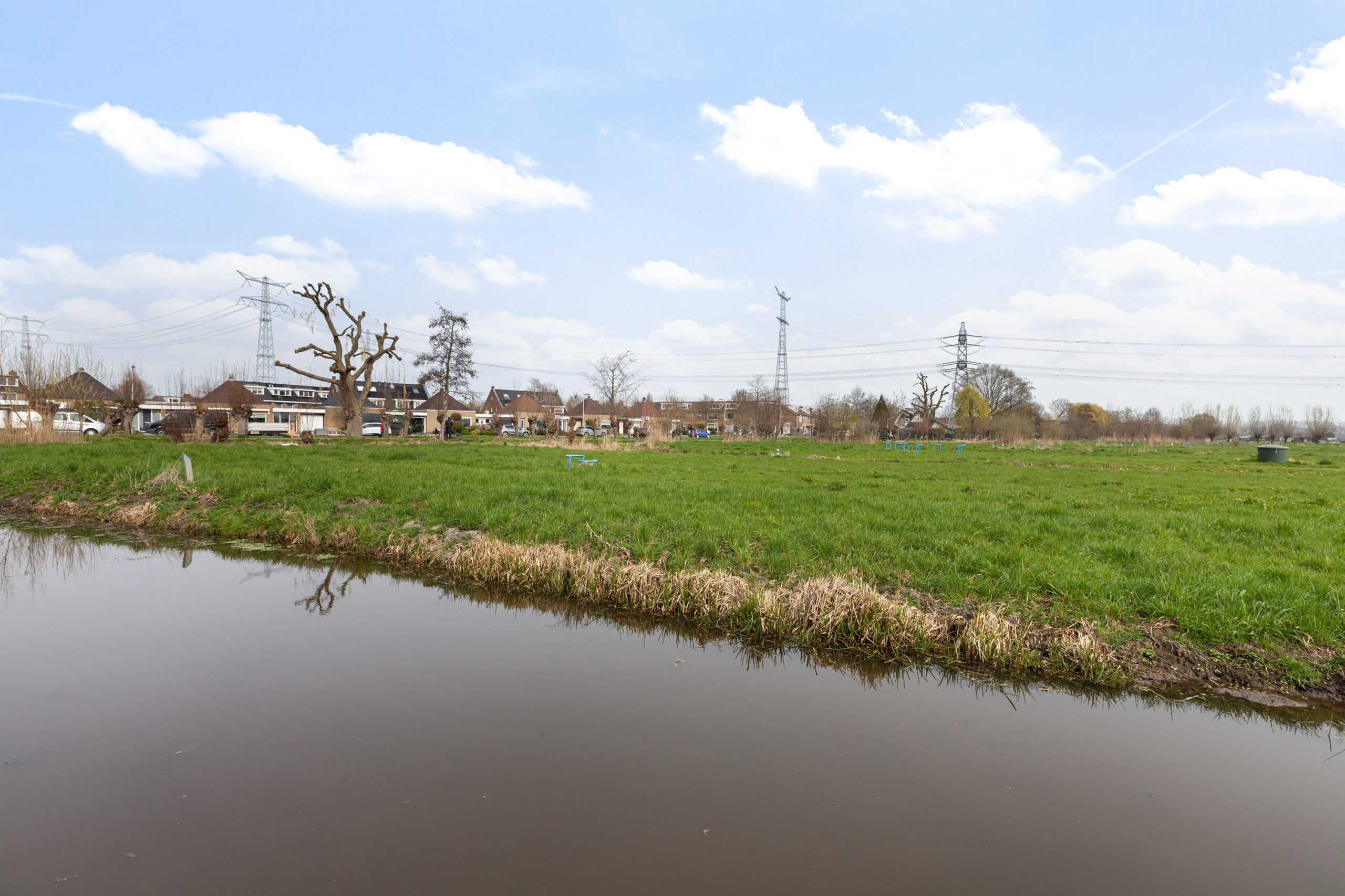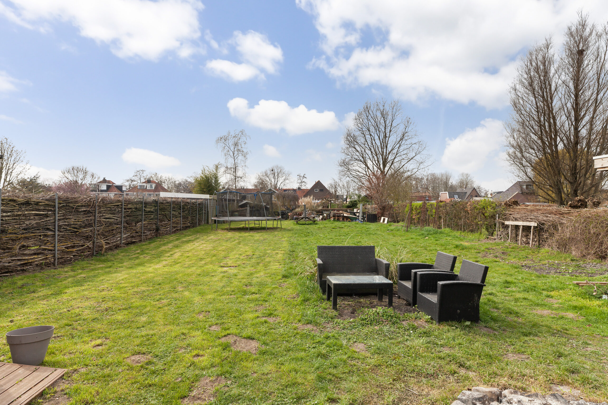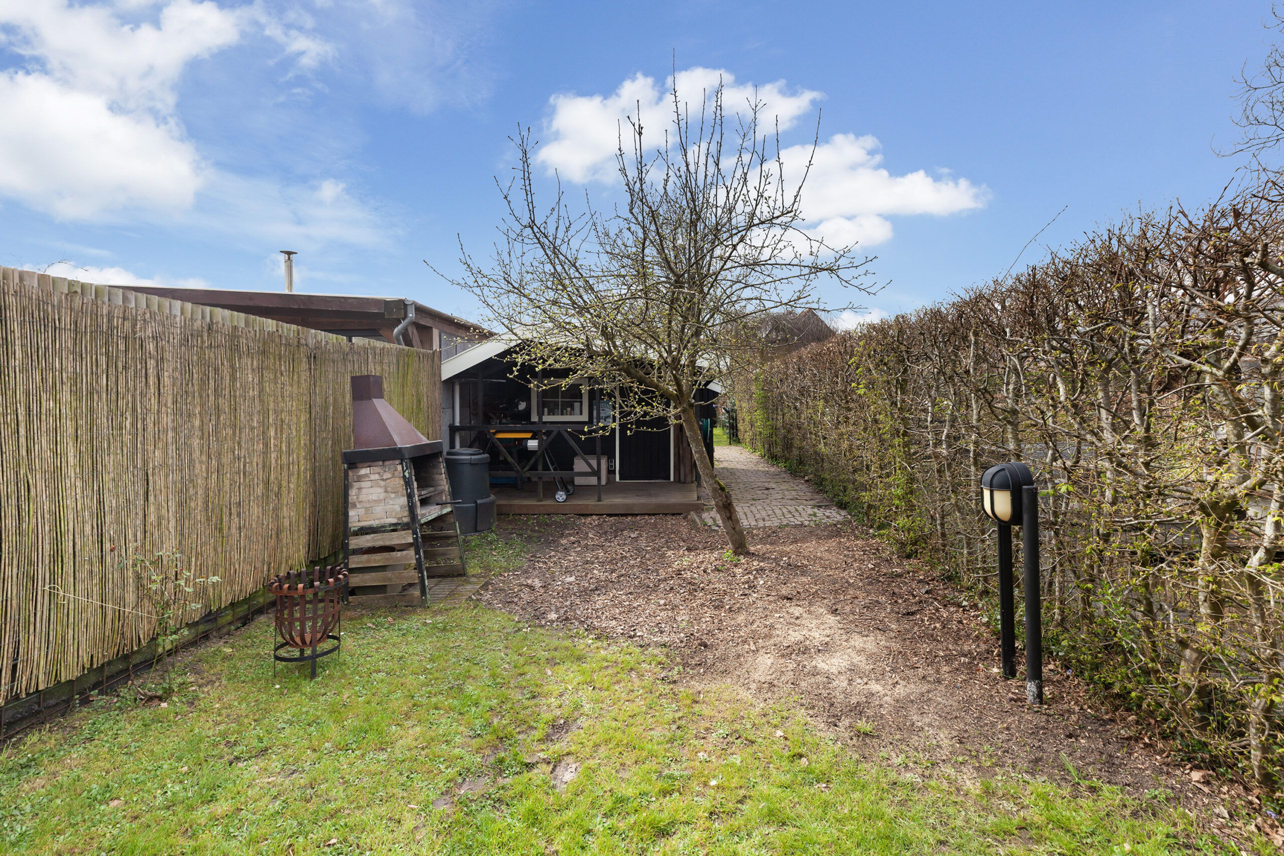 Vervolgens komt u bij een houten poort, waarachter zich een groot grasveld bevindt. Vanaf dit punt heeft u het gevoel midden in de polder te staan: fluitende vogels en een vrij uitzicht over de groene weilanden waar koeien grazen. Bij het water staat een houten berging (circa 2.75 x 1.78 m) met een leuke overkapping. Ook hier is het heerlijk vertoeven. In elk deel van de tuin is er wel een plek waar u in alle rust kunt ontsnappen aan de drukte en volop kunt genieten van alles wat het buitenleven te bieden heeft.