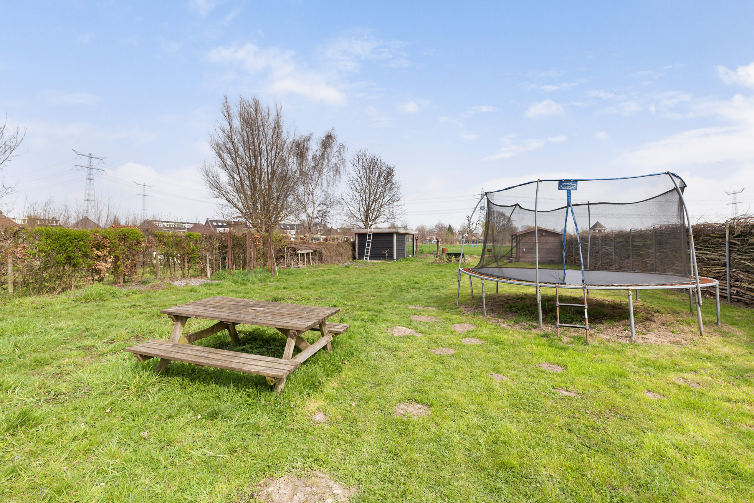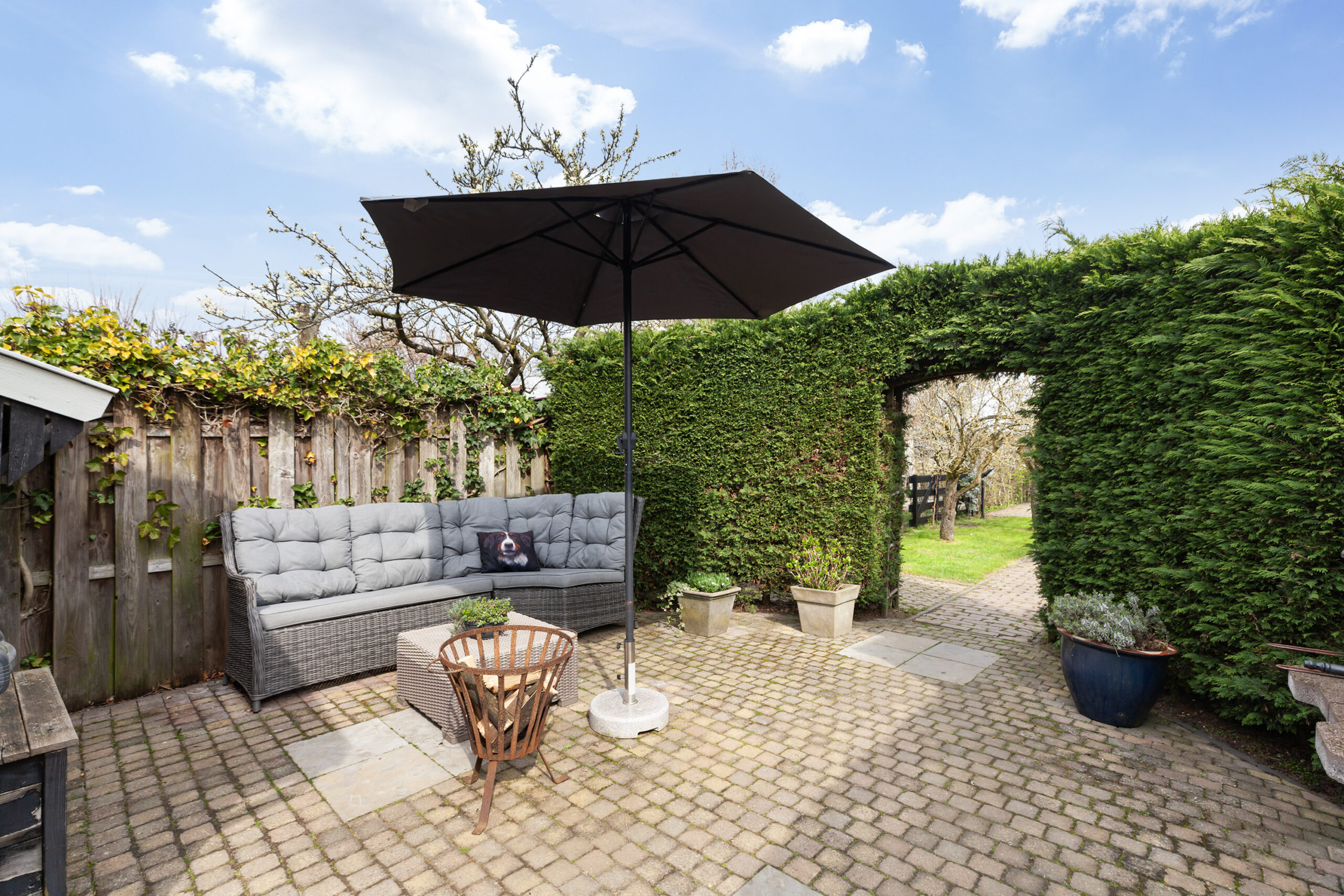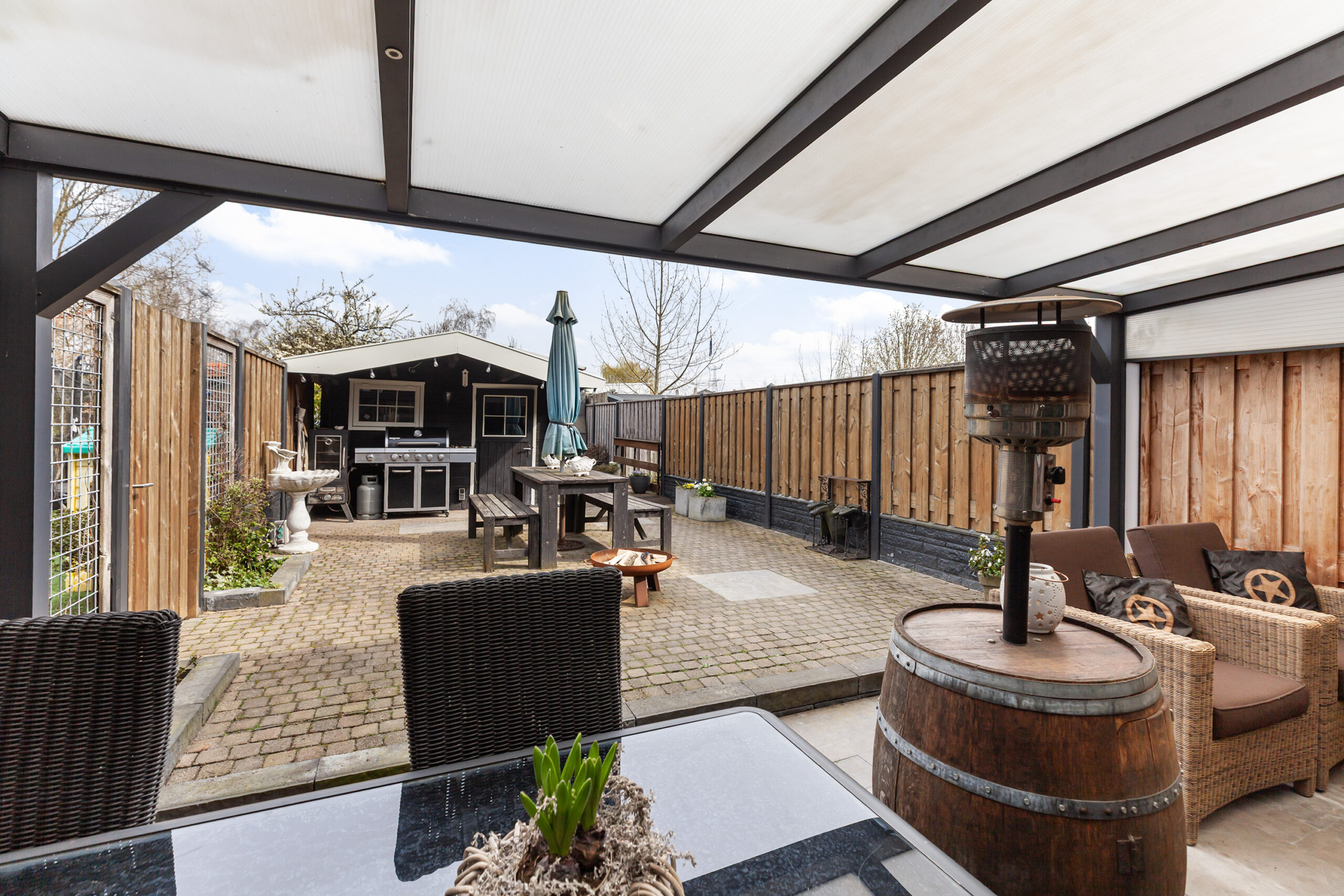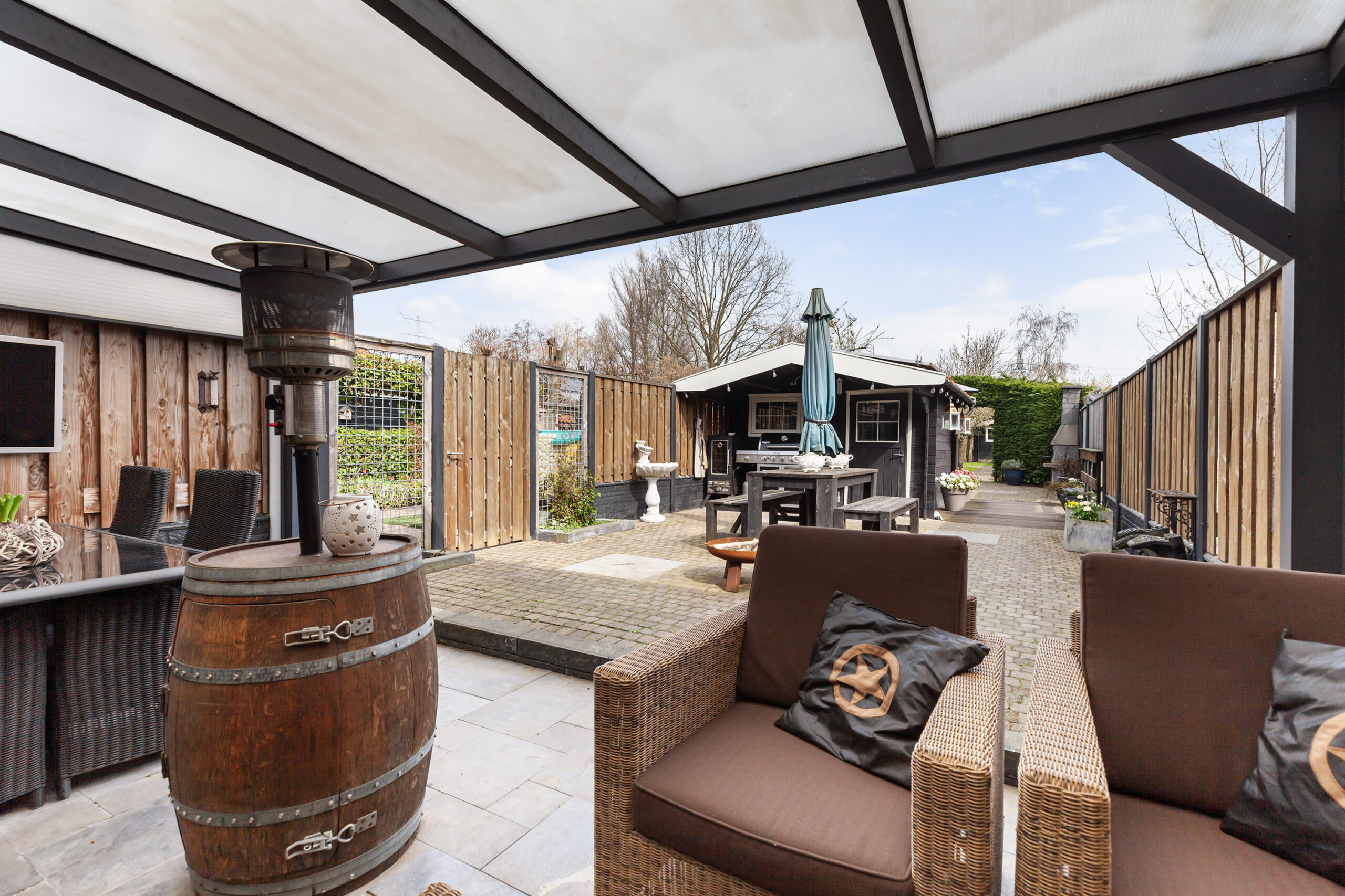 Vervolgens komt u bij een houten poort, waarachter zich een groot grasveld bevindt. Vanaf dit punt heeft u het gevoel midden in de polder te staan: fluitende vogels en een vrij uitzicht over de groene weilanden waar koeien grazen. Bij het water staat een houten berging (circa 2.75 x 1.78 m) met een leuke overkapping. Ook hier is het heerlijk vertoeven. In elk deel van de tuin is er wel een plek waar u in alle rust kunt ontsnappen aan de drukte en volop kunt genieten van alles wat het buitenleven te bieden heeft.