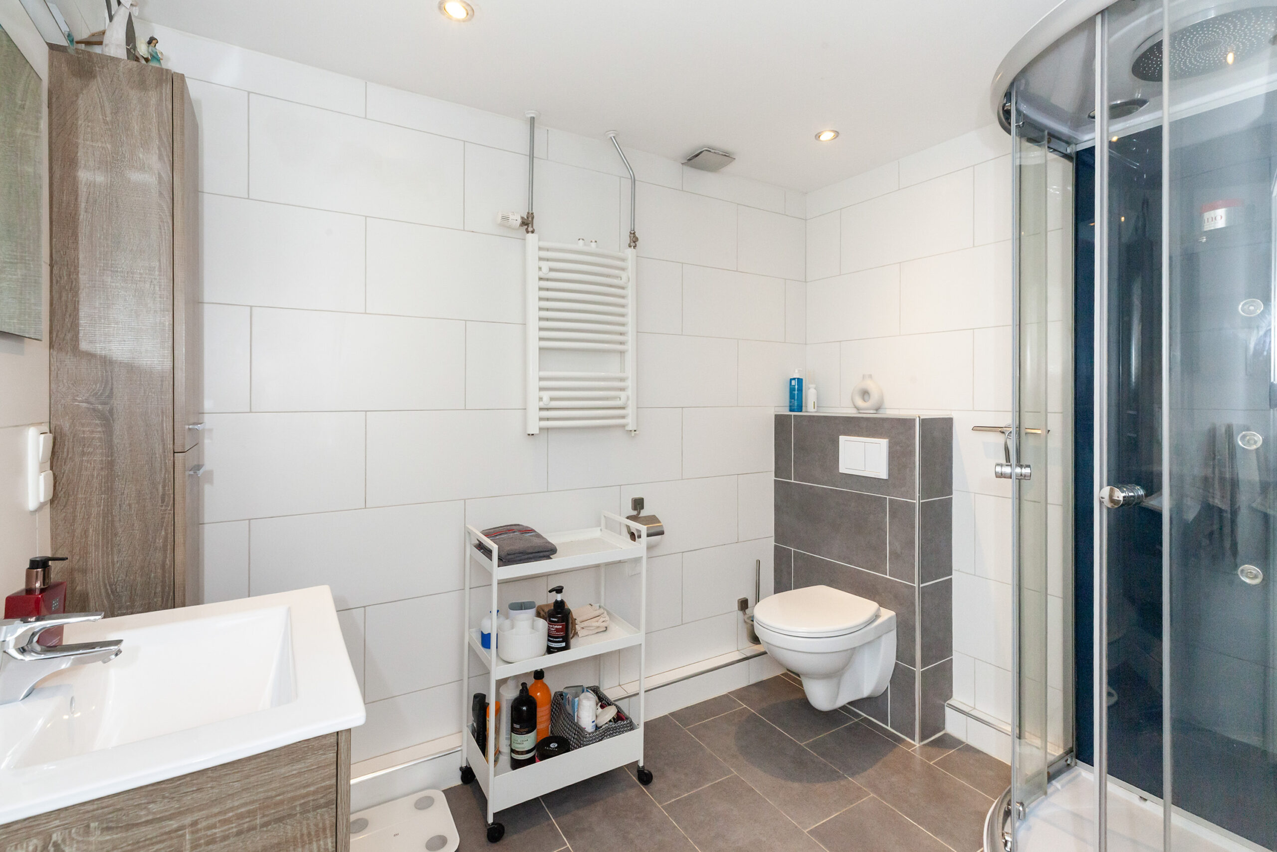 Nette badkamer in een lichte kleurstelling. Er is een douchecabine, wastafelmeubel, toilet en een designradiator.