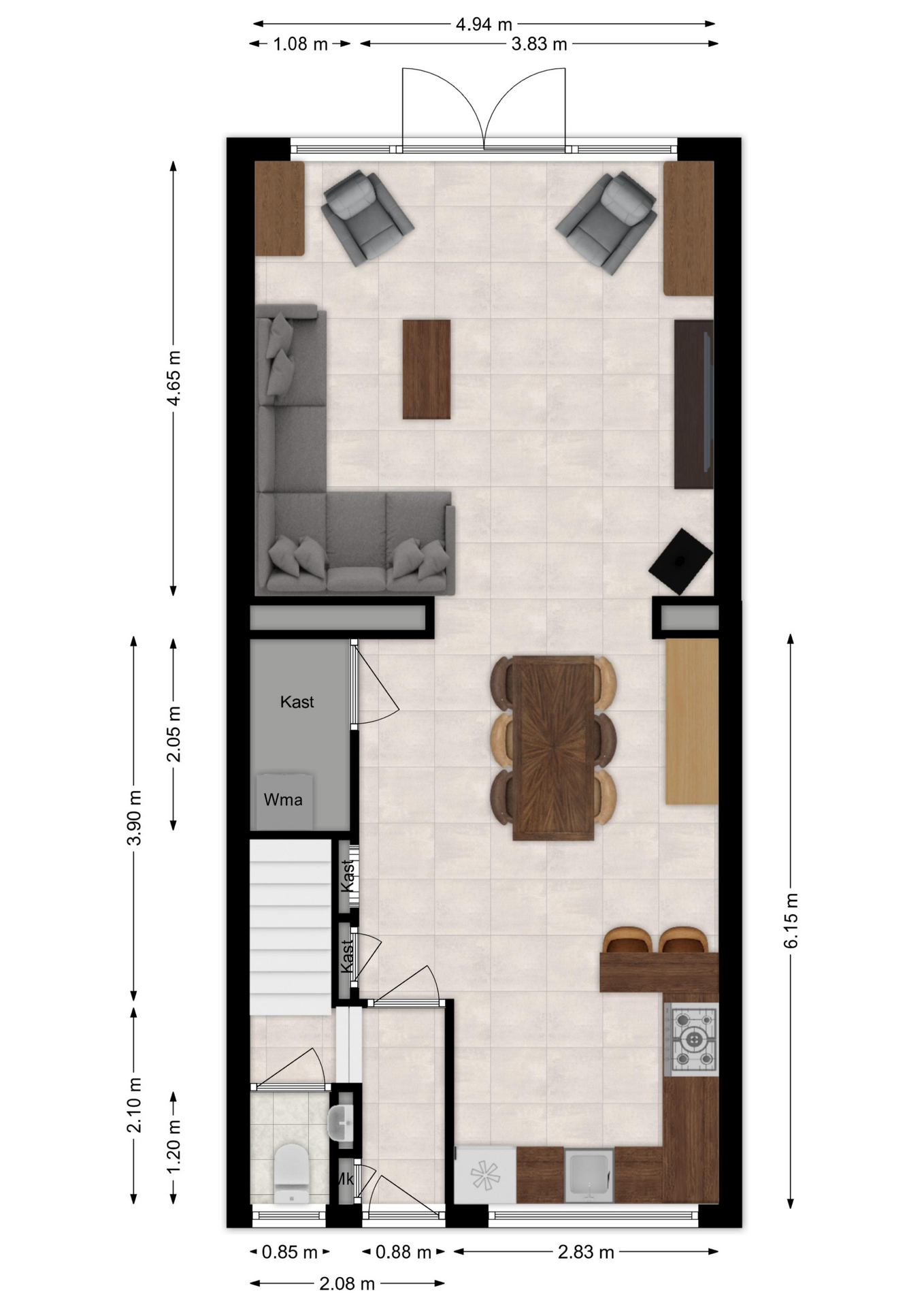 In de ontvangstruimte heeft u de meterkast, toiletruimte, trap naar de eerste verdieping en toegang tot de woonkeuken.