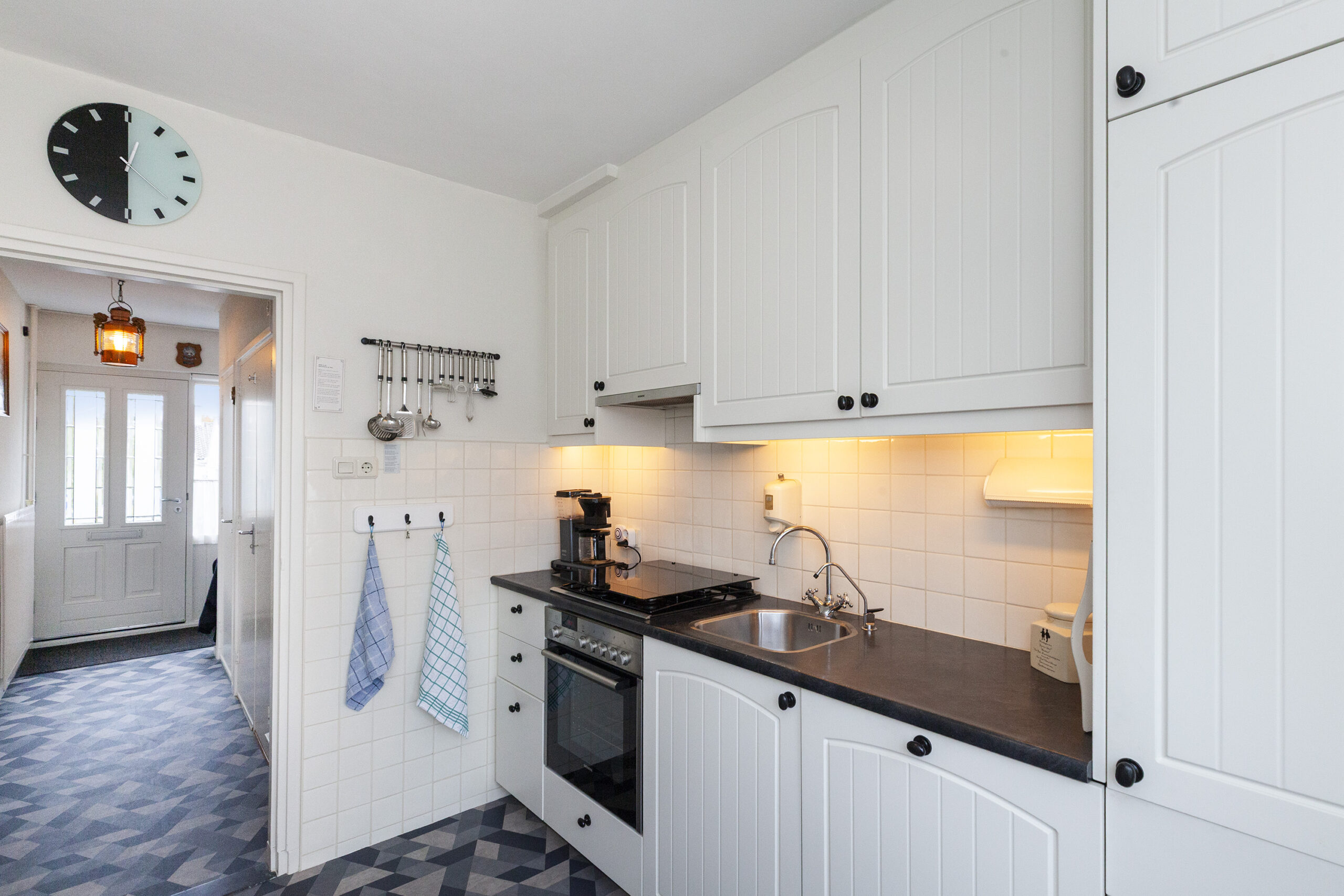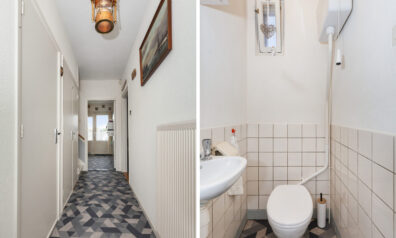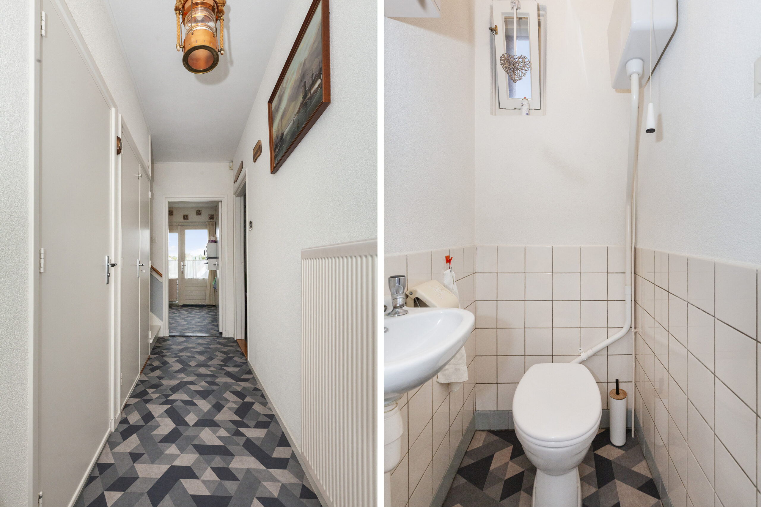 In de lange hal heeft u de meterkast, toiletruimte, toegang tot de woonkamer en de trappen naar de eerste verdieping en het onderhuis. De hal mondt uit in de keuken.