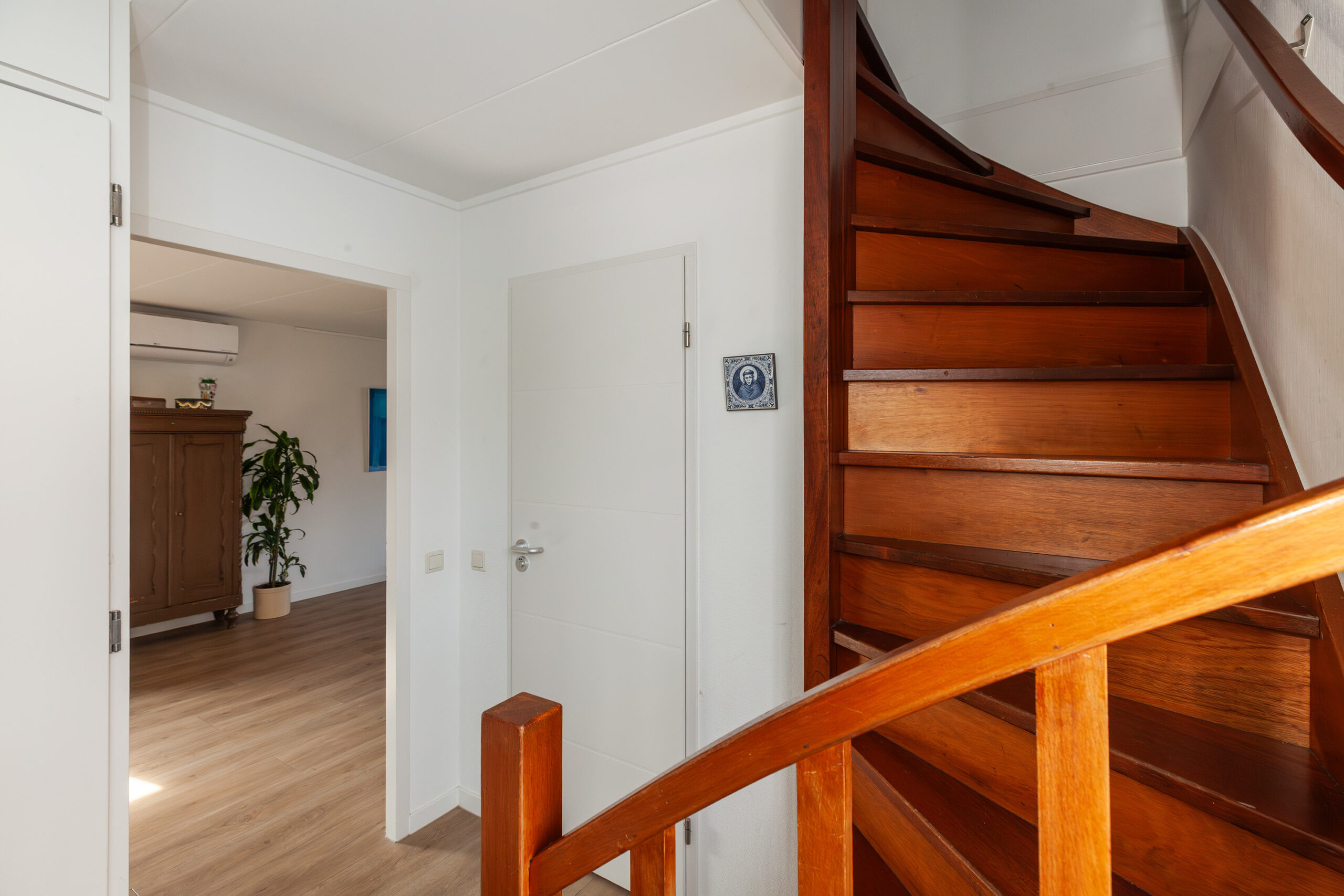 Aan de zijzijde is de voordeur waar u binnenstapt in de hal. Hier is de meterkast, toiletruimte en de trap naar de eerste verdieping. Daarnaast is er toegang tot de woonkamer.