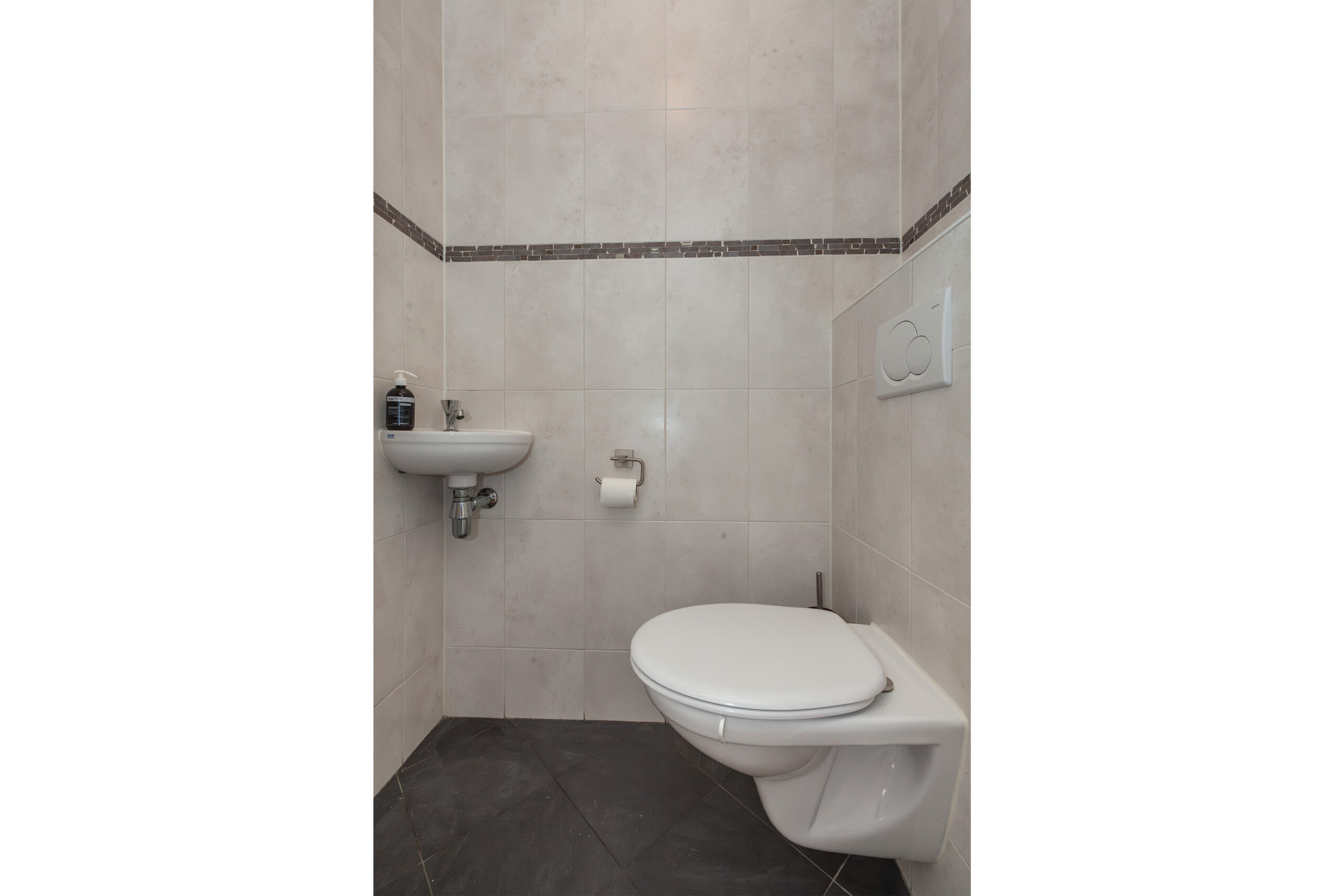 Nette toiletruimte voorzien van een vrijhangend closet en een handwasfonteintje.